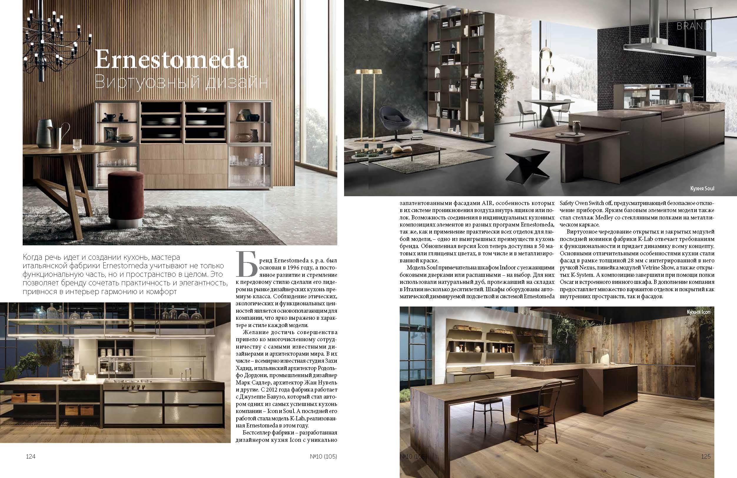 Бестселлер фабрики — кухня Icon, разработанная дизайнером с уникально запатентованными фасадами AIR, особенность которых в их системе проникновения воздуха во внутрь ящиков или полок. Возможность соединения в индивидуальных кухонных композициях элементов из разных программ Ernestomeda, так же, как и применение практически всех отделок для любой модели – одно из выигрышных преимуществ кухонь бренда. Обновленная версия ICON теперь доступна в 50 матовых или глянцевых цветах, в том числе и в металлизированной краске.