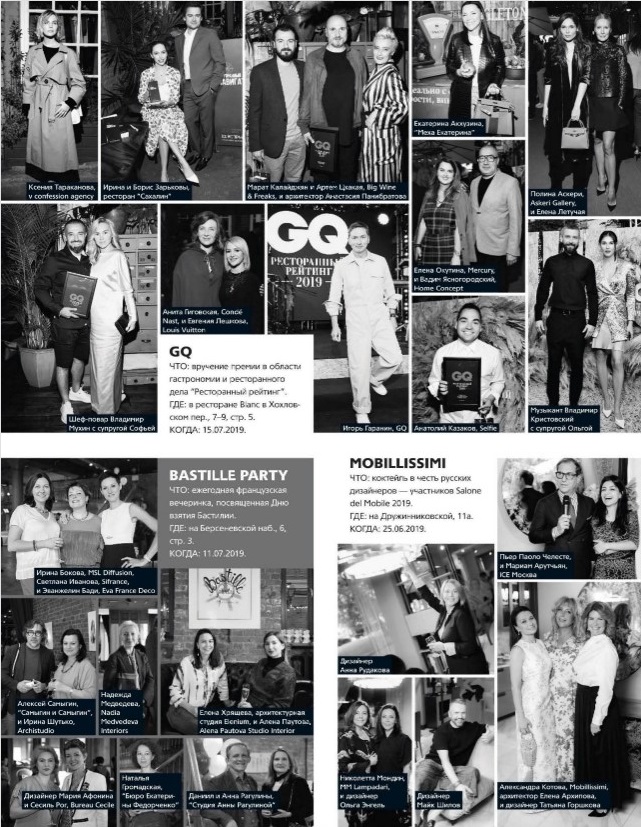 Подборка мебели для кабинетов, в которую вошли кресло Downtown (Poltrona Frau) и столик-табурет Nantes Reze (Cassina); материал об иконах нового тысячелетия, где отмечена настольная лампа Bourgie (Kartell); интерьер дома архитекторов Валентины Моретти и Франческо Матрикарди со светильниками Calypso (Contardi) по дизайну Servomuto; московская квартира дизайнера Екатерины Нечаевой со стульями Kartell; светская хроника, посвященная коктейлю-чествованию русских дизайнеров в Mobillissimi.