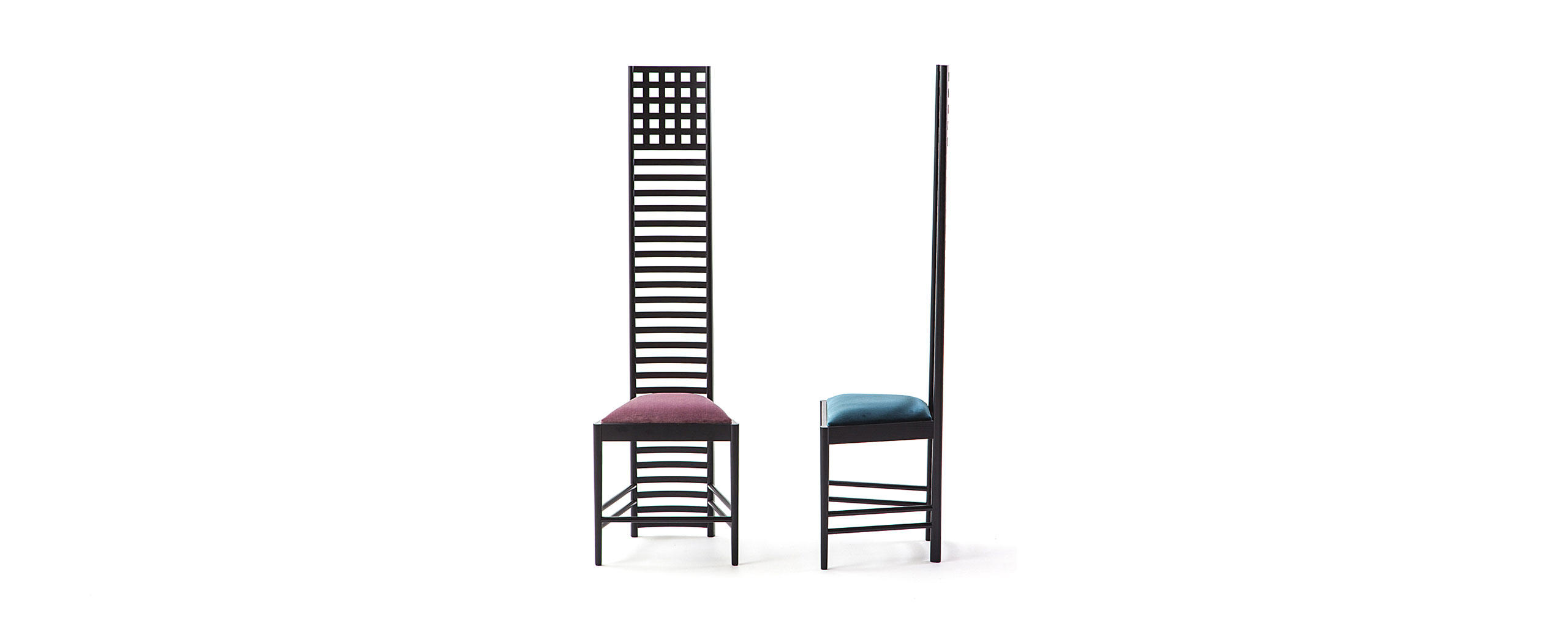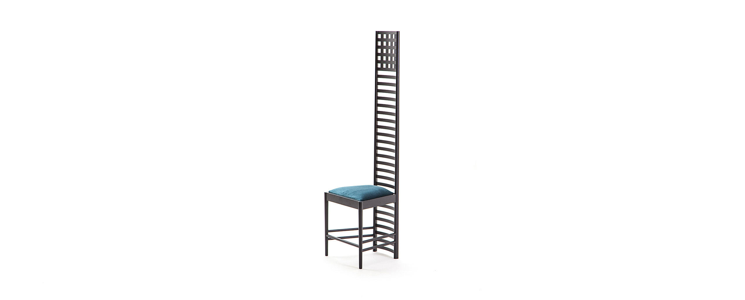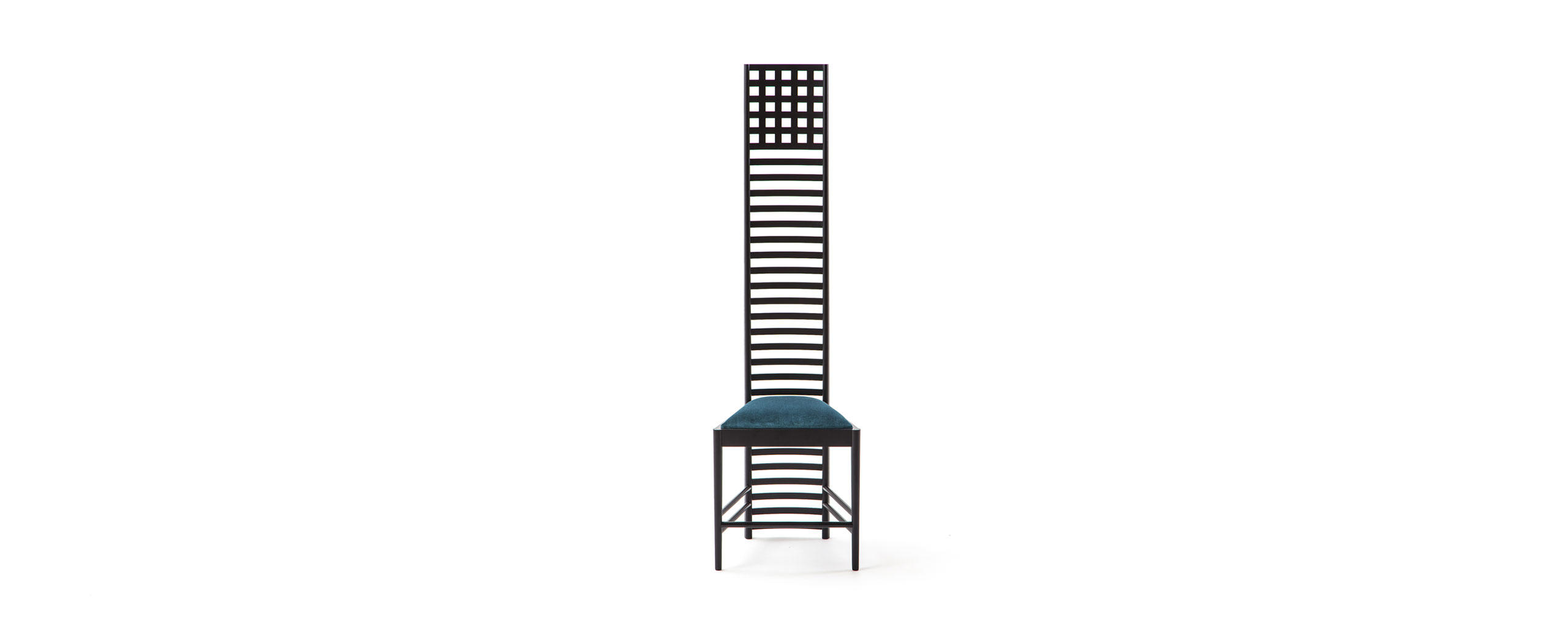 Ladderback chair, ashwood frame stained black.Seat upholstered in a special fabric, either lavender and oil green. The Hill House chair combines figurative and symbolic ideals with a linear geometry, no doubt inspired by the abstract graphics of Japanese design.It is more than a mere chair in that it illustrates Mackintosh’s articulation of space with its high back and rows of horizontal bars, topped with a grid: with slats and straight poles crossed together to create a resistant frame.