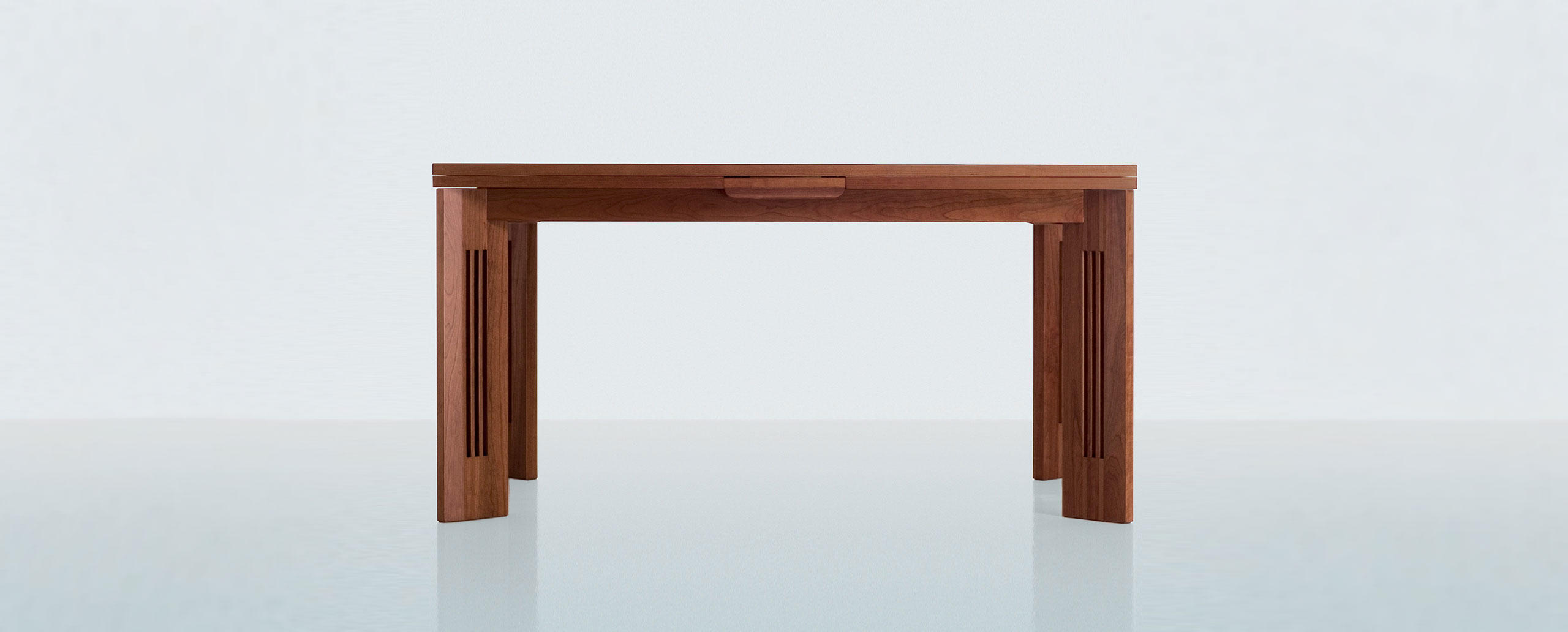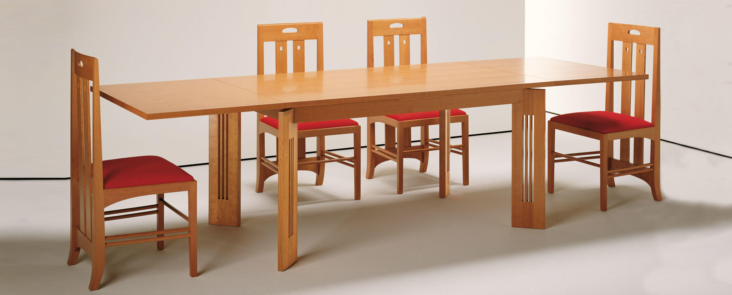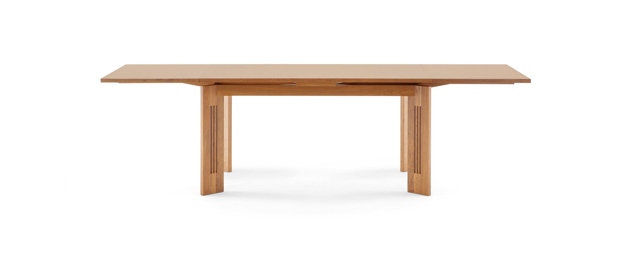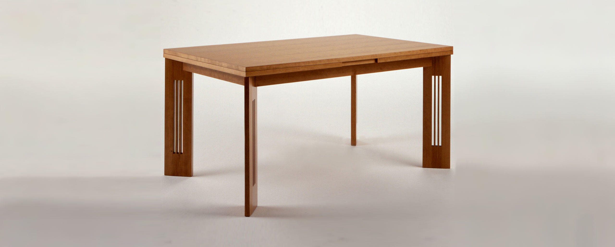 Table in natural cherrywood with extending top.The opening mechanism is positioned under the top and is moved by pulling out a small board located in the middle of the longest side of the top.By lifting the top surface it is possible to extract one or both the underlying extensions.
