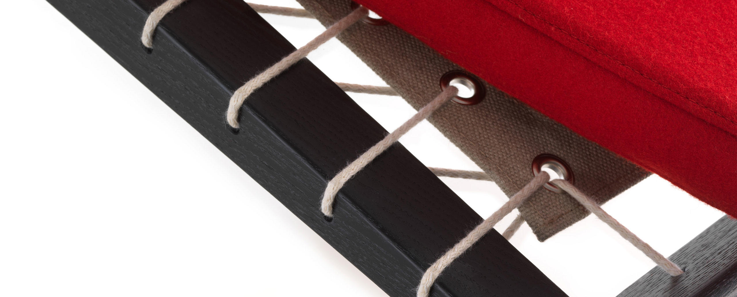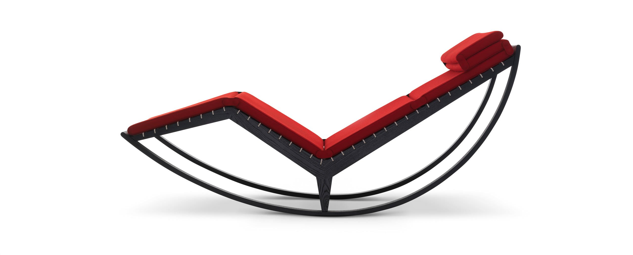 Rocking chaise longue with supporting frame in solid ashwood, either natural or slate coloured, and mahogany stained walnut. The supporting fabric in ecru is attached with cords that produce a graphic motif along the sides. The polyurethane cushioning, covered in fabric or leather, is divided into modules and can be folded over itself.