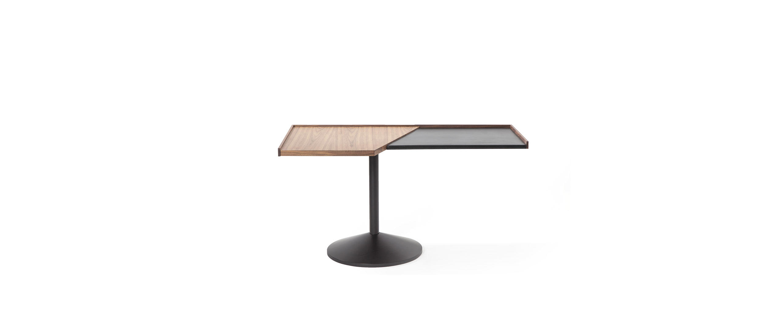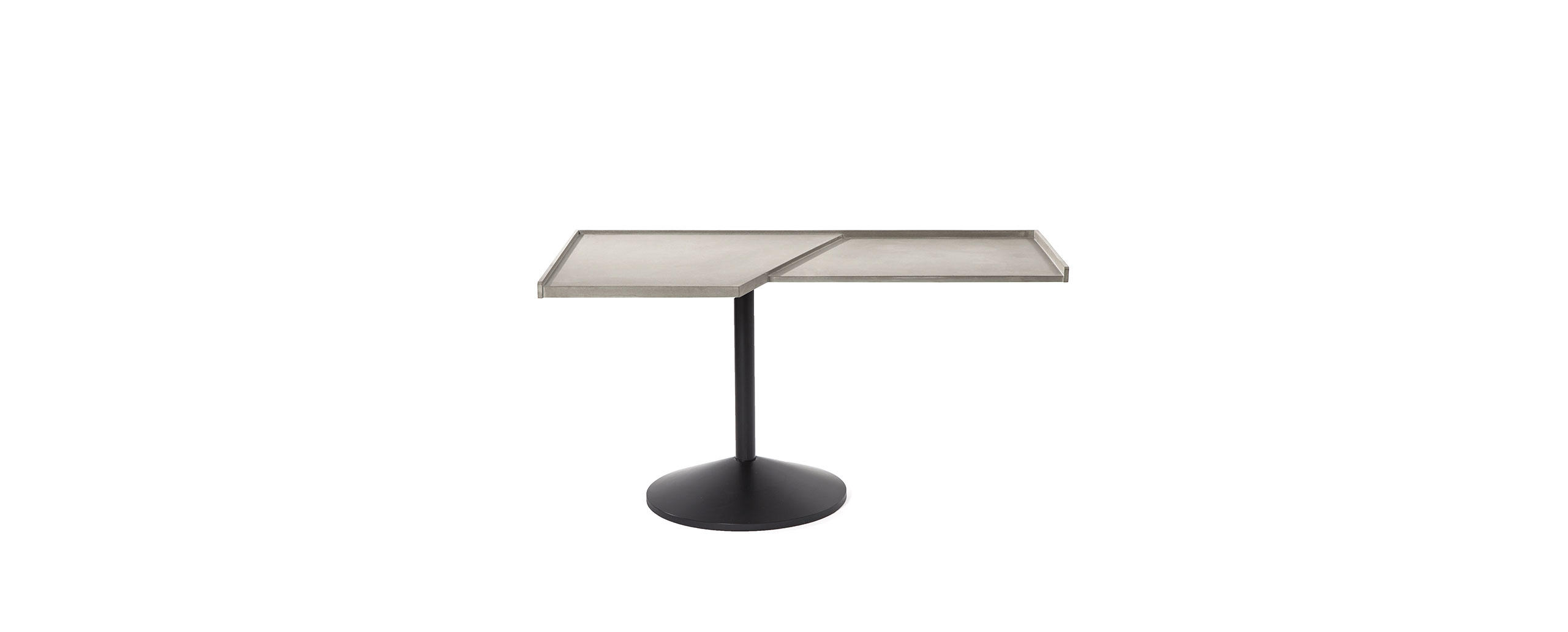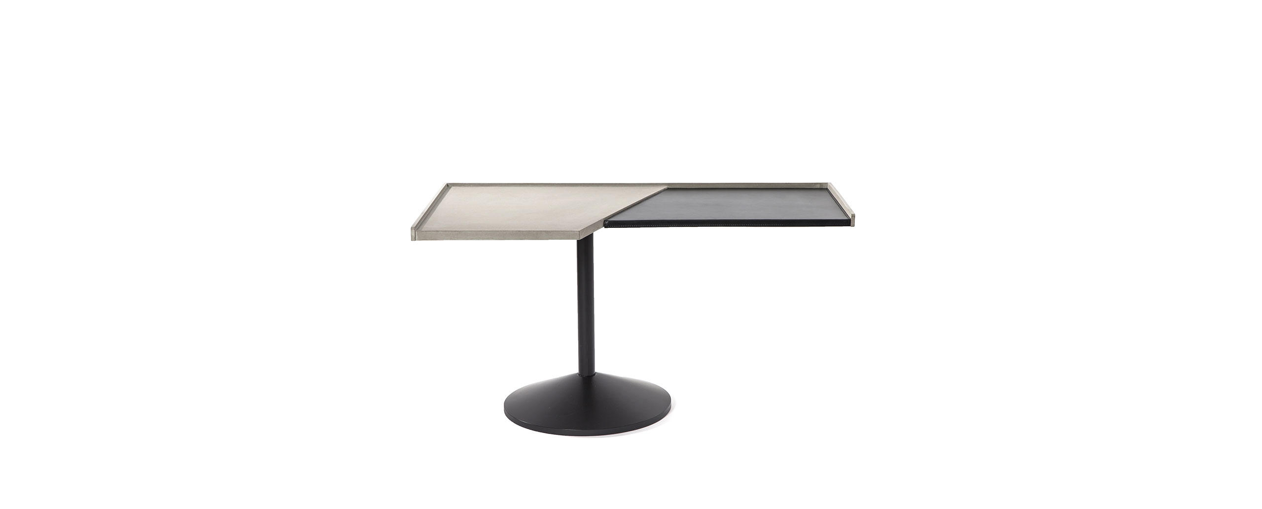 Writing-desk composed of two trapezoidal-shaped surfaces - a main and a side top - of two different depths, supported by a single steel base painted matt black. The surfaces come in three different wooden versions: Canaletto walnut, natural or stained black ashwood, one version in natural cement and a white Carrara marble version. The surfaces have two different thicknesses and a frame that delimits the external edges in the wood and cement versions. For the marble surfaces, the frame only marks the edges of the main desktop. A stiff leather top cover in different colours is also available, for use on the main surface.First created for the Marcenaro home in Genoa, this desk has a single leg and works on the balance created by the inequality of the arms, much like the “Stadera”, or pendulum scales, to which it owes its name.