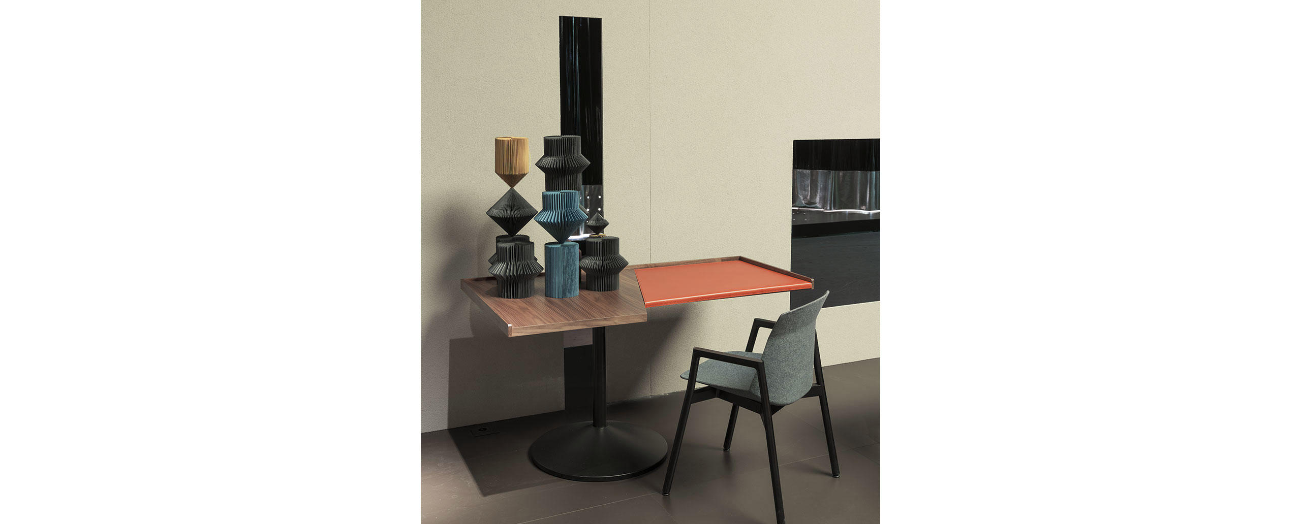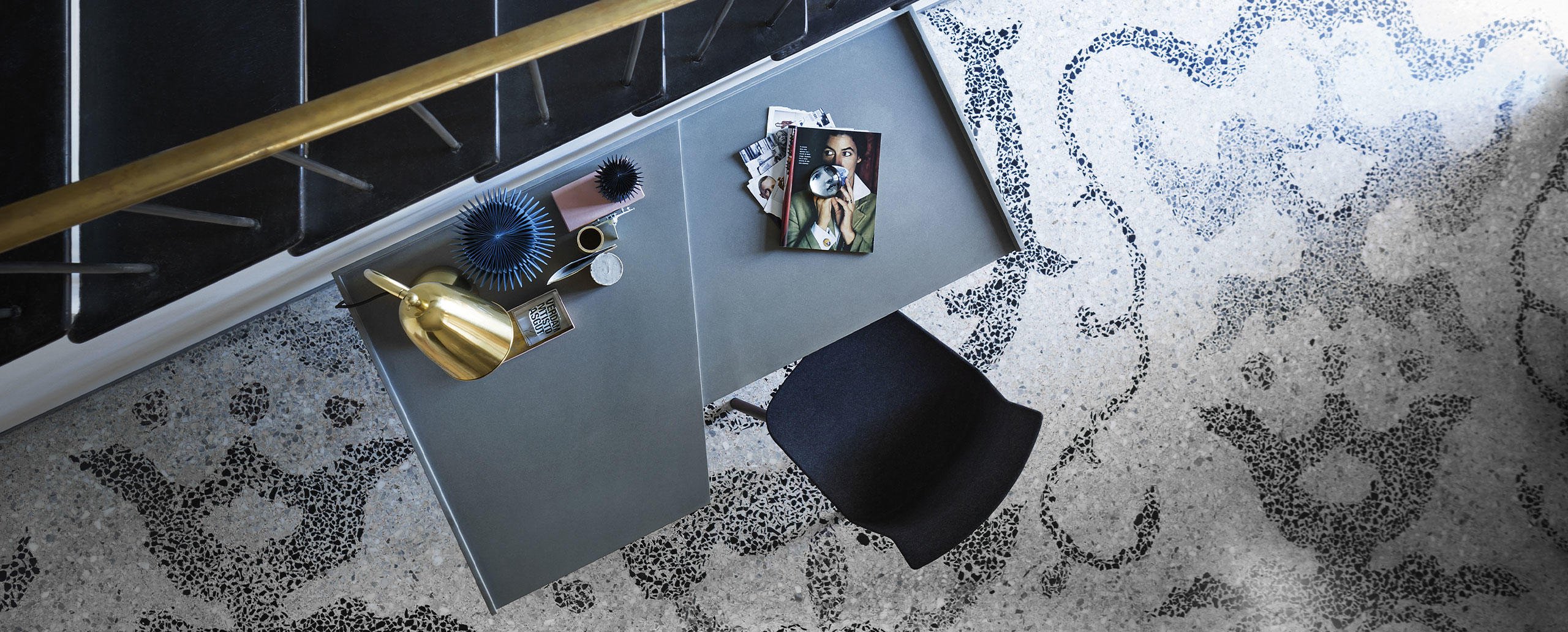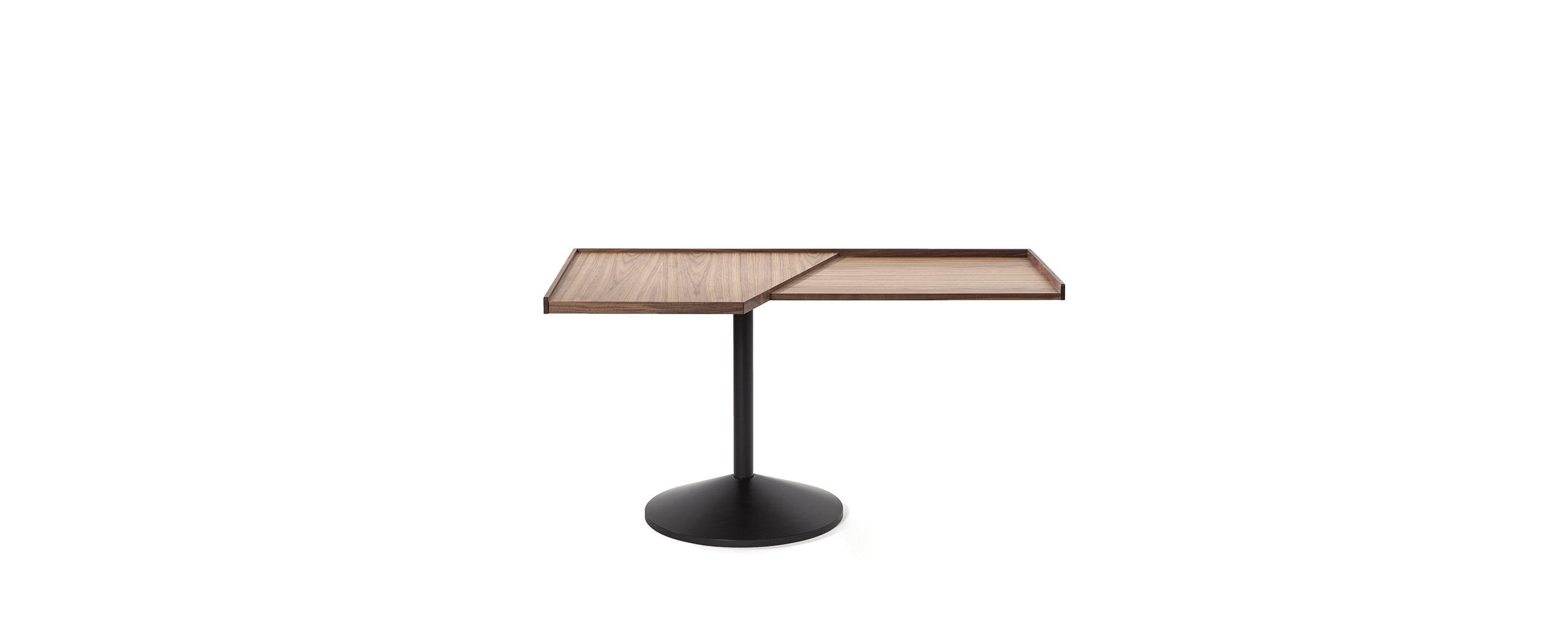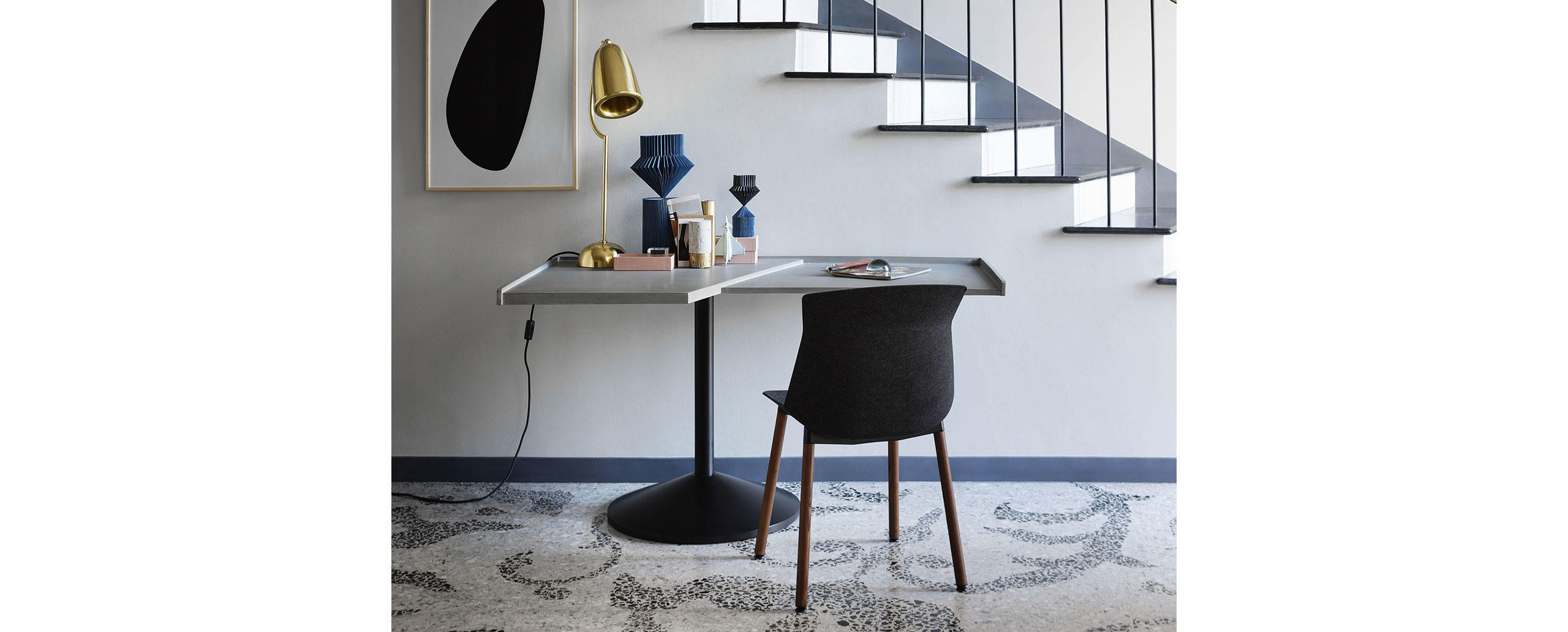 Writing-desk composed of two trapezoidal-shaped surfaces - a main and a side top - of two different depths, supported by a single steel base painted matt black. The surfaces come in three different wooden versions: Canaletto walnut, natural or stained black ashwood, one version in natural cement and a white Carrara marble version. The surfaces have two different thicknesses and a frame that delimits the external edges in the wood and cement versions. For the marble surfaces, the frame only marks the edges of the main desktop. A stiff leather top cover in different colours is also available, for use on the main surface.First created for the Marcenaro home in Genoa, this desk has a single leg and works on the balance created by the inequality of the arms, much like the “Stadera”, or pendulum scales, to which it owes its name.