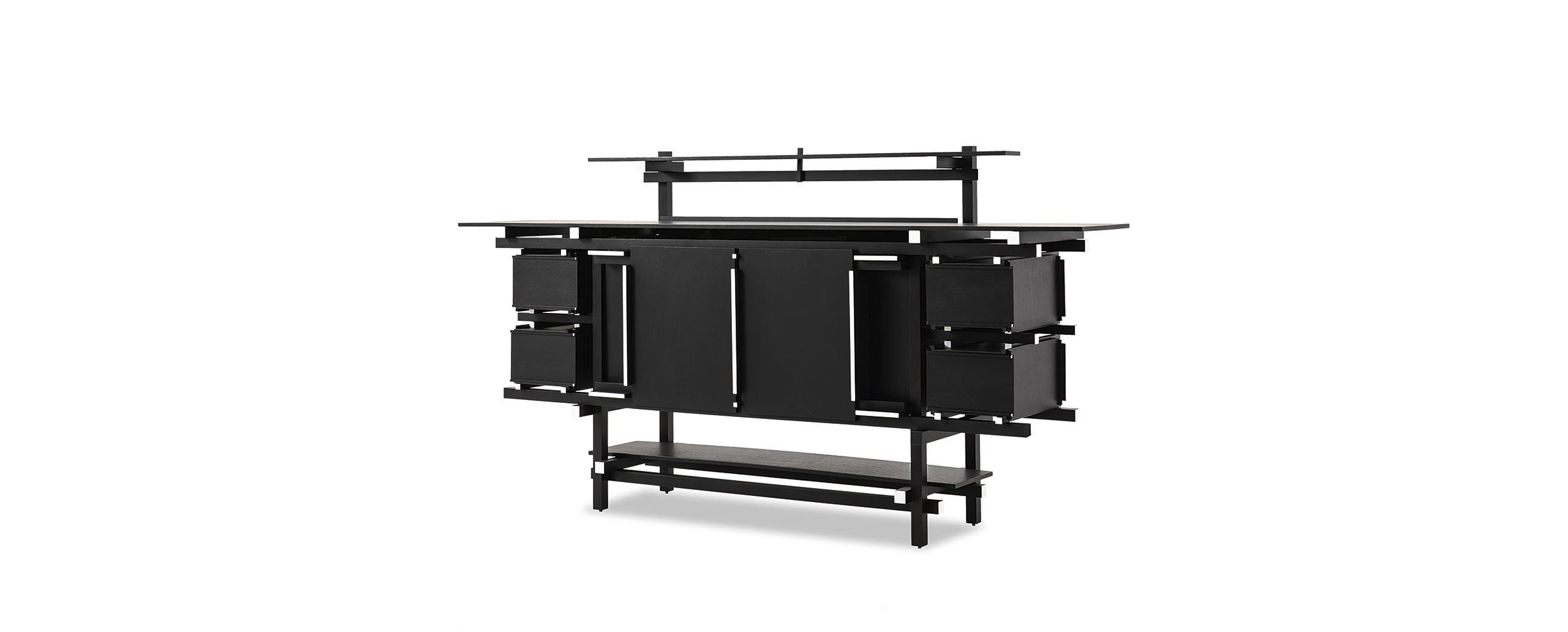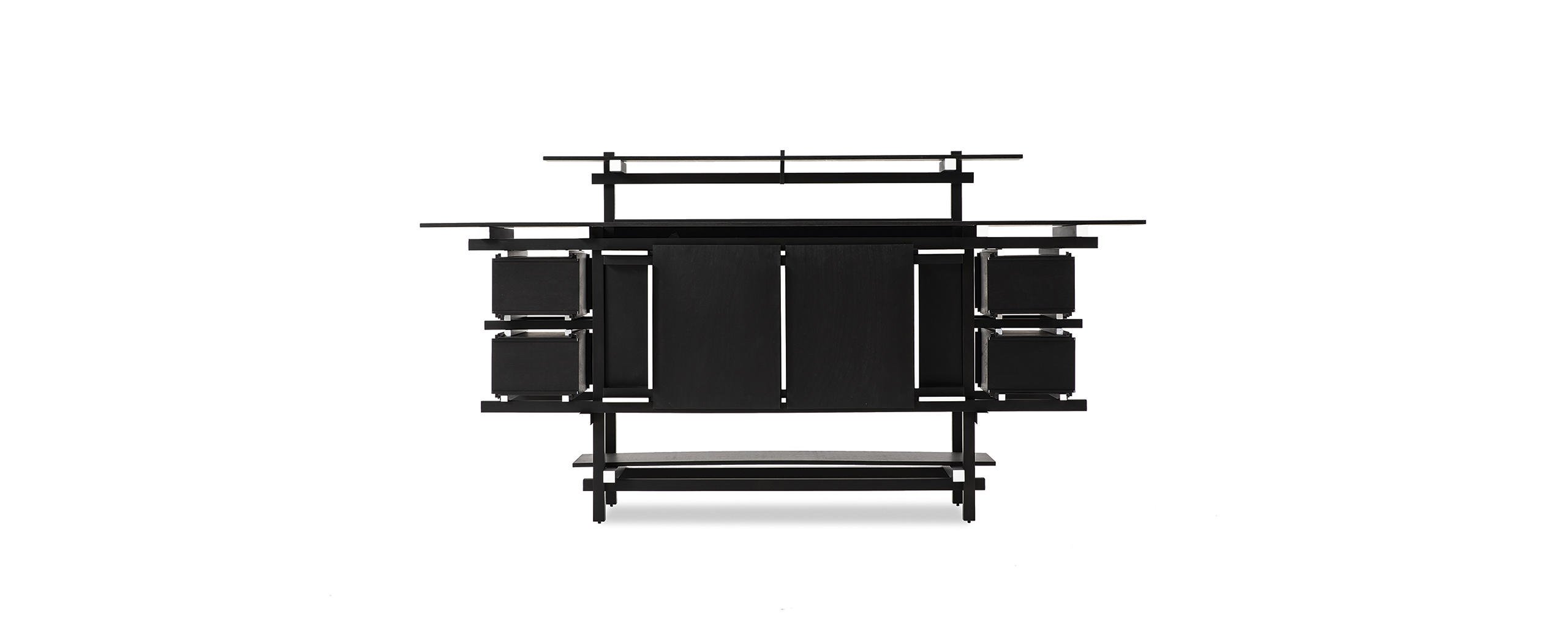 Represents, with the Red and Blue, the essence of the new spatial concept of neoplasticism. A key benchmark in the establishment of the Modern style, this sideboard, designed in 1919, was originally used in the model home designed by J.P Oud for Spargen, Rotterdam, and in various interior design projects, including the project for P.J Elling. The original model was destroyed in a fire and was only rebuilt under the supervision of the designer in 1951 for an exhibition at the Stedelijk Museum in Amsterdam. Today, Cassina produces this storage unit for the first time in its historic carpentry in Meda, in collaboration with the designer’s heirs. The pure lines of the structure create a grid based on a structural core to which surfaces, drawers and storage units are added. The model is influenced by F.L. Wright and the Anglo-Japanese art of E.W. Godwin, particularly as regards the accentuated horizontal surfaces, which are offset by the vertical supports which form a grid from which the storage compartments are hung. The supporting grid, virtually continuous, has contrasting sections of slats that exalt their dynamism towards the exterior.