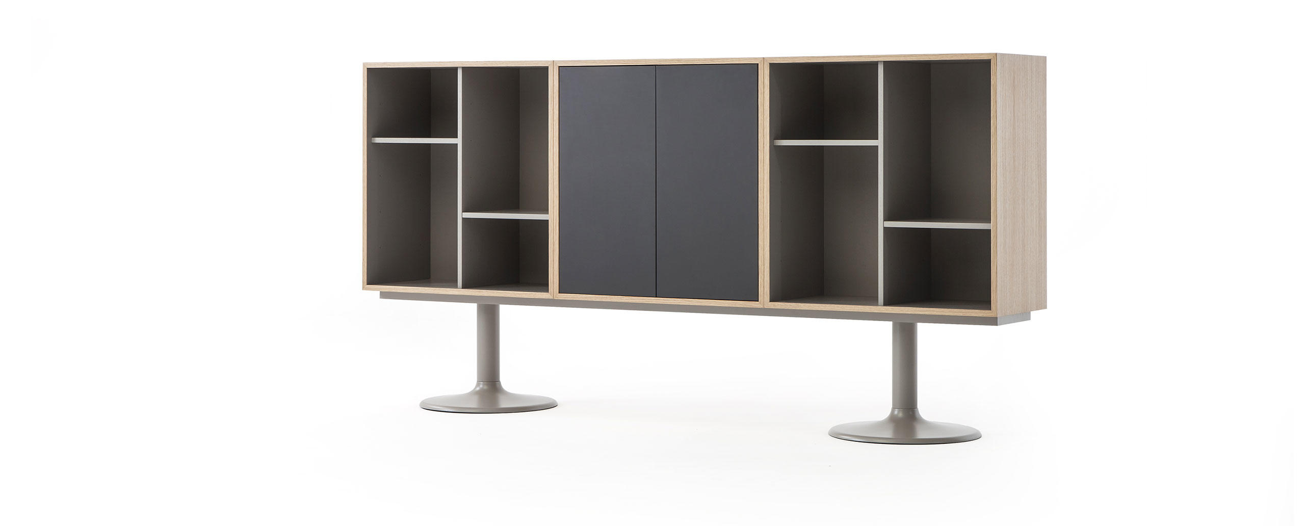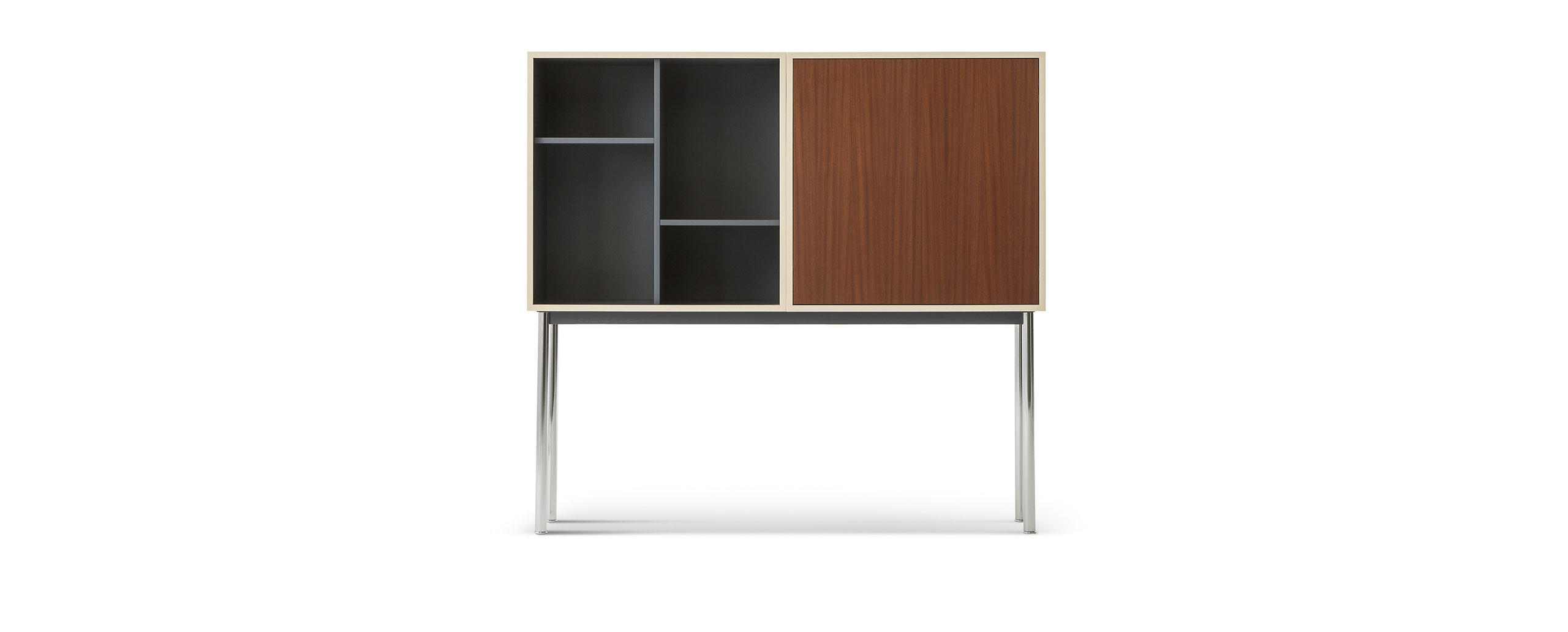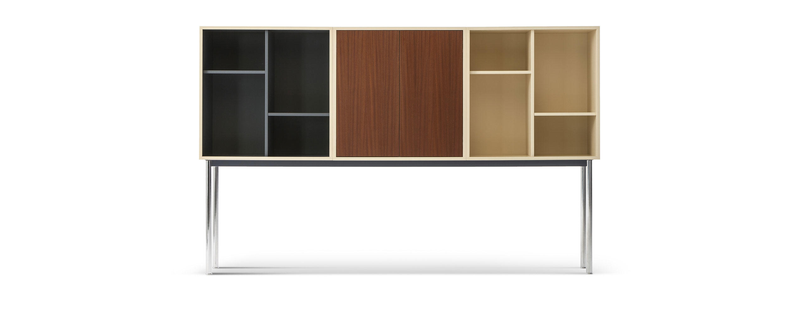 Adapté par Charlotte Perriand en 1984 These historic storage units, in the collection since 1978, are relaunched with a new look emphasising the features that make this unique furniture with its timeless design versatile, functional and perfect for the organisation of space.The units come in 18 fixed compositions, in two- and three-module versions and in three different types: with open compartments, with two hinged doors or with lover folding door.The wide range of colours—for the bases, external and internal parts of the modules and the doors—makes interesting, elegant solutions possible.