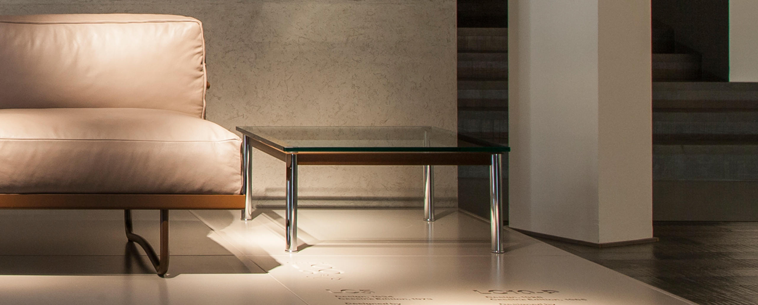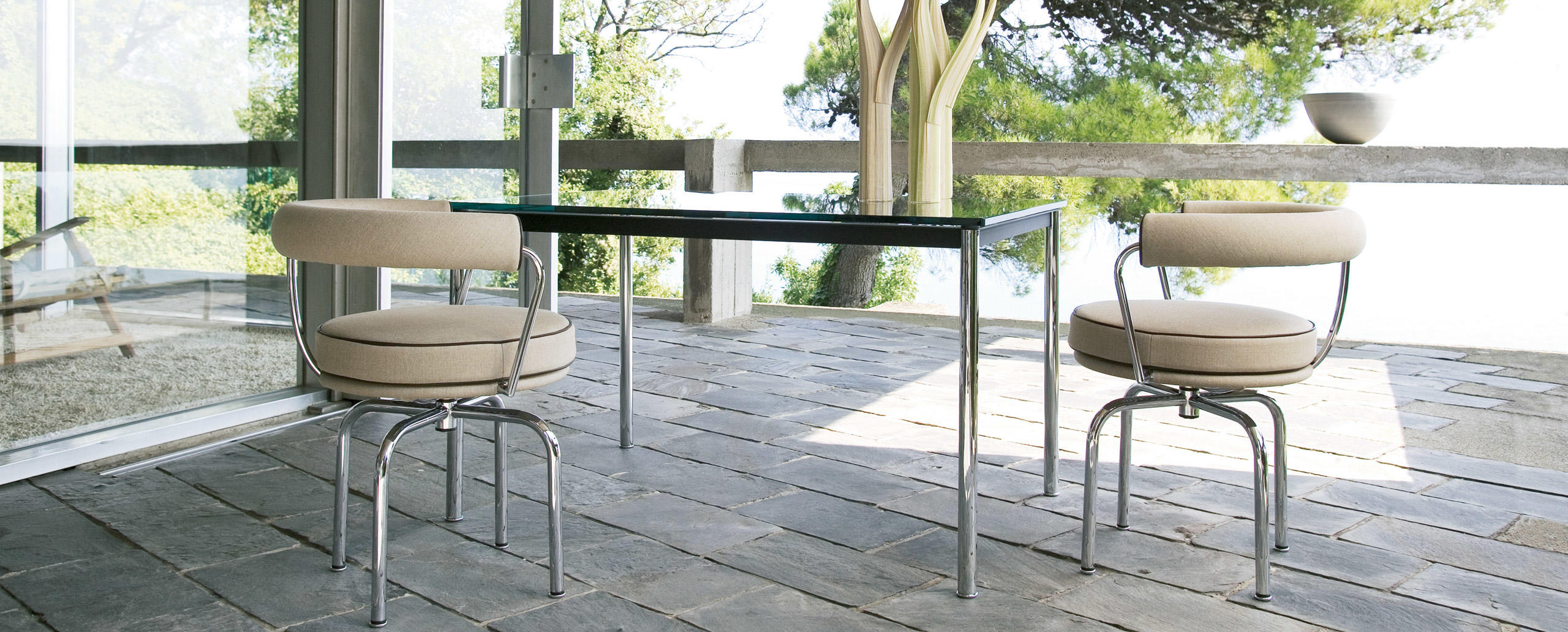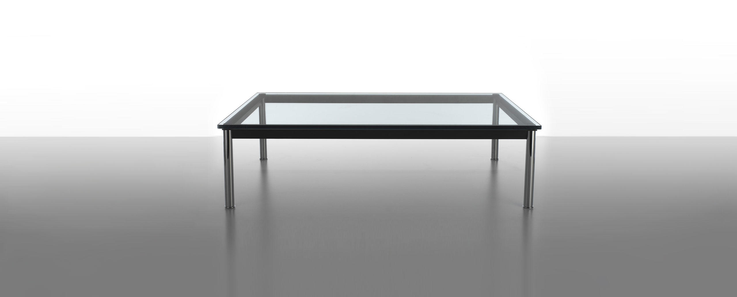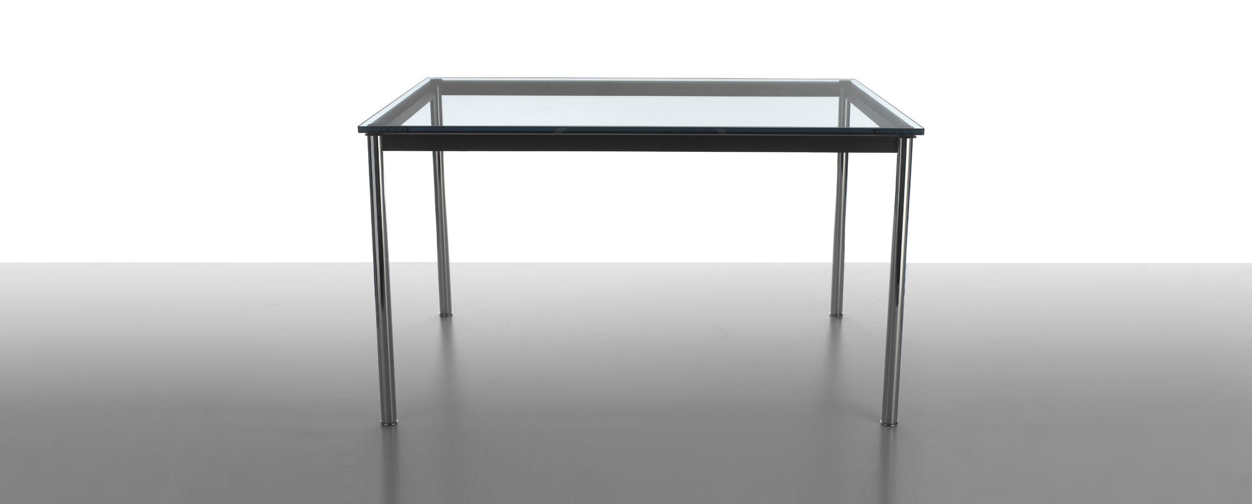 Adapté par Charlotte Perriand en 1984 Table glace claire pieds chromés barre laquée A series of tables and low tables, square and rectangular, with legs in chrome steel and painted frame available in the different colours of Le Corbusier’s original palette.The original table, designed by three masters of architecture, was presented as a desk in “l’Equipement Intérieur d’une Habitation” at the Salon d’Automne in Paris in 1929.Charlotte Perriand revisited the original design in 1984, producing solutions capable of offering different versions that meet today’s practical requirements. Cassina reissued it in 1985.