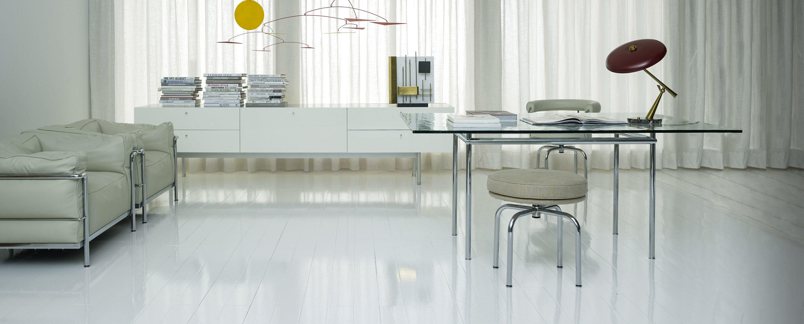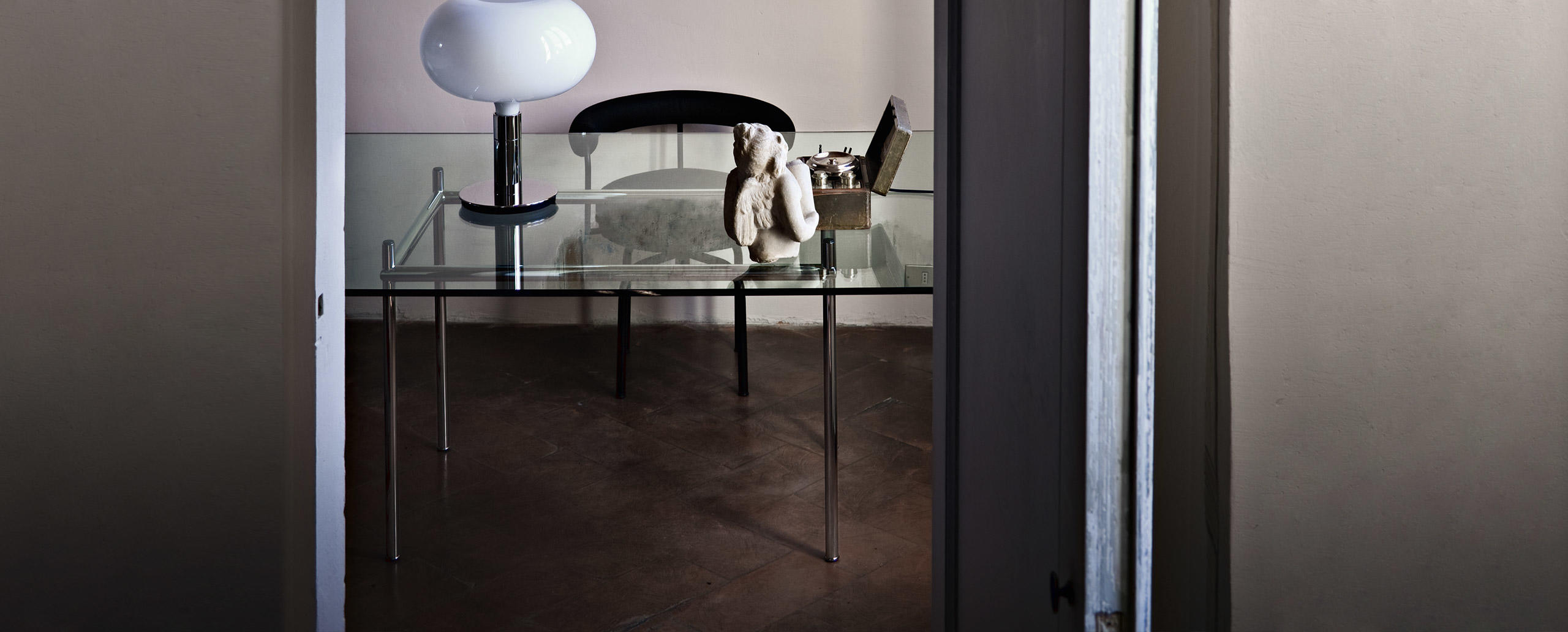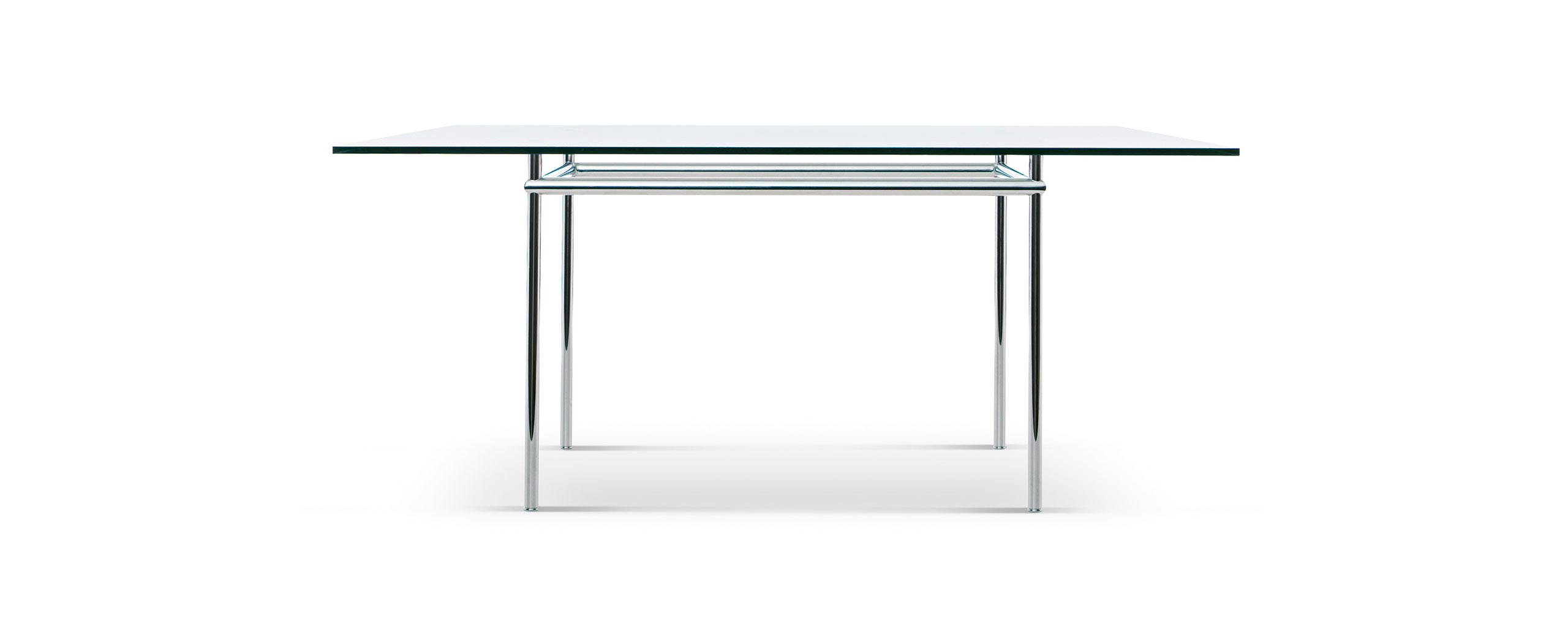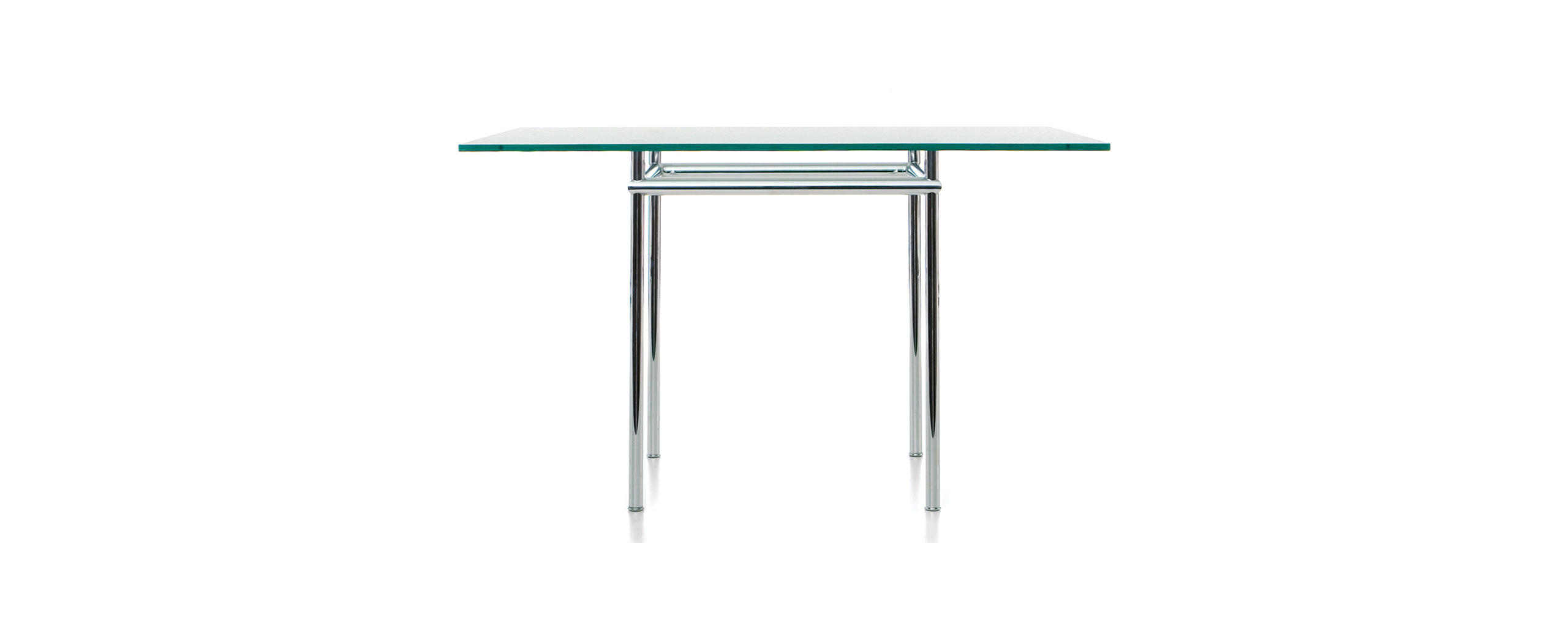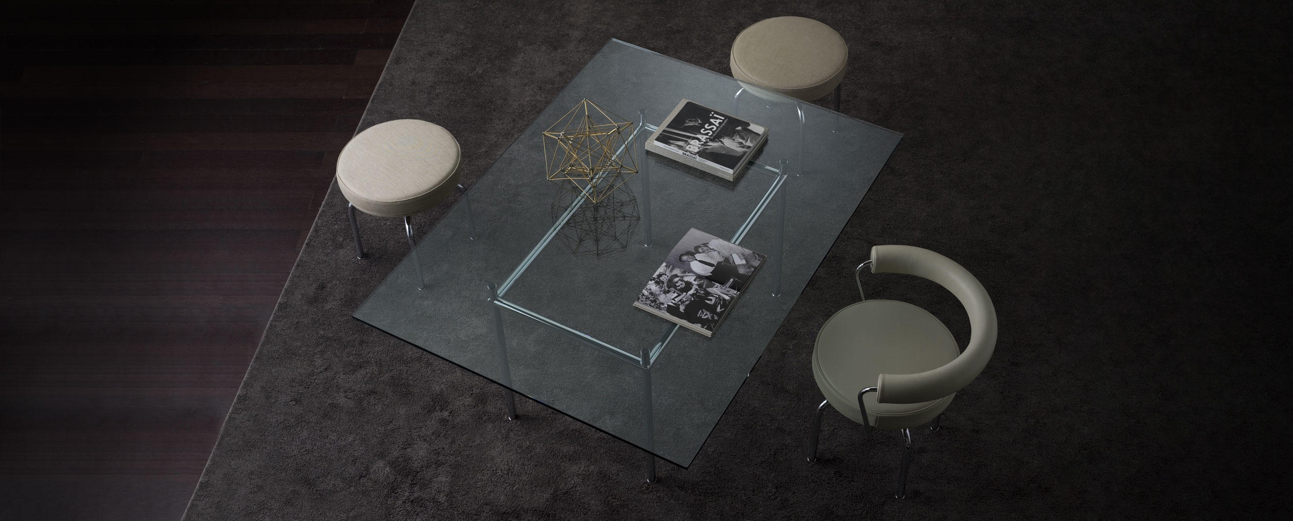 Table La Roche Rectangular tables with polished trivalent chrome plated (CR3) or semigloss light blue enamel steel frame. Tops in Canaletto walnut, natural oak or black-stained oak thickn. 50 mm (2”), crystal or textured glass thickn. 15 mm (0.6”). With table-tops coming in two dimensions, 120x80 and 160x120, the tables designed for the La Roche house in 1925 bring solutions for diff erent positions. Their spirit lies in the contrast of the proportions between the two elements; the support and what is supported, that is to say the pedestal of minimum width for its vertical shape, and the top of maximum width for its horizontal dimension. The contrast of the dimensional relationship, stressed also in other Le Corbusier designs, confirms the presence of plastic-poetic merit, prevalently articulated in the inversion of the roles of the elements; the vibrating lightness of the table-top against its real weight, and the comforting stability of the pedestal against its visual delicacy.