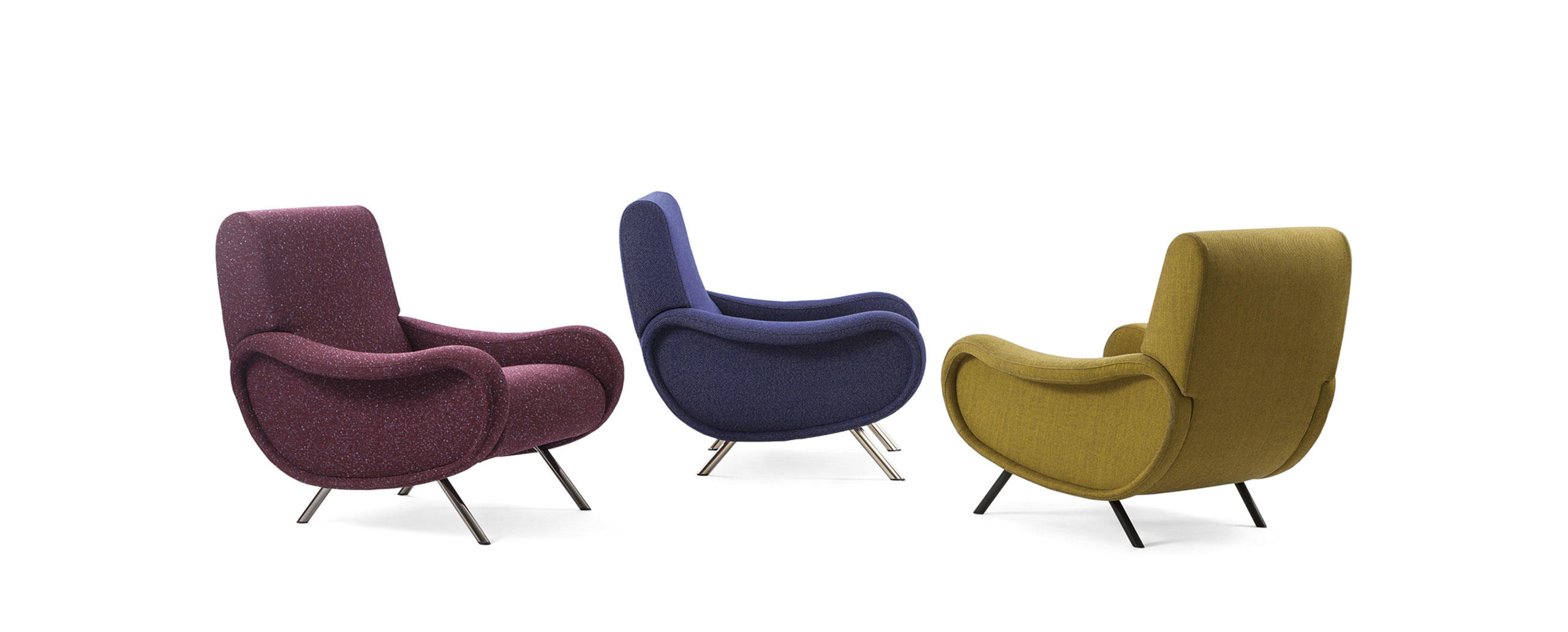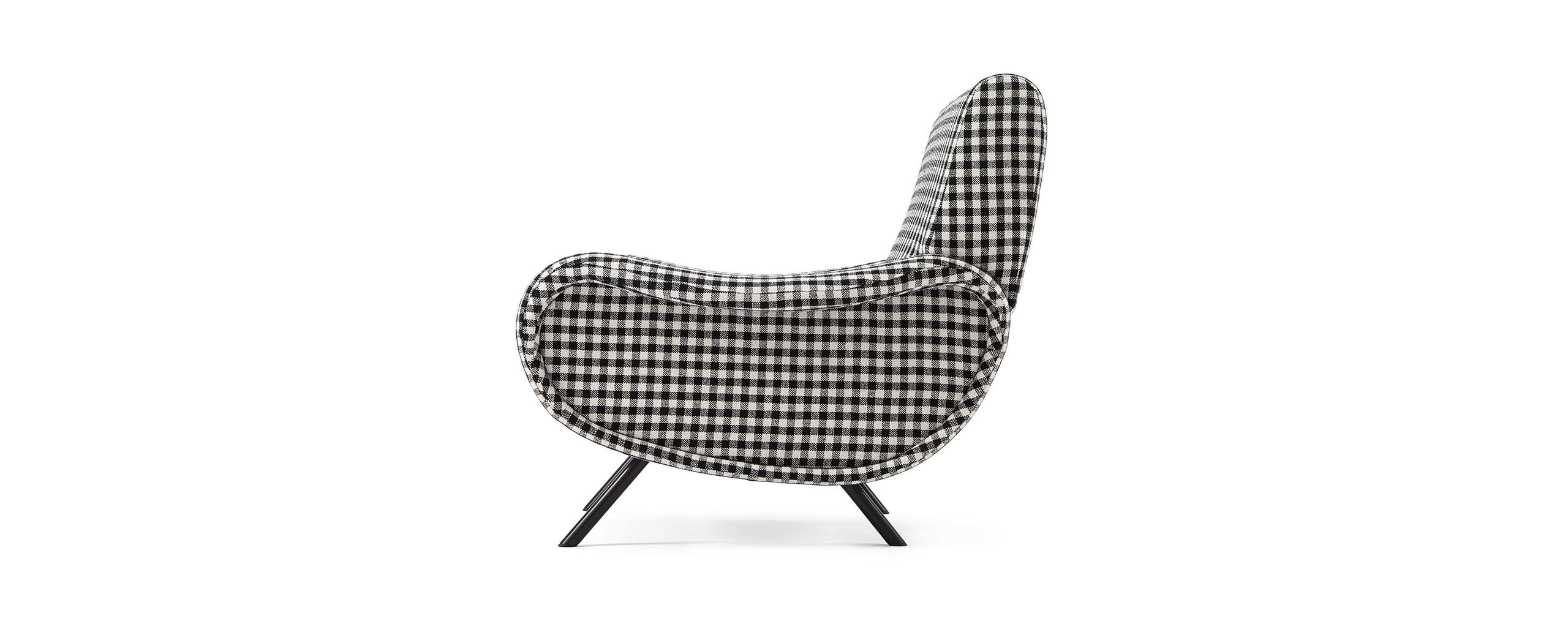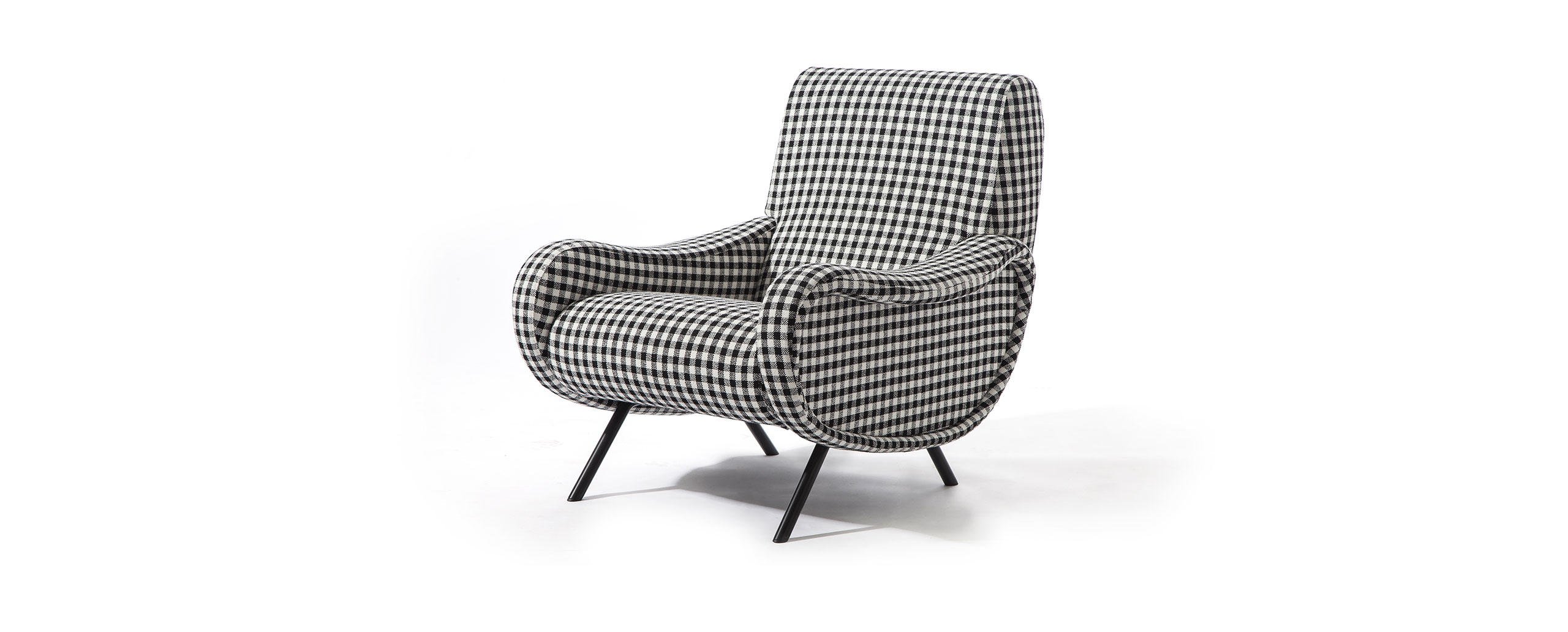 Designed in 1951 by Marco Zanuso for Arflex, the Lady armchair won the gold medal at the IX Milan Triennale in the same year. The armchair stands as a modern icon, the fruit of innovation that turned the traditional manufacturing technique for making armchairs and sofas on its head, with each part manufactured separately and then assembled; seat, backrests and sides with diff erent padding densities depending on the support required by the pressure exerted by the body.Today, the look of the Lady armchair has been made even more contemporary by a new selection of fabrics designed by Raf Simons and introduced to Cassina’s Everest collection.