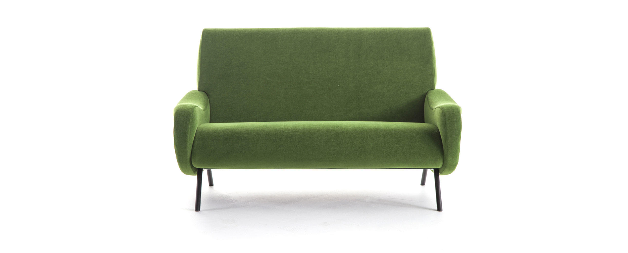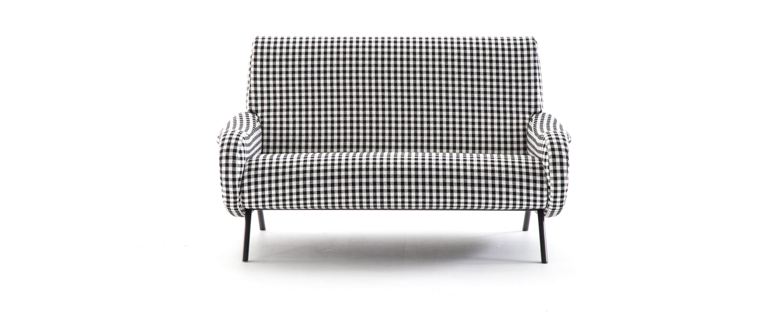 The armchair is now flanked by a two-seater sofa ith the same production features as the armchair: seat, backrests and sides are manufactured separately with diff erent padding densities depending on the support required by the pressure exerted by the body. As for the armchair, a wide range of fabric upholsteries and an iconic edition with black and white check upholstery and feet painted in matt basalt are available.