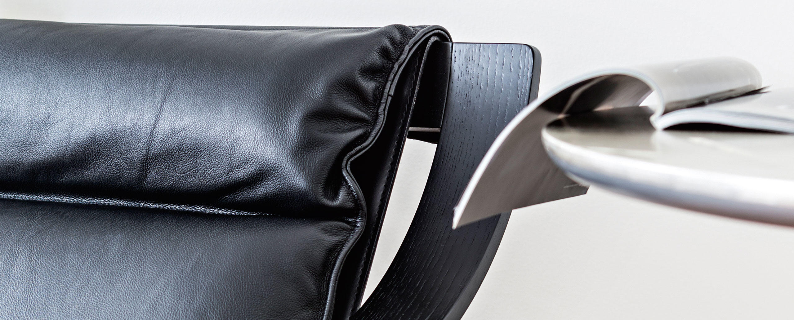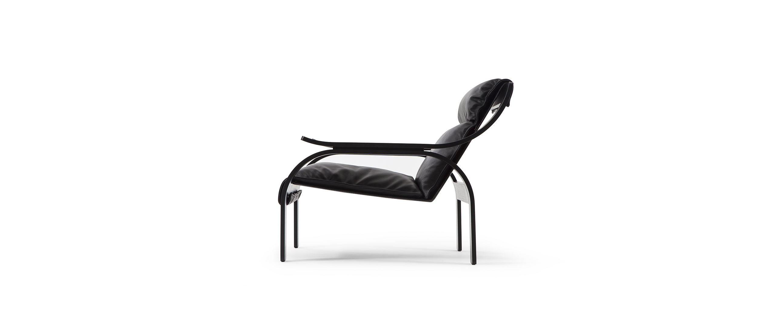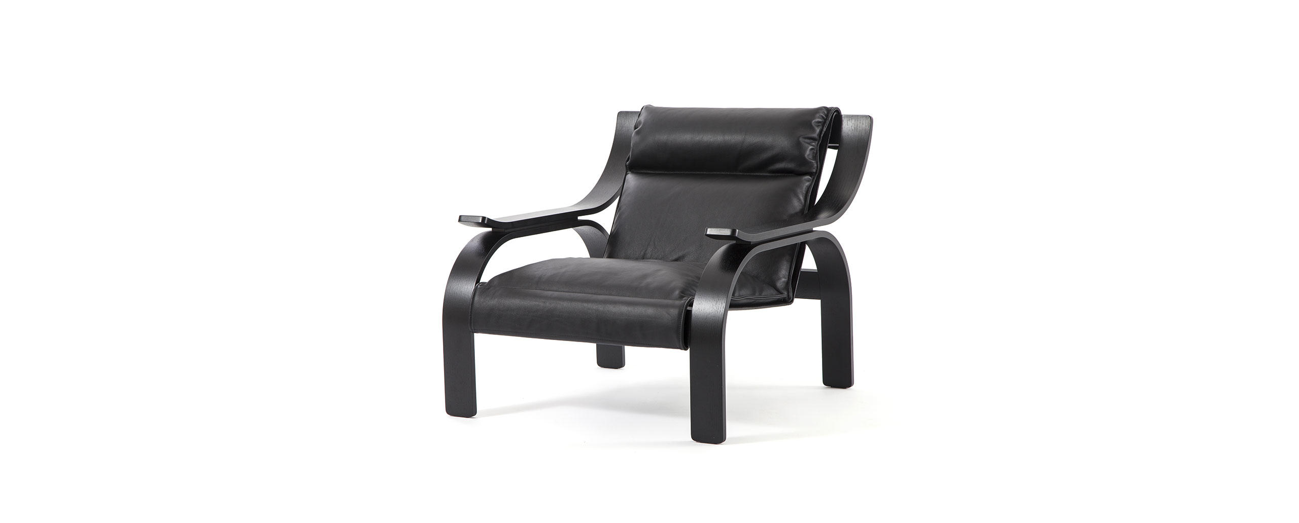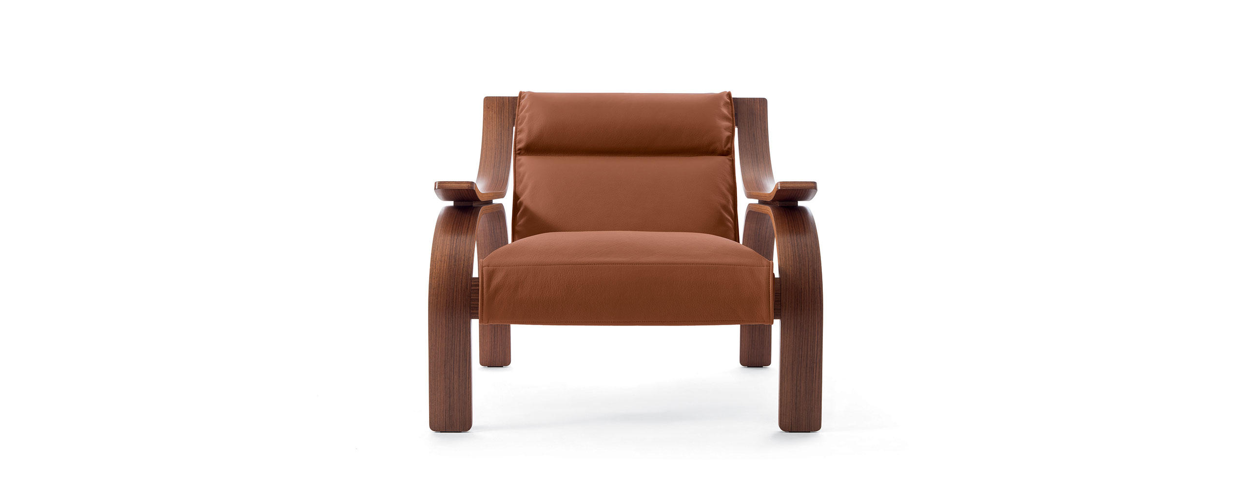 Armchair, designed by Marco Zanuso for Arflex, composed of three distinct elements: curved wood frame, supporting panel and cushions. The wooden frame is made of curved plywood with black stained ashwood or walnut stained walnut finishes. The supporting panel is composed of an internal steel panel upholstered in non-removable stiff leather available in a wide range of colours. Non-removable cushion covers in fabric or leather. The armchair is also available in an iconic edition featuring a walnut stained walnut wooden frame, supporting panel in beige-coloured stiff leather and cushions covered in natural leather ZZ (pelle naturale ZZ) 13Z361 tobacco.In 1964, in a more technologically advanced context, with Woodline, Zanuso developed the supporting frame, which in this version is in wood (there is also a metal-framed similar version).It is designed from a matrix based on the geometry of the circle, which gives the entire structure a classic formal precision.