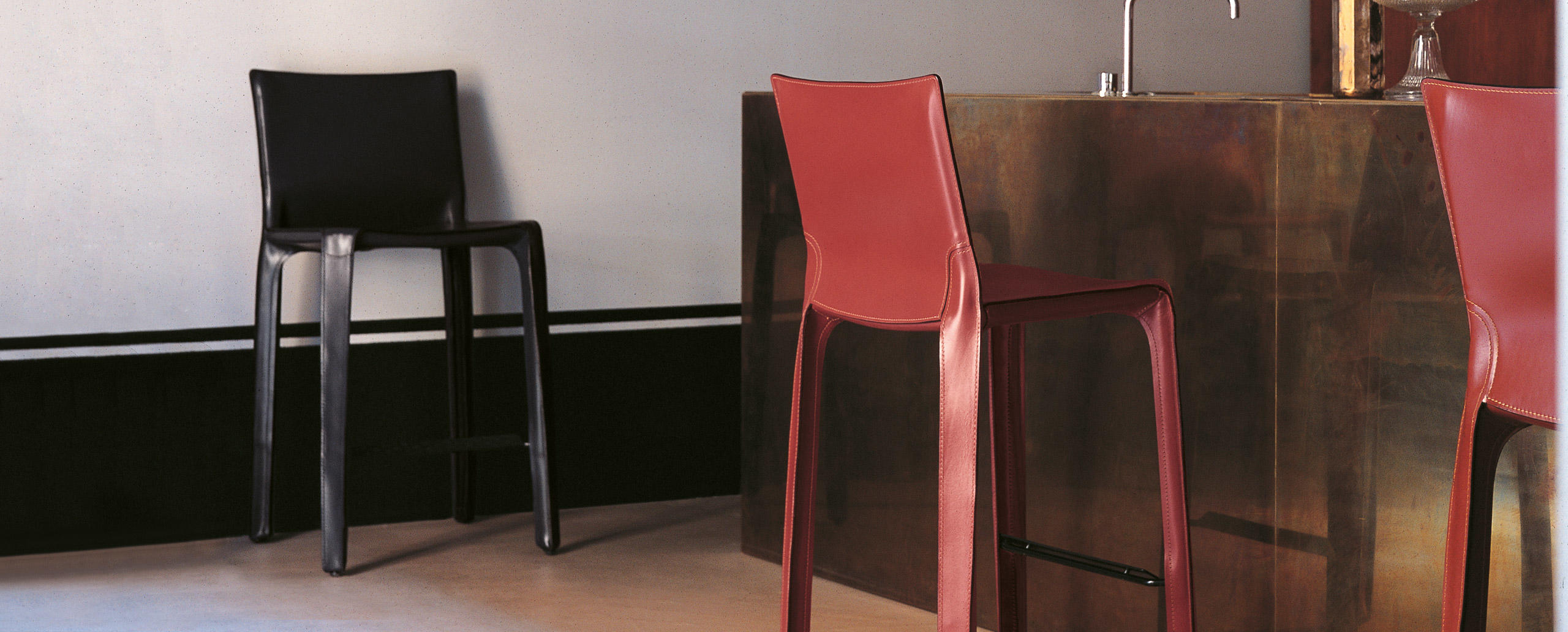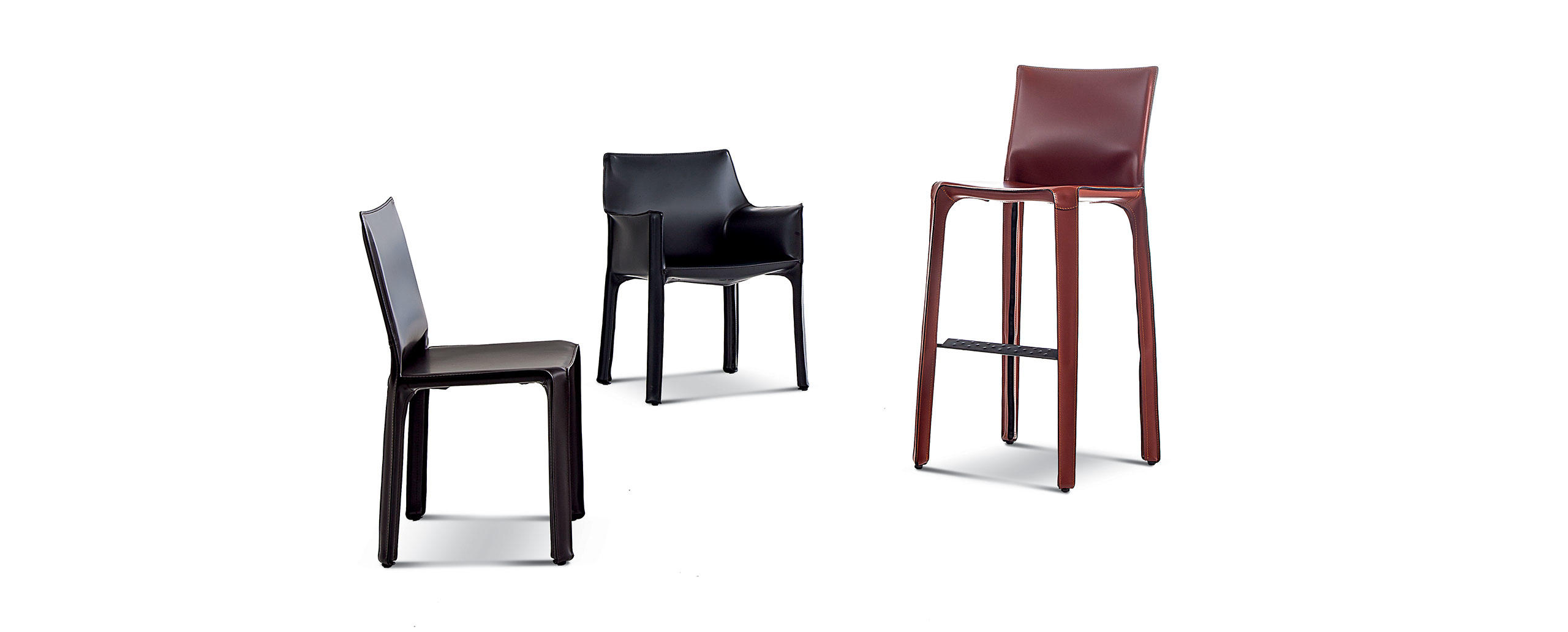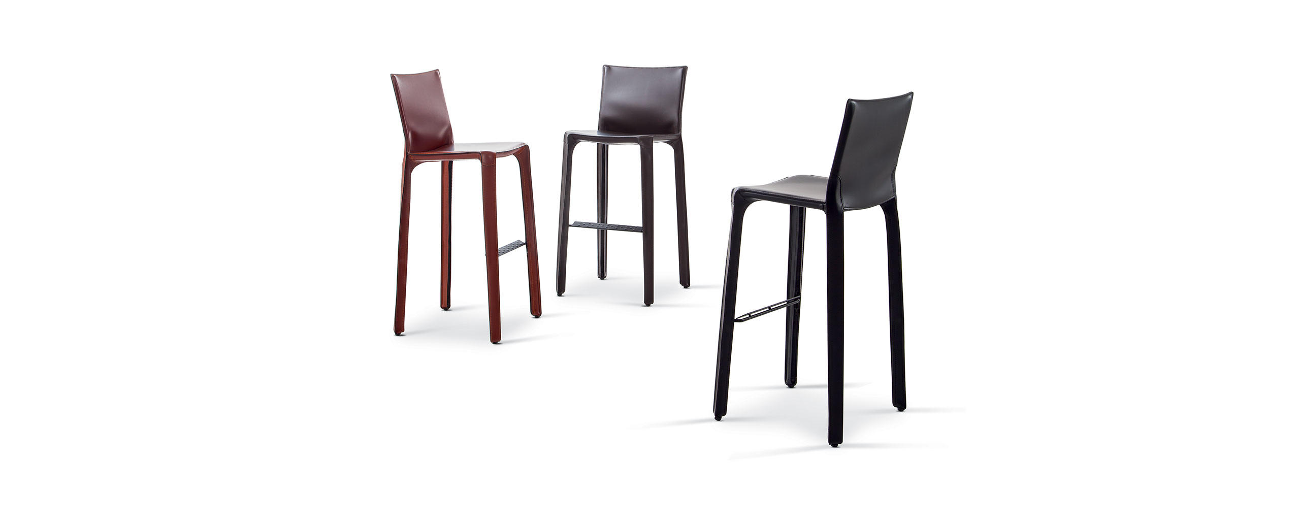 “This was a new kind of chair, constructed totally out of leather, much cloned since then.” Thus Mario Bellini describes Cab, a best-seller that he designed in the 1970s, which is now a signature piece in Cassina’s I Contemporanei collection. Cab was the first-ever chair to feature a free-standing leather structure, inspired by how our skin fits over our skeleton. The pieces are sewn together only when their outer edges have been trimmed to ensure a perfect fit. Once assembled, the cover is attached to the chair’s steel skeleton and held in place by means of a zipper fastening, as in a bespoke tailored garment. From the original model over the years a family of stools has also been developed, now available in 2 heights and in the new slim version with a lower backrest, making it more versatile for home use and also for public areas and bars, all also available in the new Plus leathers. in pure aniline.