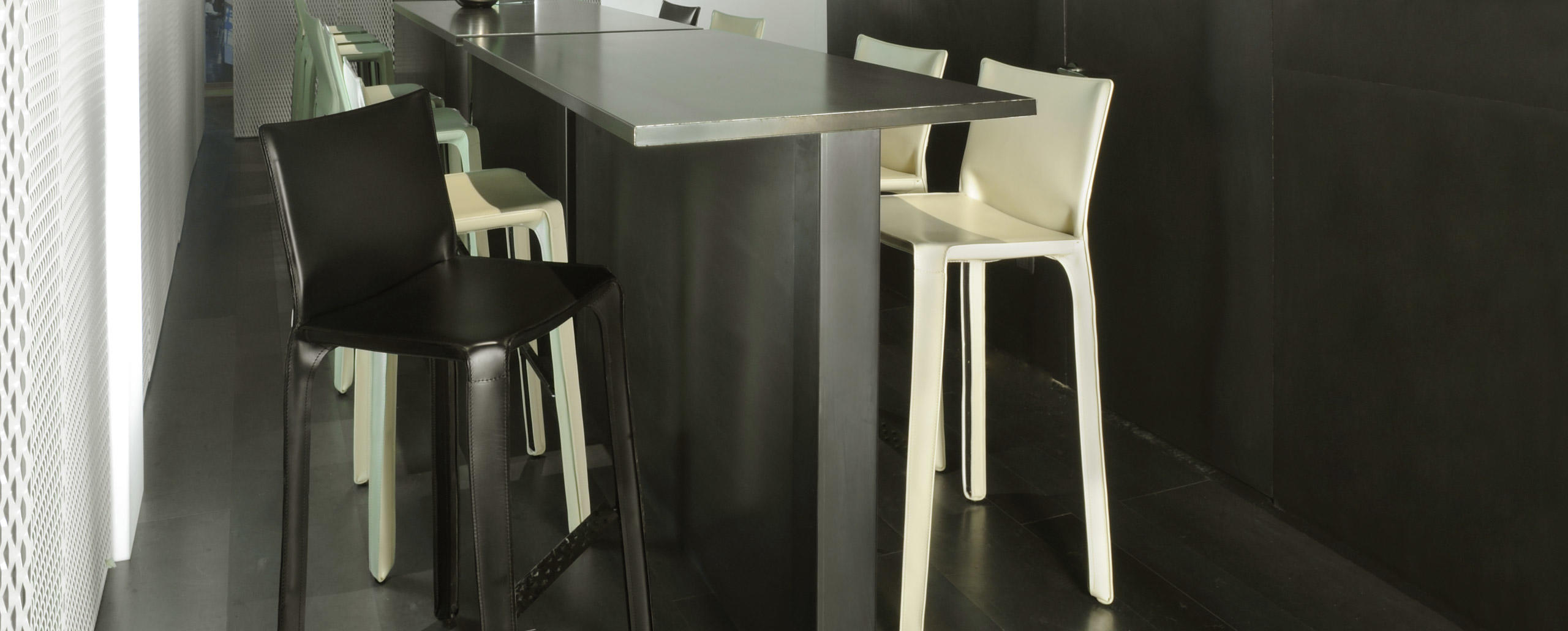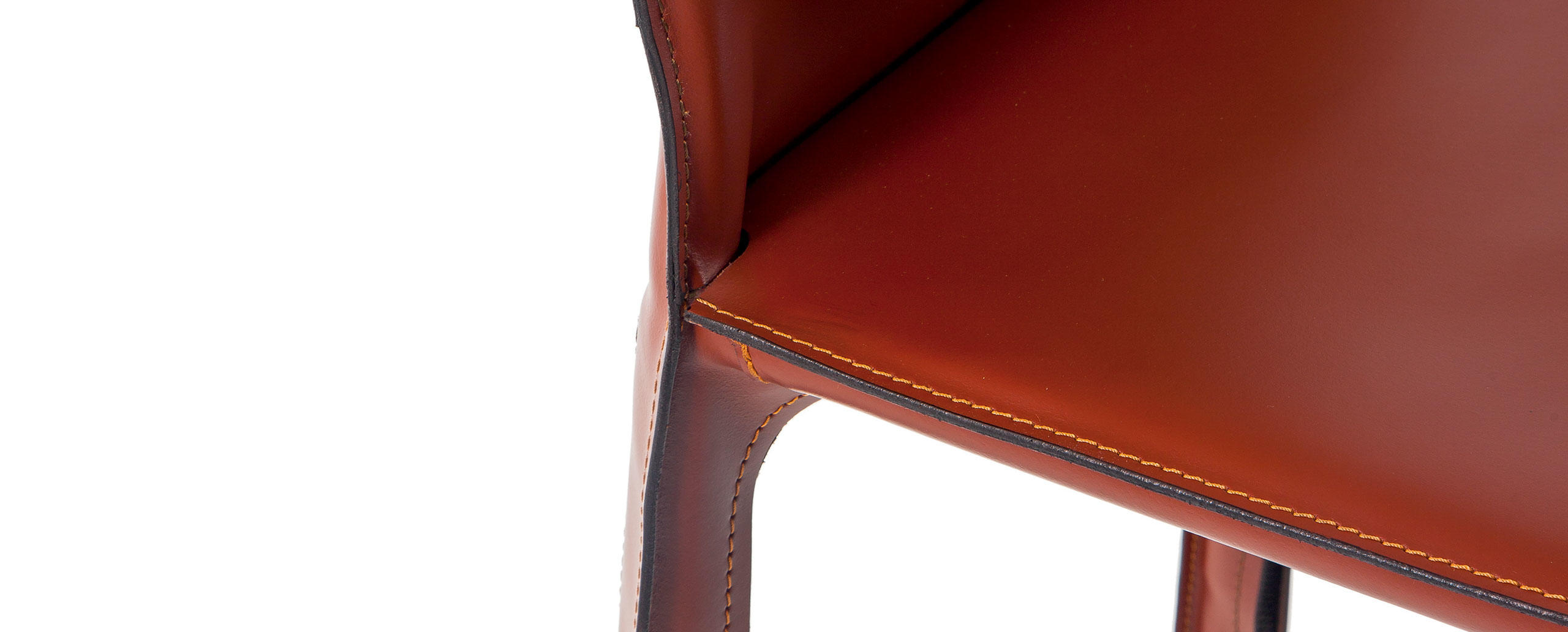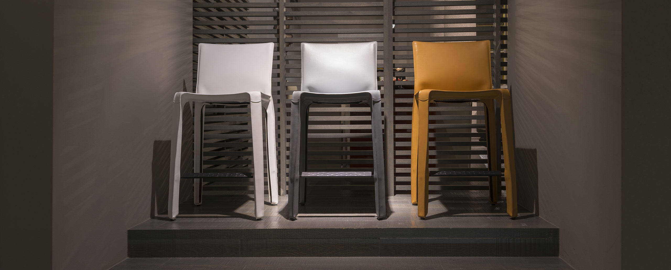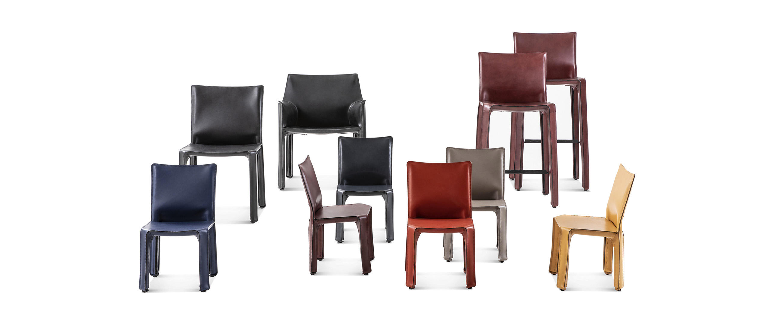 “This was a new kind of chair, constructed totally out of leather, much cloned since then.” Thus Mario Bellini describes Cab, a best-seller that he designed in the 1970s, which is now a signature piece in Cassina’s I Contemporanei collection. Cab was the first-ever chair to feature a free-standing leather structure, inspired by how our skin fits over our skeleton. The pieces are sewn together only when their outer edges have been trimmed to ensure a perfect fit. Once assembled, the cover is attached to the chair’s steel skeleton and held in place by means of a zipper fastening, as in a bespoke tailored garment. From the original model over the years a family of stools has also been developed, now available in 2 heights and in the new slim version with a lower backrest, making it more versatile for home use and also for public areas and bars, all also available in the new Plus leathers. in pure aniline.