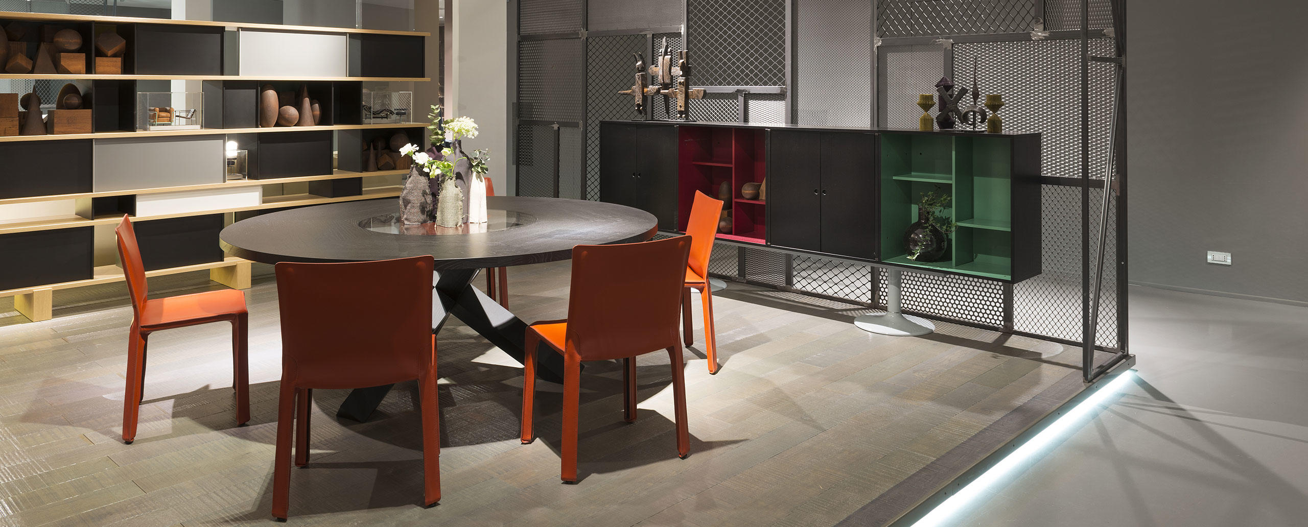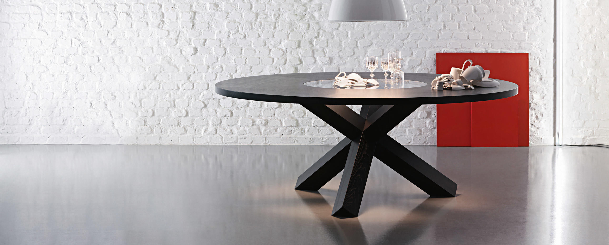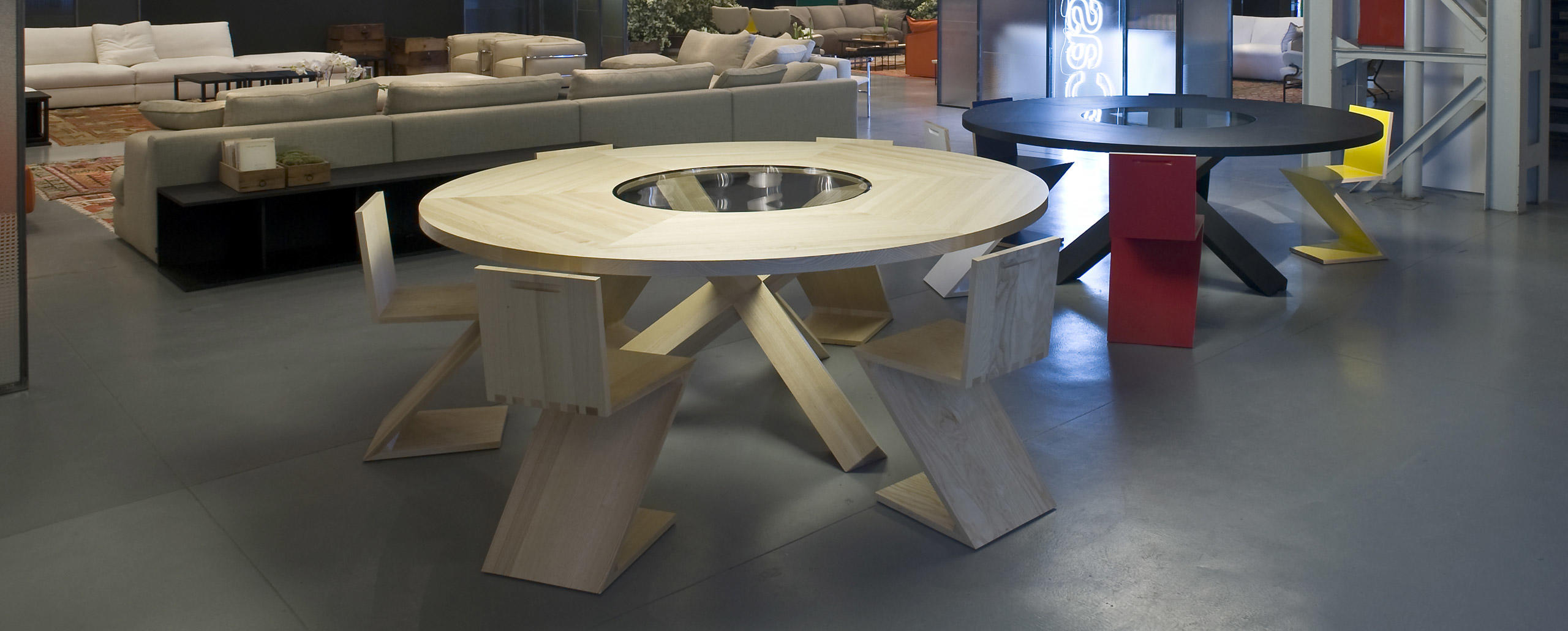 Round wooden table with a central rotating top in crystal Ø 82 cm, coplanar with the wooden top; the base is composed of three interlocking legs in a mortise joint assembly: Finishes: natural ashwood or black stained ashwood, natural walnut or walnut stained walnut.