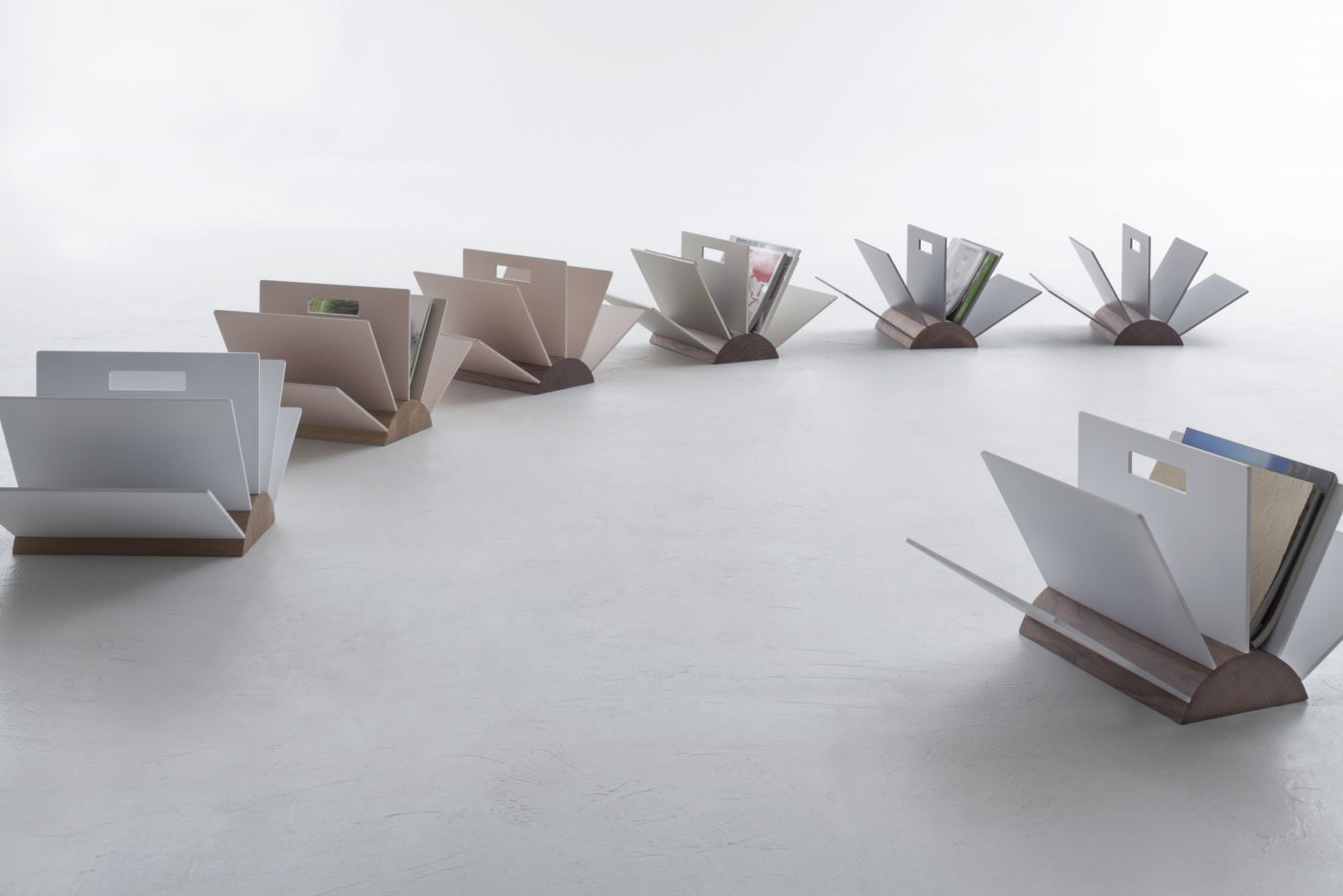 Radial, lacquered panels open onto an elegant base, a solid wood element. The space was thought to contain books and magazines, and it takes a different, innvovative shape, playing with lines and colors, empty and filled spaces.