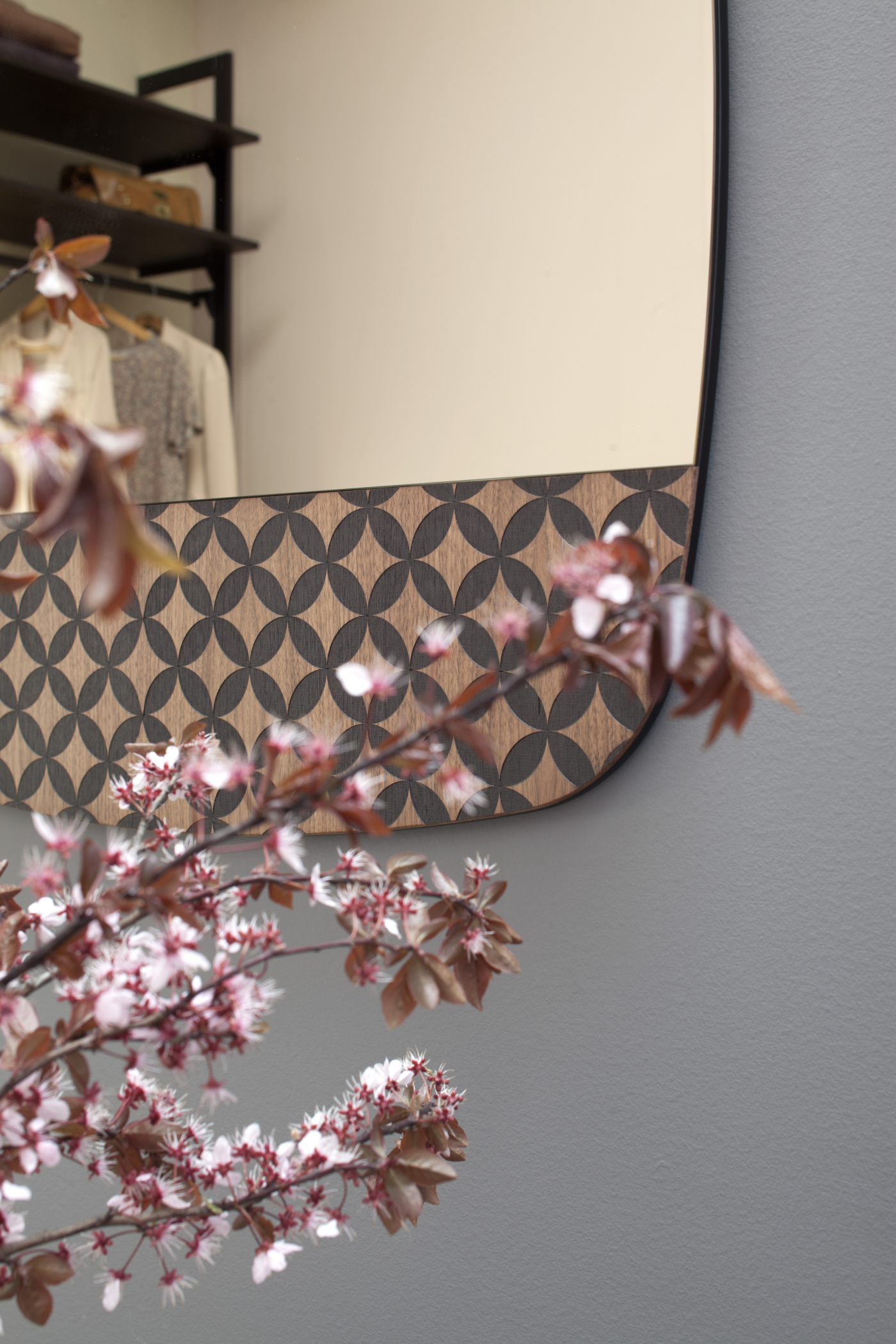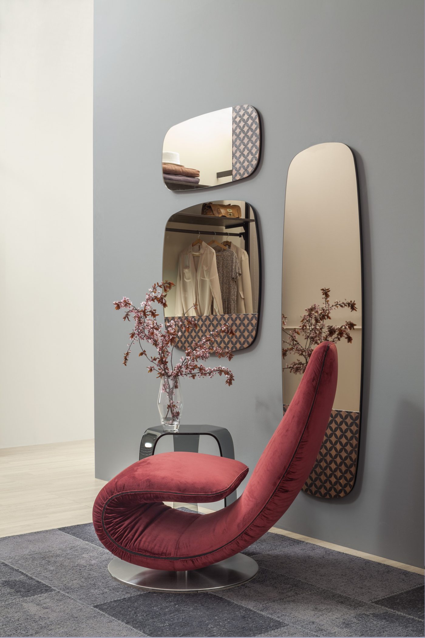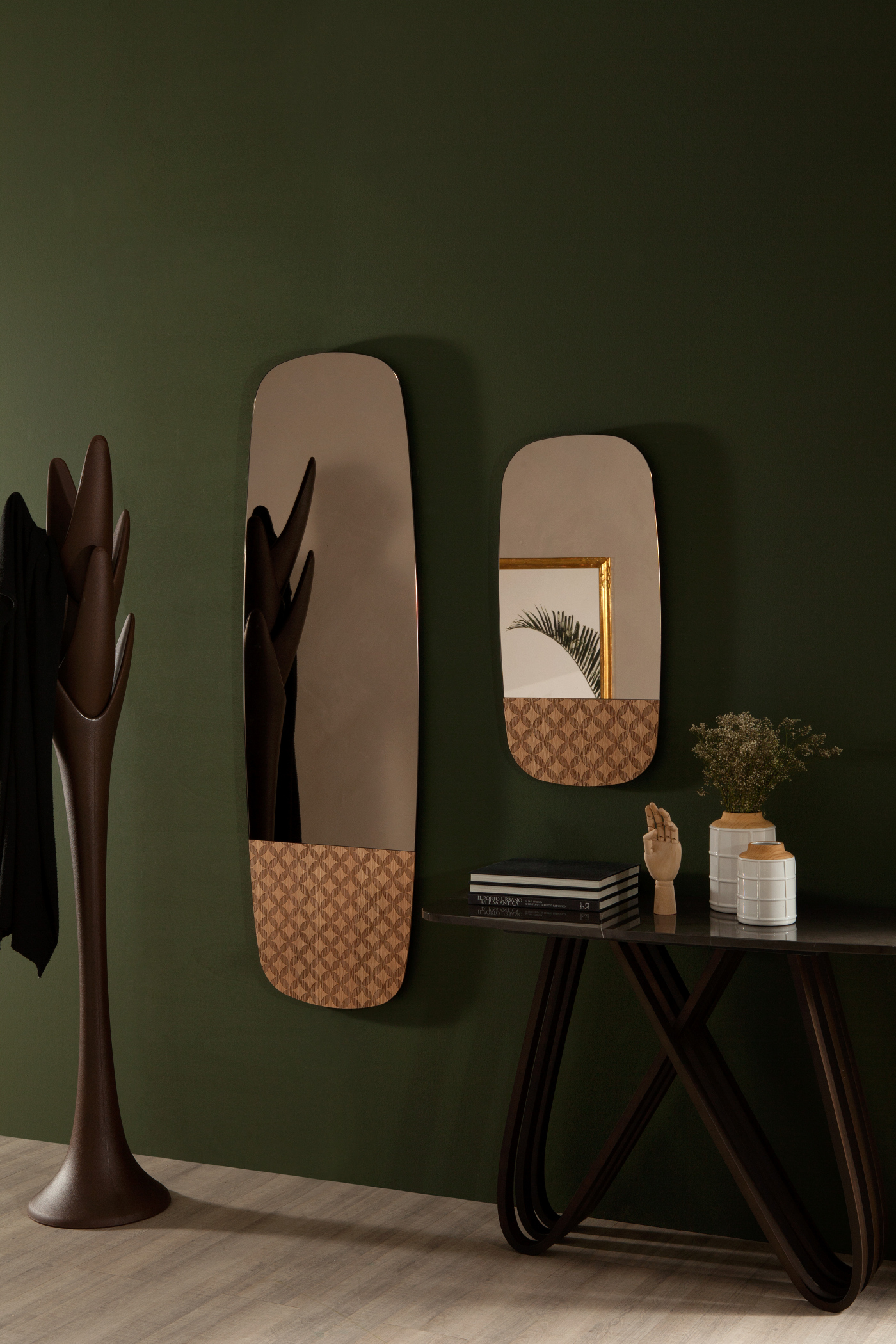 A peculiar cut and a unique shape, breaking to add a new space - other than the mirror - to the structure's pattern. Wood comes out enirchened, and its marriage with bronzed, or silver mirrors, makes Marguerite a one-ok-a-kind piece.