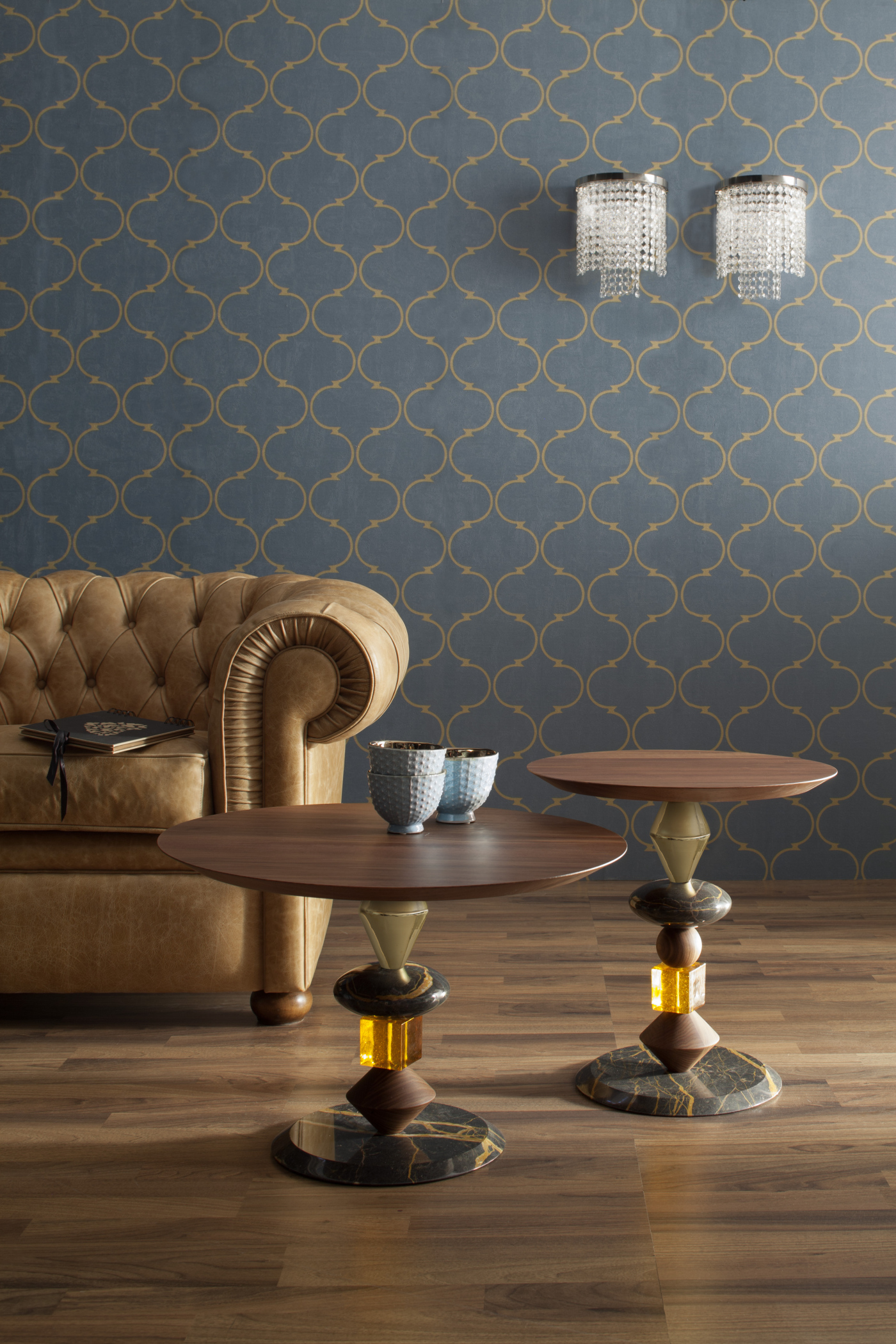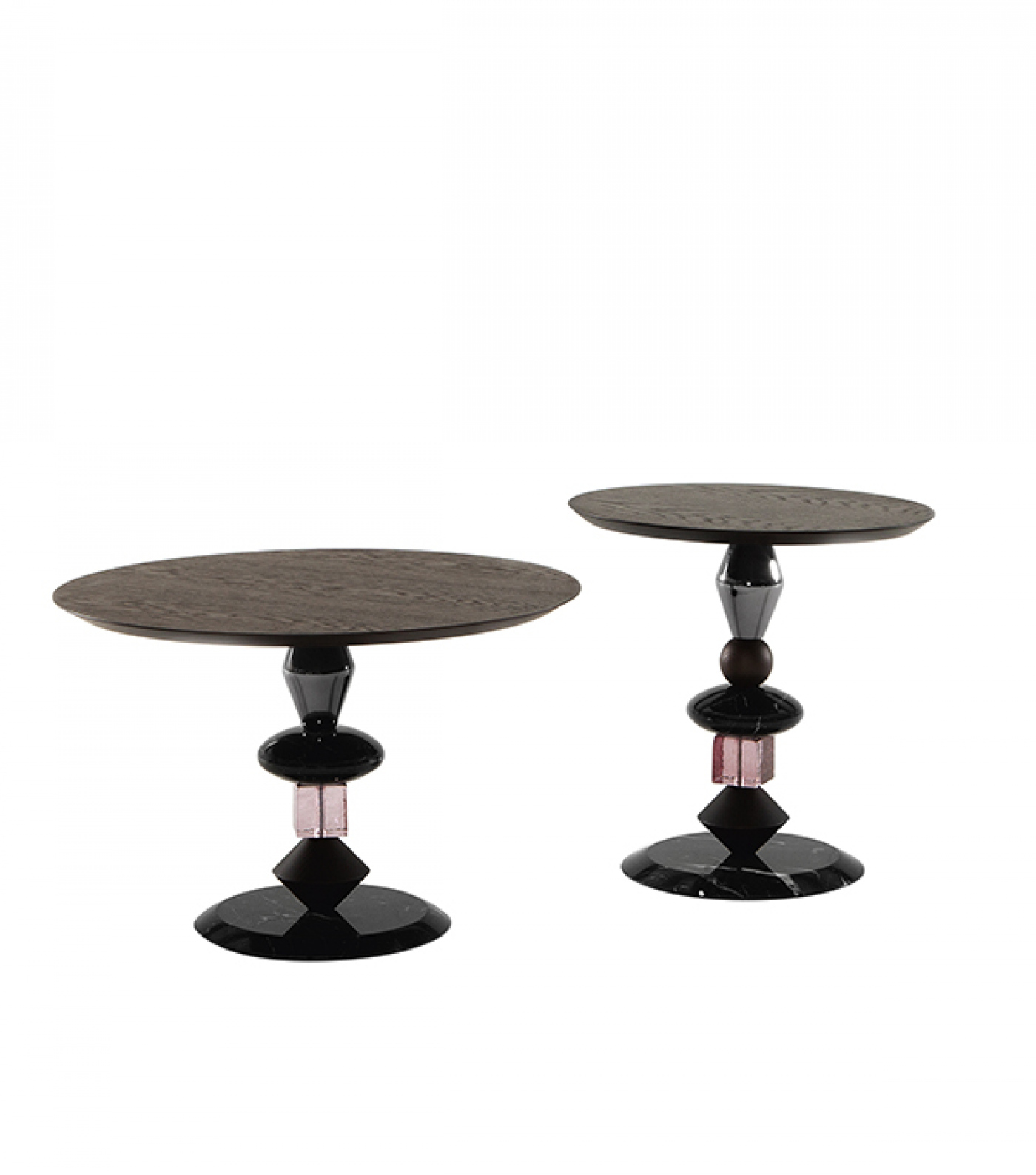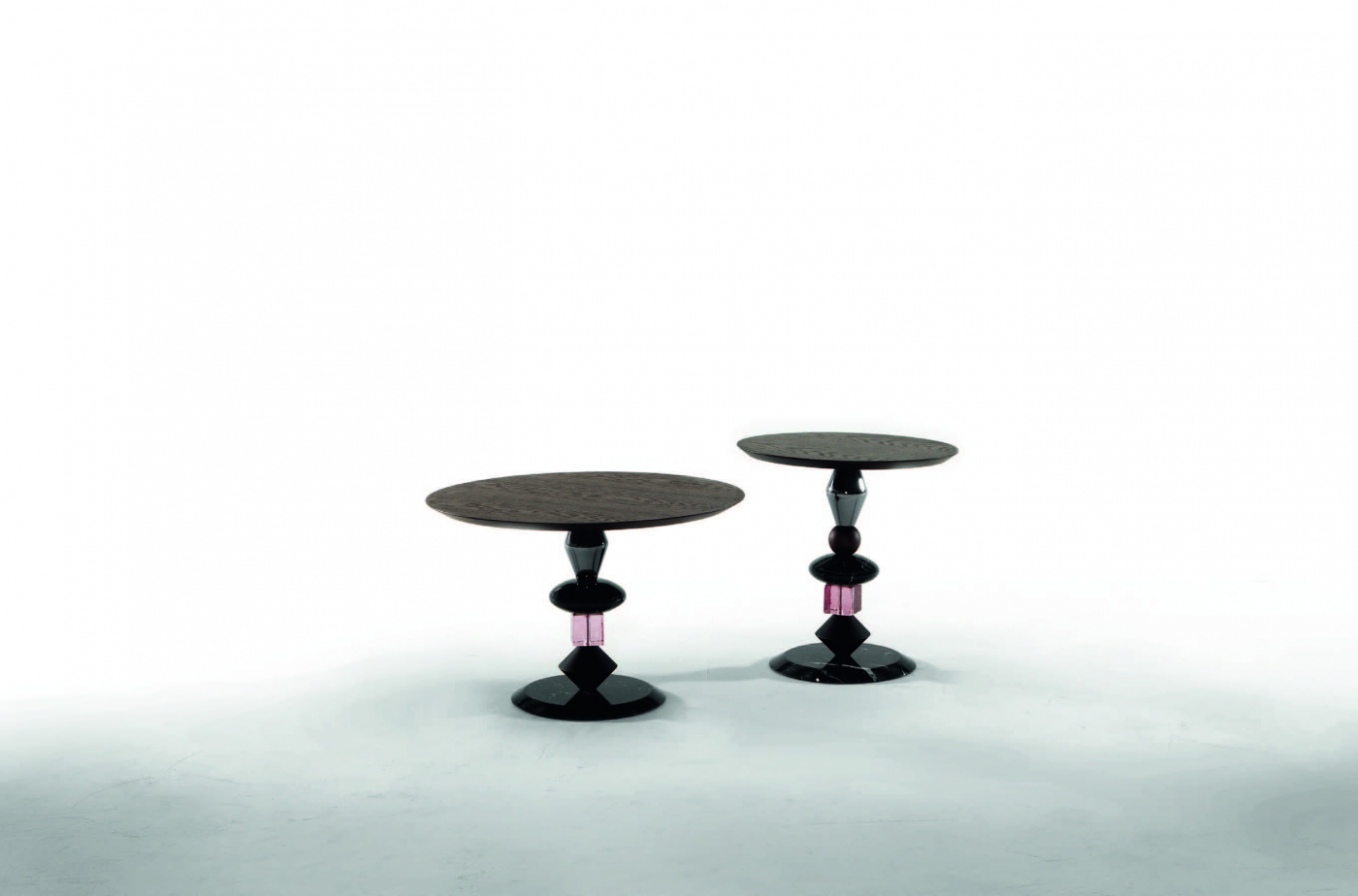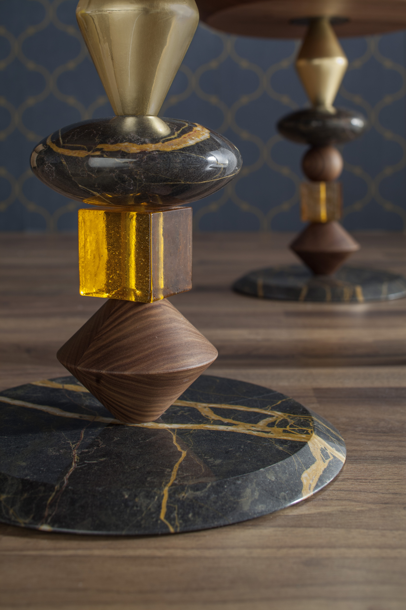 Pandora expresses an extremely refined and studied in great detail. Pandora represents the marriage of several different elements in one single product. It starts with a marble base, and goes up in a variety of components, made of solid wood, glass, gold and wonderful wooden tops.