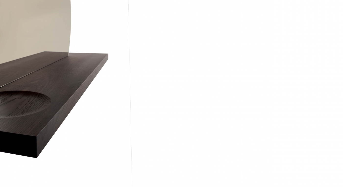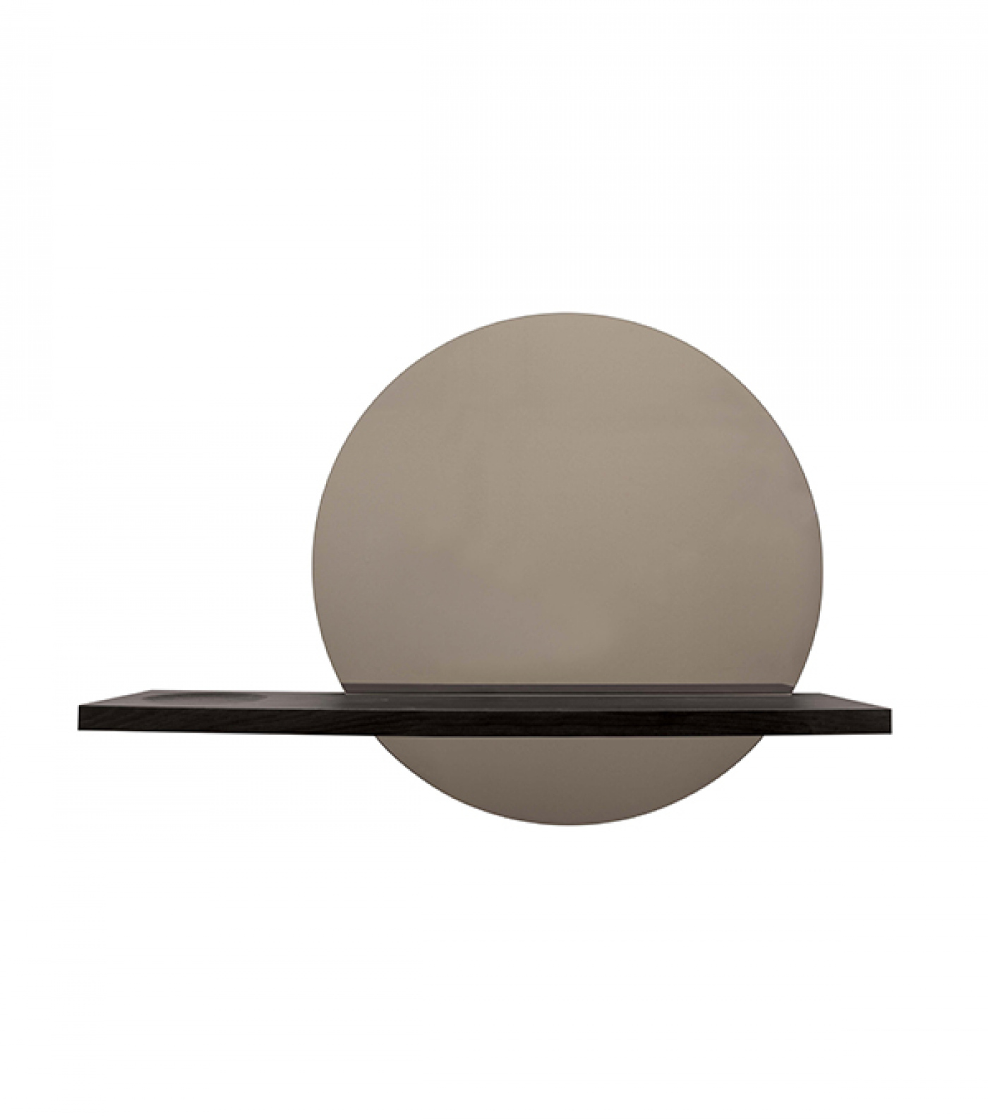 Just like the sunset, the perfectly shaped circle formed by Sunset mirror moves right, creating a picturesquely unbalanced effect. The mirror is available in the silver version and in the bronze one, so to adapt to different lights. The Canaletto walnut, or dark heat-treated oak shelf “cuts” the sun just like the edge of the horizon would.