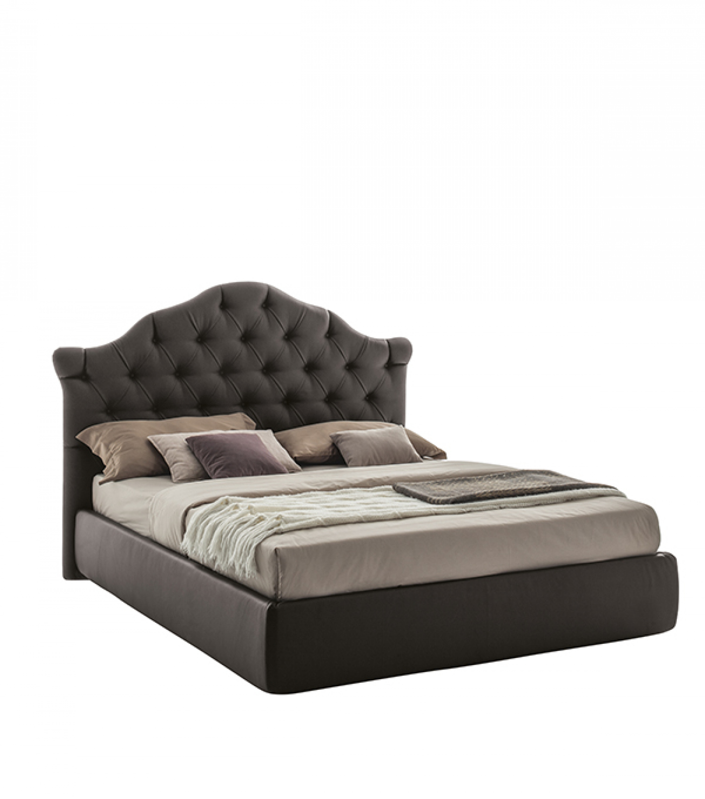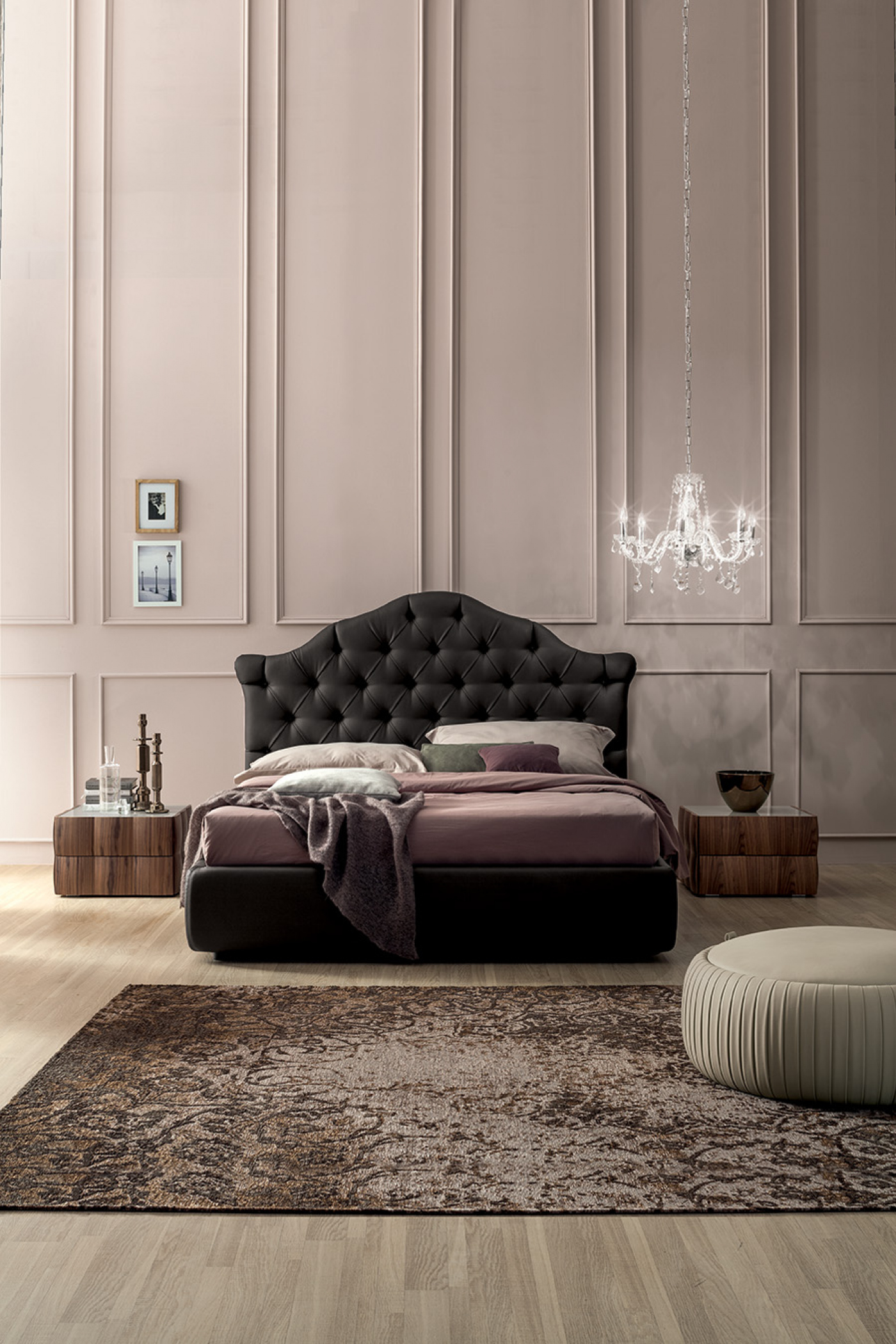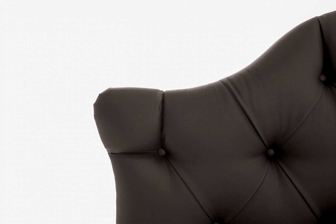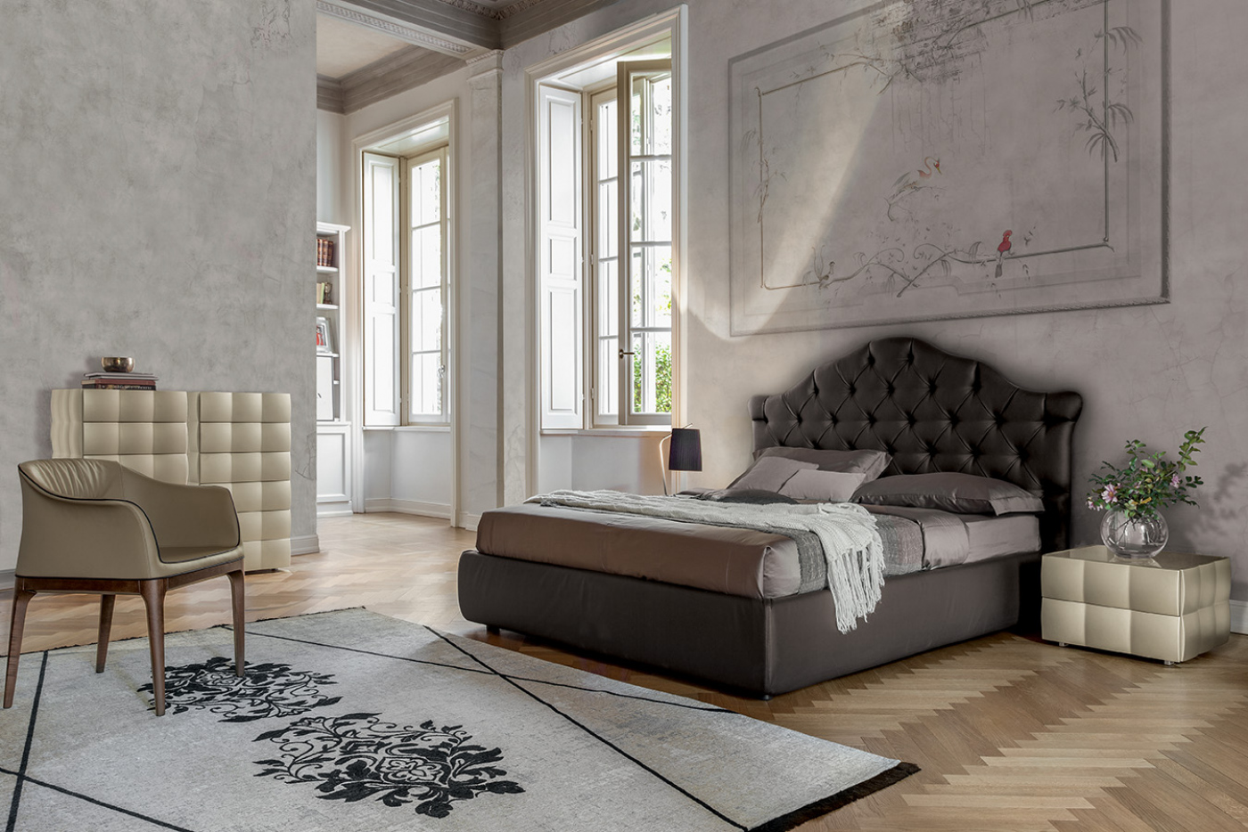 There is no possible way to mention Venice, without producing an homage to its magnificence. Veneziano is clearly an example of it: the headboard lifts up at the middle, almost like a building’s battlement. Handmade Chesterfield technique creates a Capitonné effect, both rich and refined. The bottom ring graciously meets the glorious headboard and its simple upholstery.