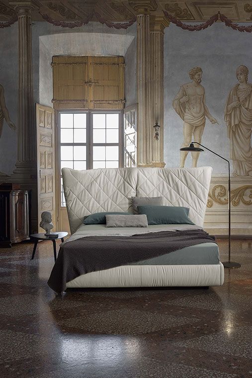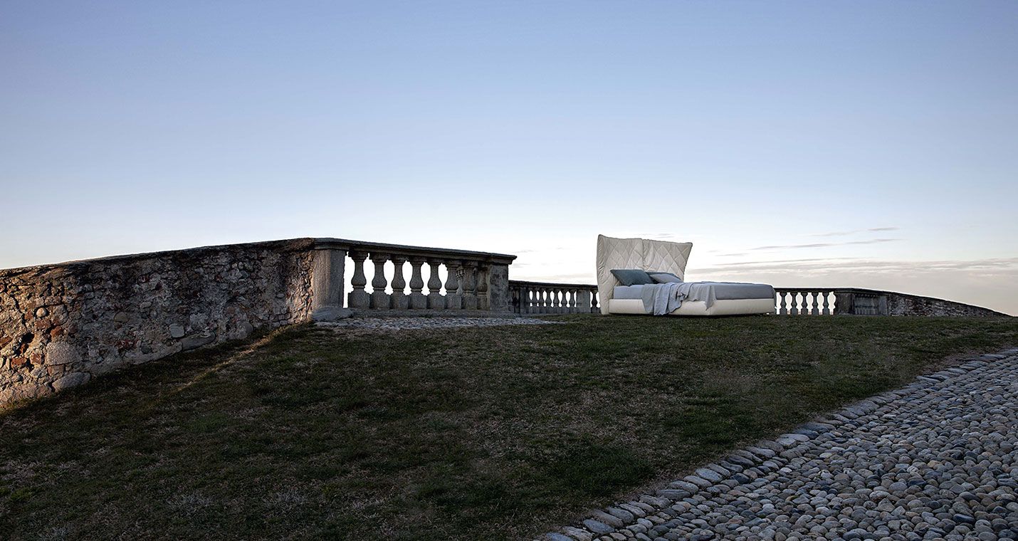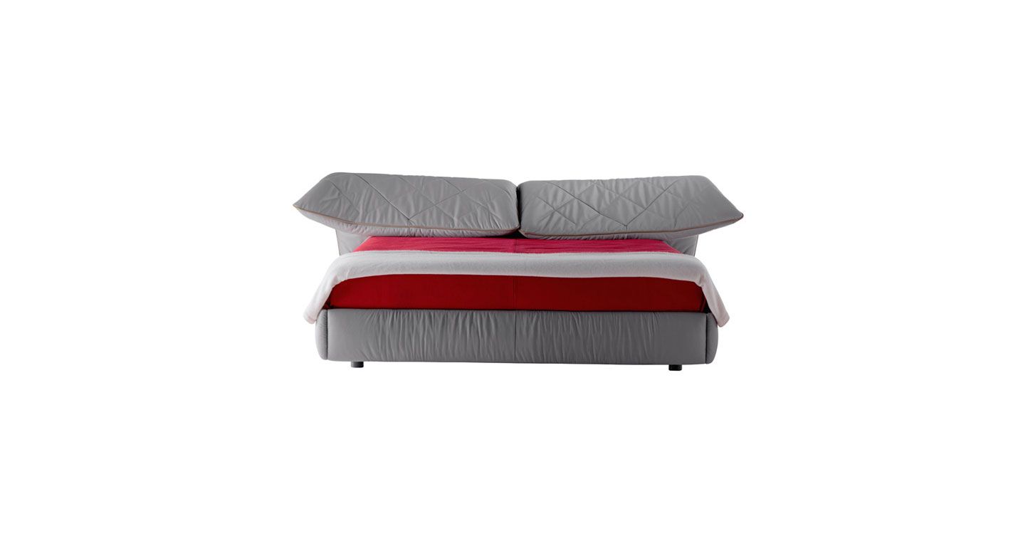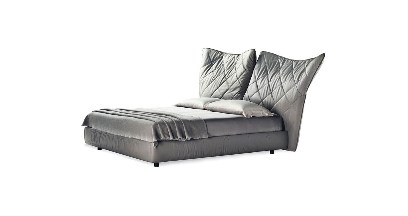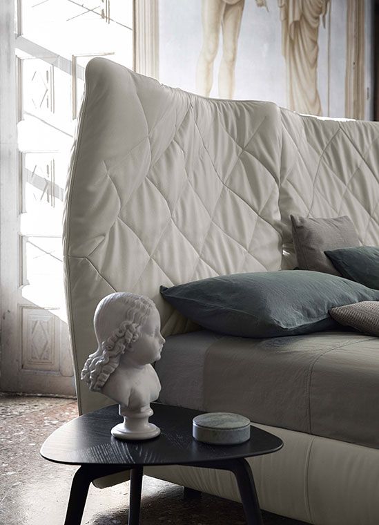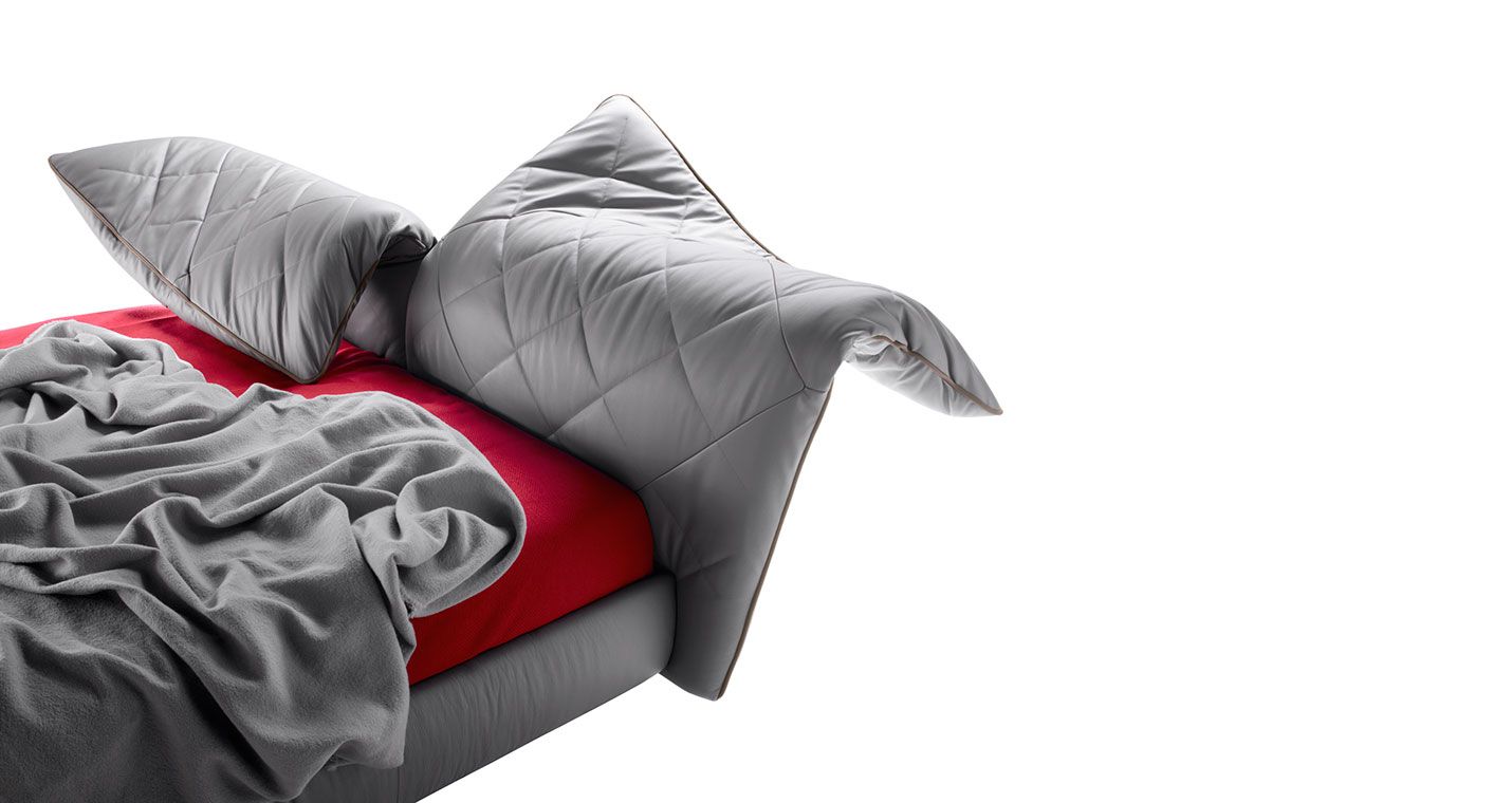 Paola Navone designs Lelit, a dreamlike bed-toy that can be transformed in many different ways at the drop of a hat. The high, padded headboard, akin to a windbreak that nestles and protects, is composed of two independent, flexible and easy-to-manoeuvre wings that can be lightly closed like an enveloping shell or bent to differing degrees to become a soft support for the pillows.