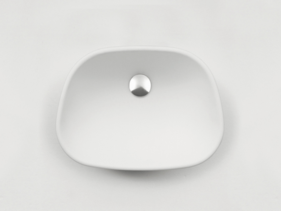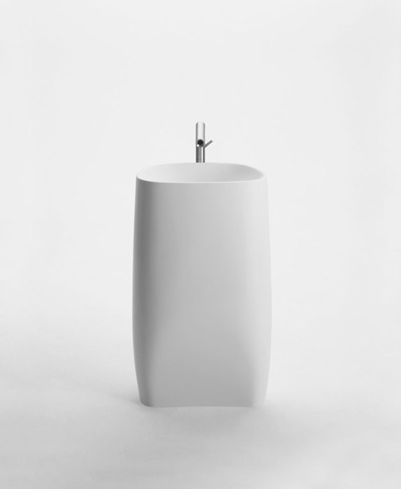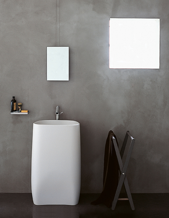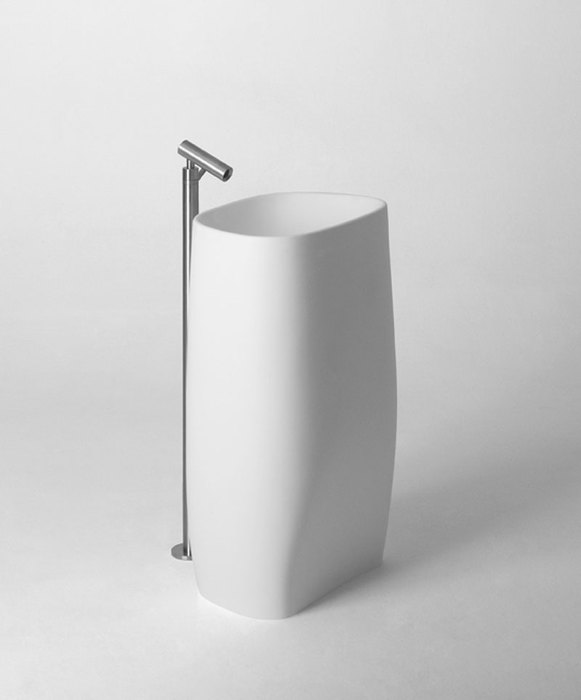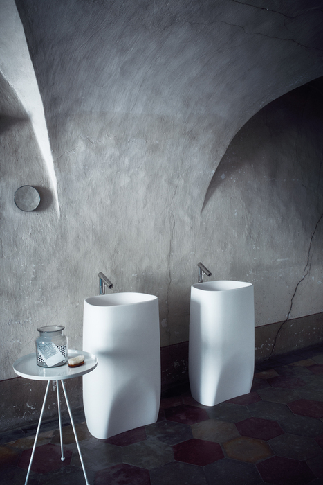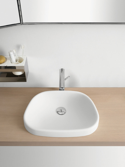 Made in white Cristalplant biobased it echoes the unmistakable design style of the bathtub and fittings of the collection of the same name dominating the space with its soft and strong volume carved like a monolith. Further potential comes from the semi-recessed version in white Cristalplant biobased with elegant and generous lines.