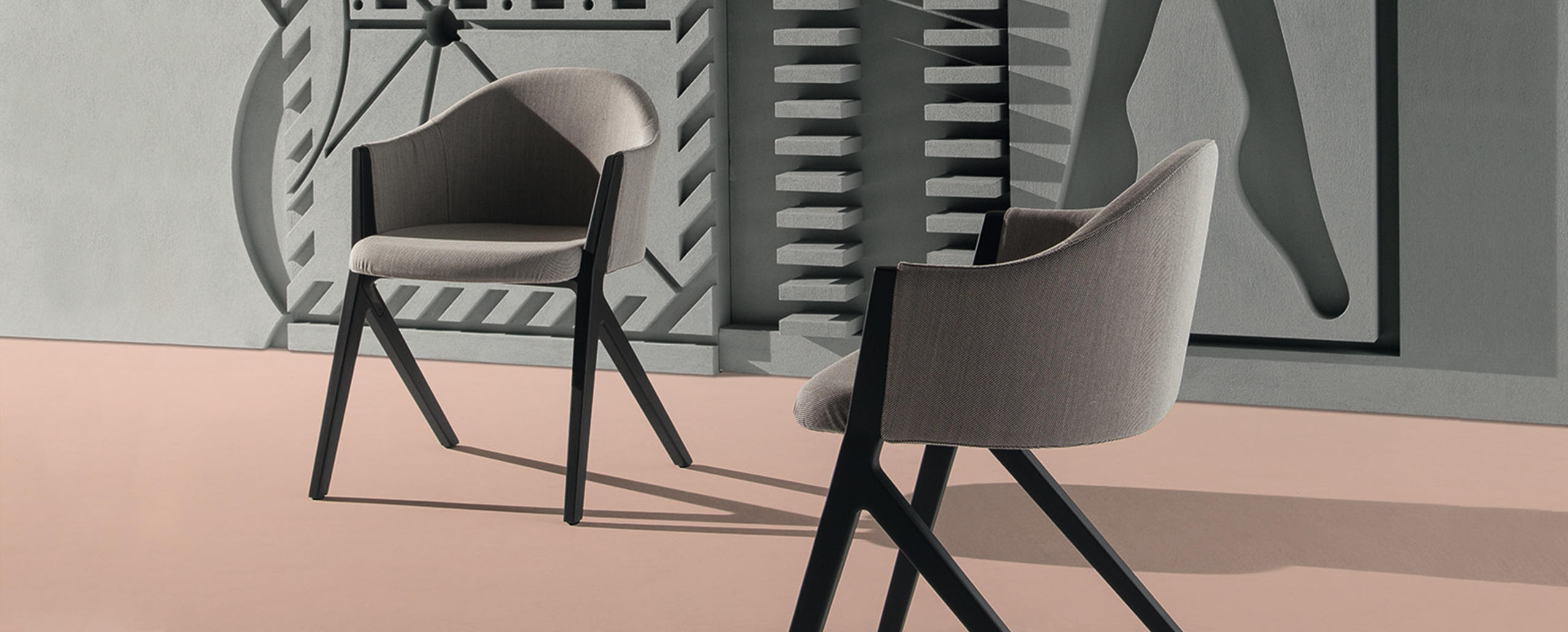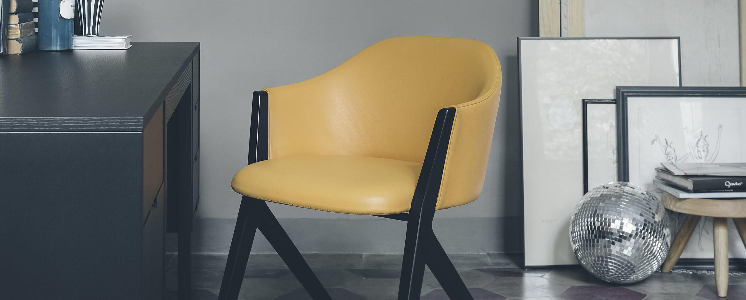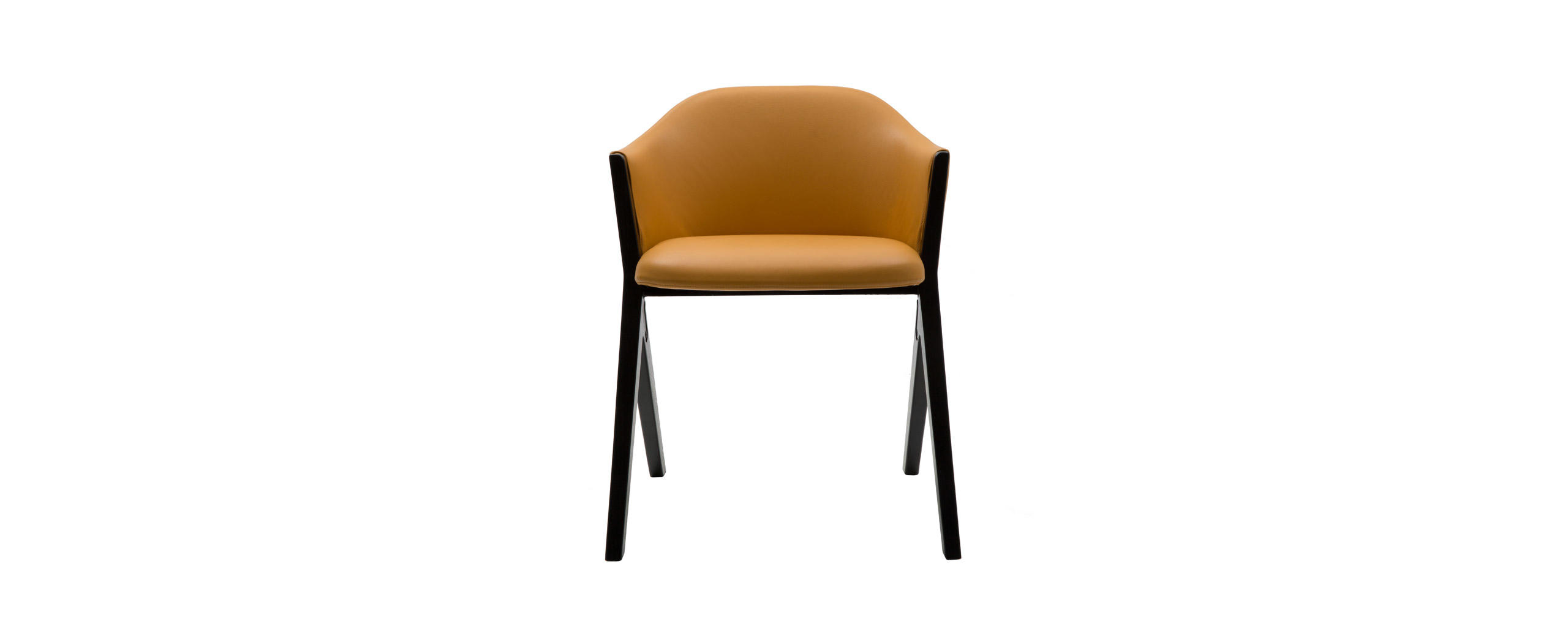 Chair with frame in aluminium alloy. Legs in solid natural or stained black ashwood. Feet in plastic material. Seat and back in CFC-free polyurethane foam. Removable fabric or leather upholstery.