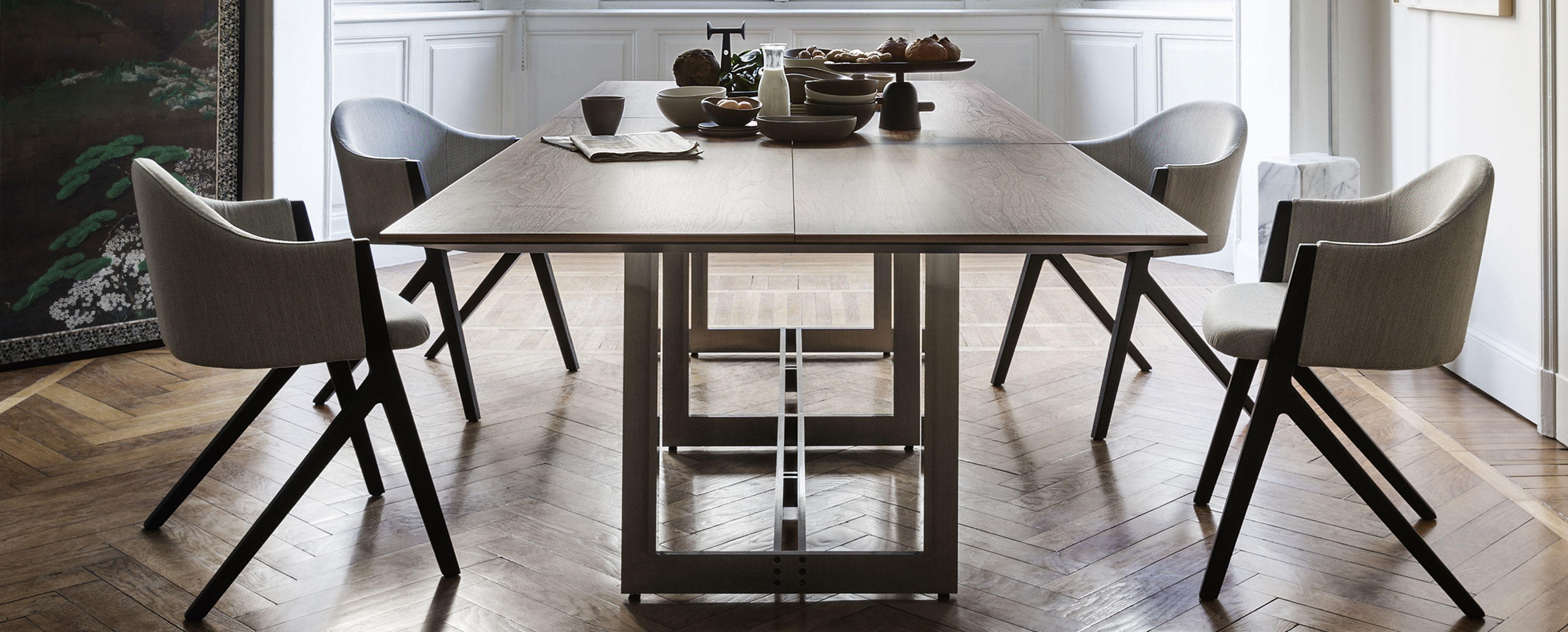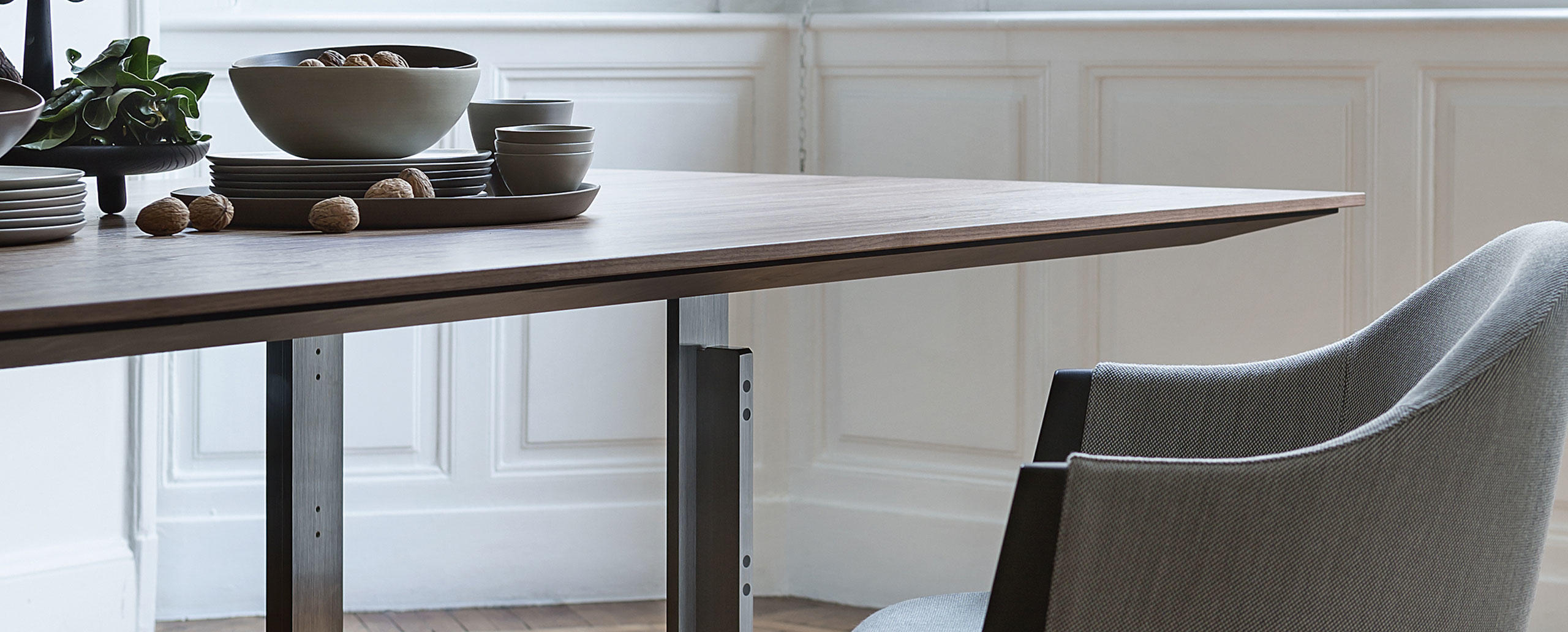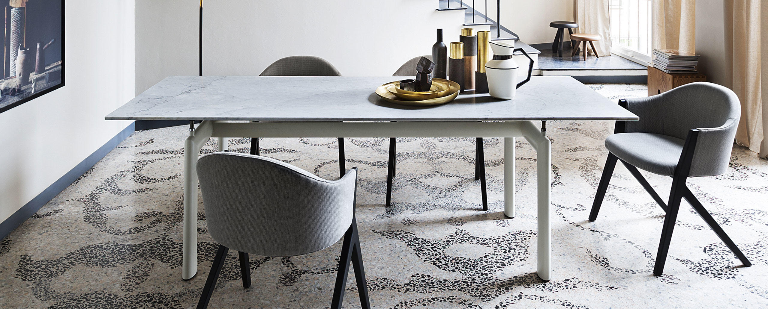 Chair with frame in aluminium alloy. Legs in solid natural or stained black ashwood. Feet in plastic material. Seat and back in CFC-free polyurethane foam. Removable fabric or leather upholstery.
