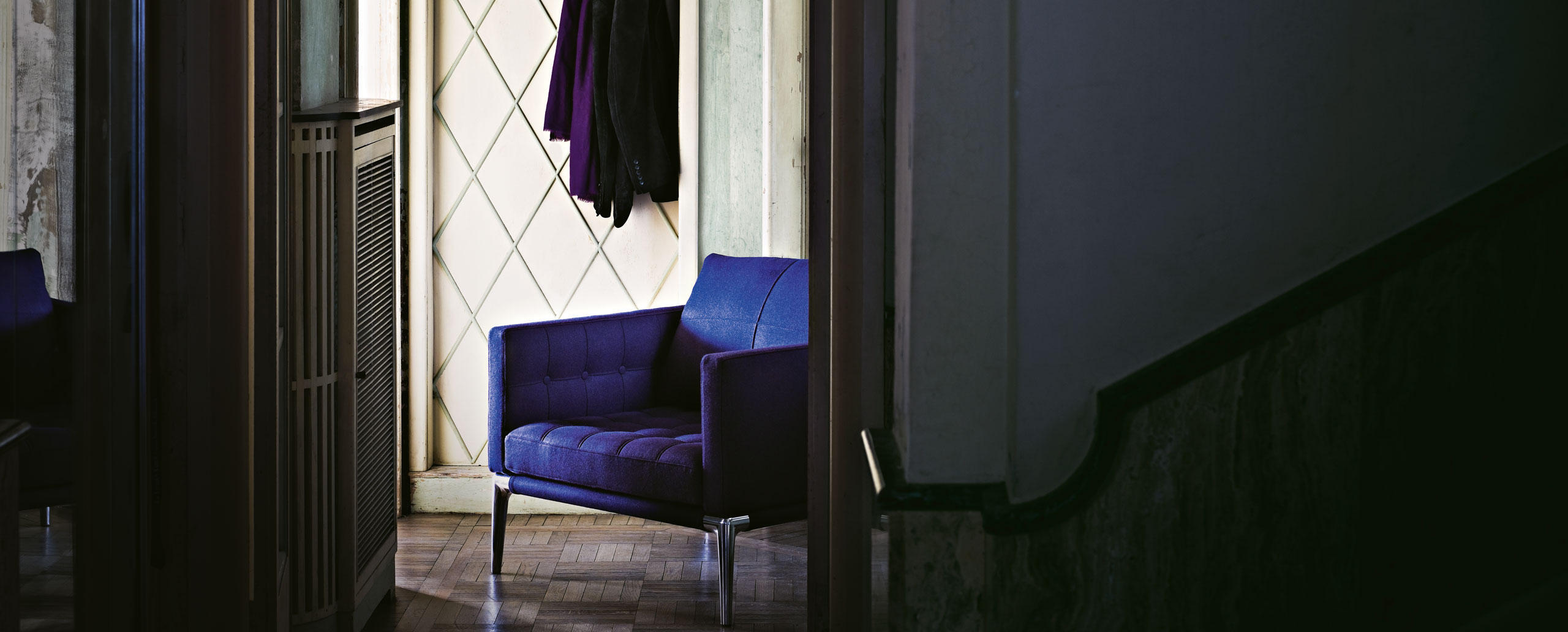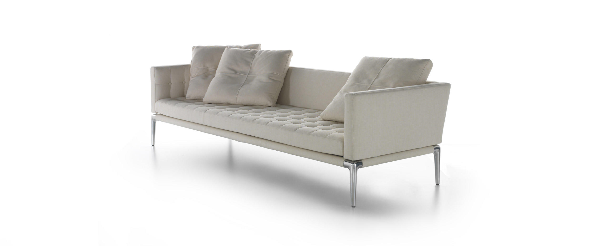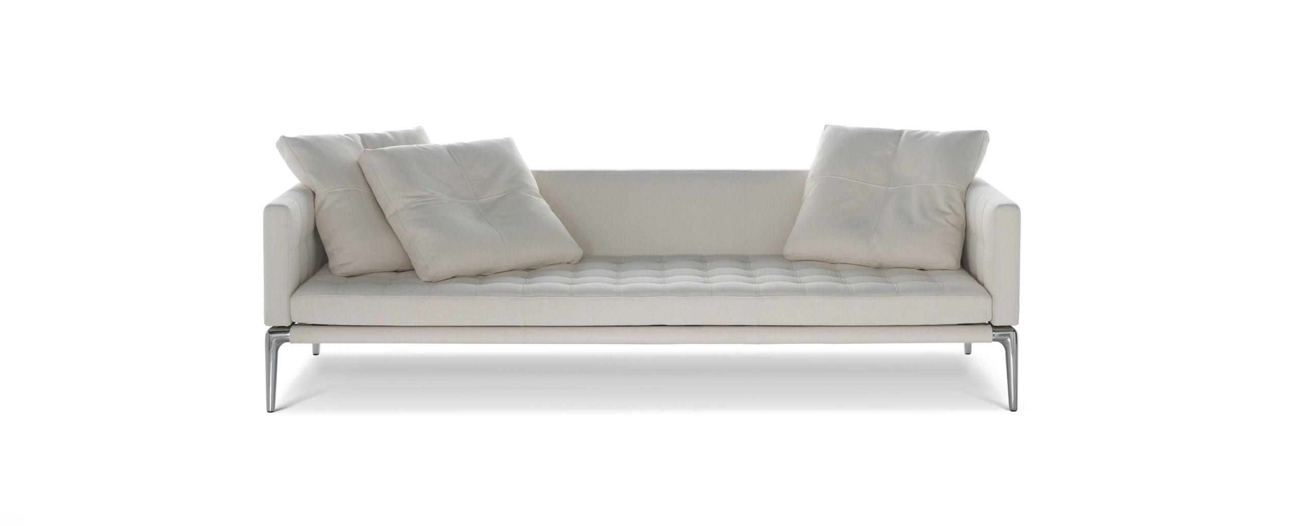 Sofas, armchair and ottoman. Rectangular back cushions or square removable feather cushions. The upholstery completely covers the frame leaving visible the polished aluminium feet. Padding in differentdensities CFCfree polyurethane foam. Upholstery in fabric or leather. The armrests and seats only are quilted finished.