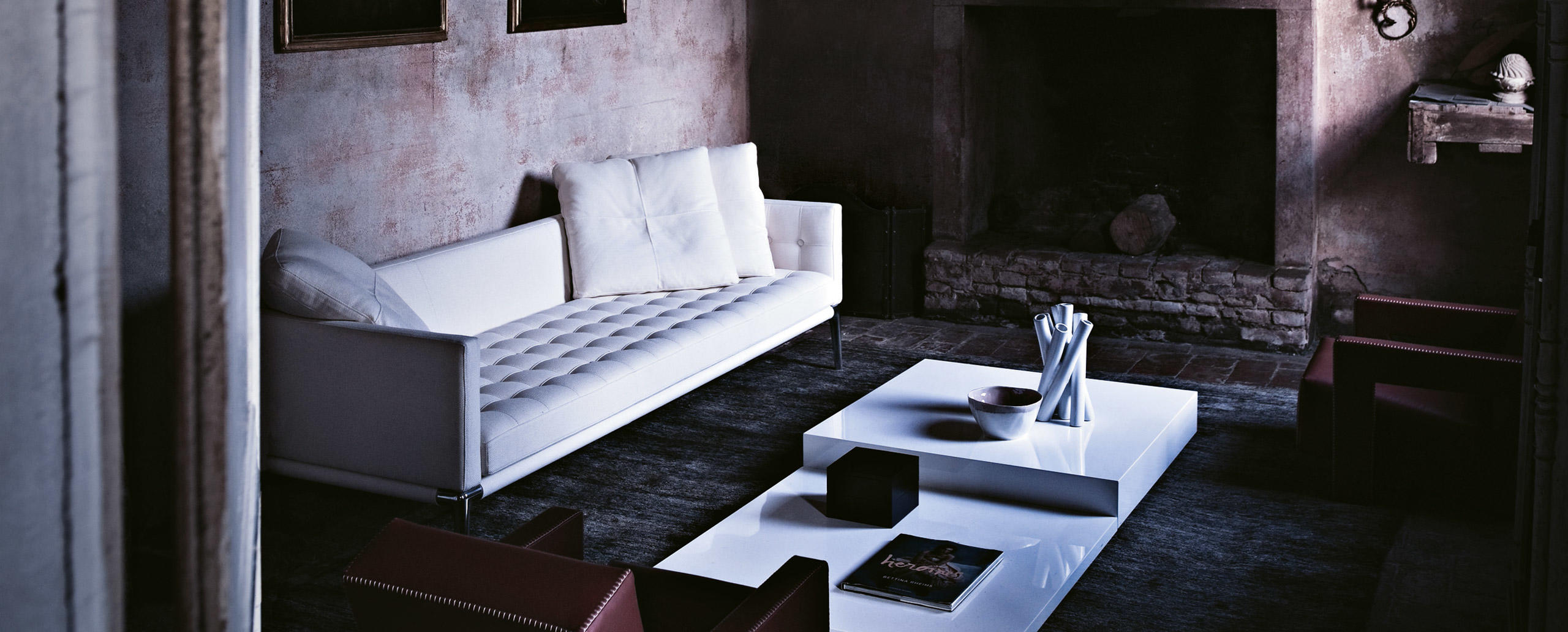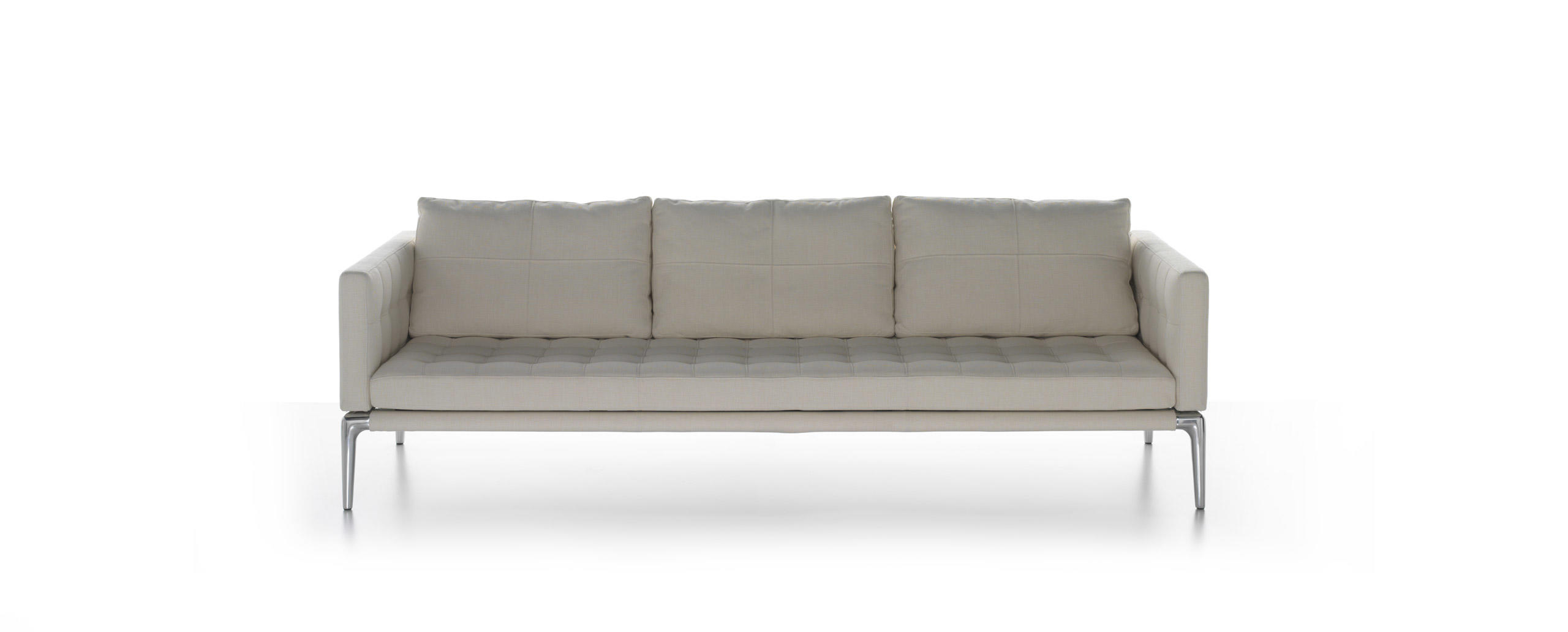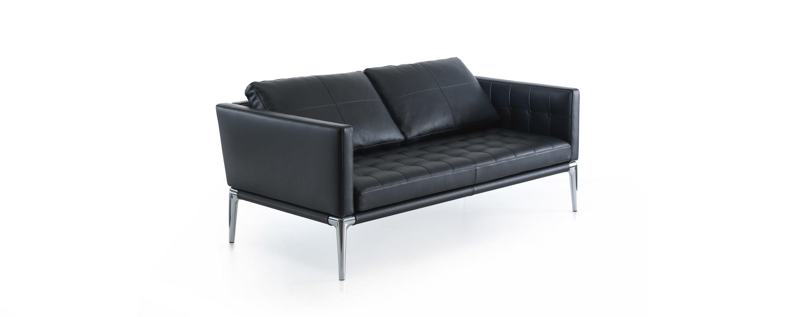 Sofas, armchair and ottoman. Rectangular back cushions or square removable feather cushions. The upholstery completely covers the frame leaving visible the polished aluminium feet. Padding in differentdensities CFCfree polyurethane foam. Upholstery in fabric or leather. The armrests and seats only are quilted finished.