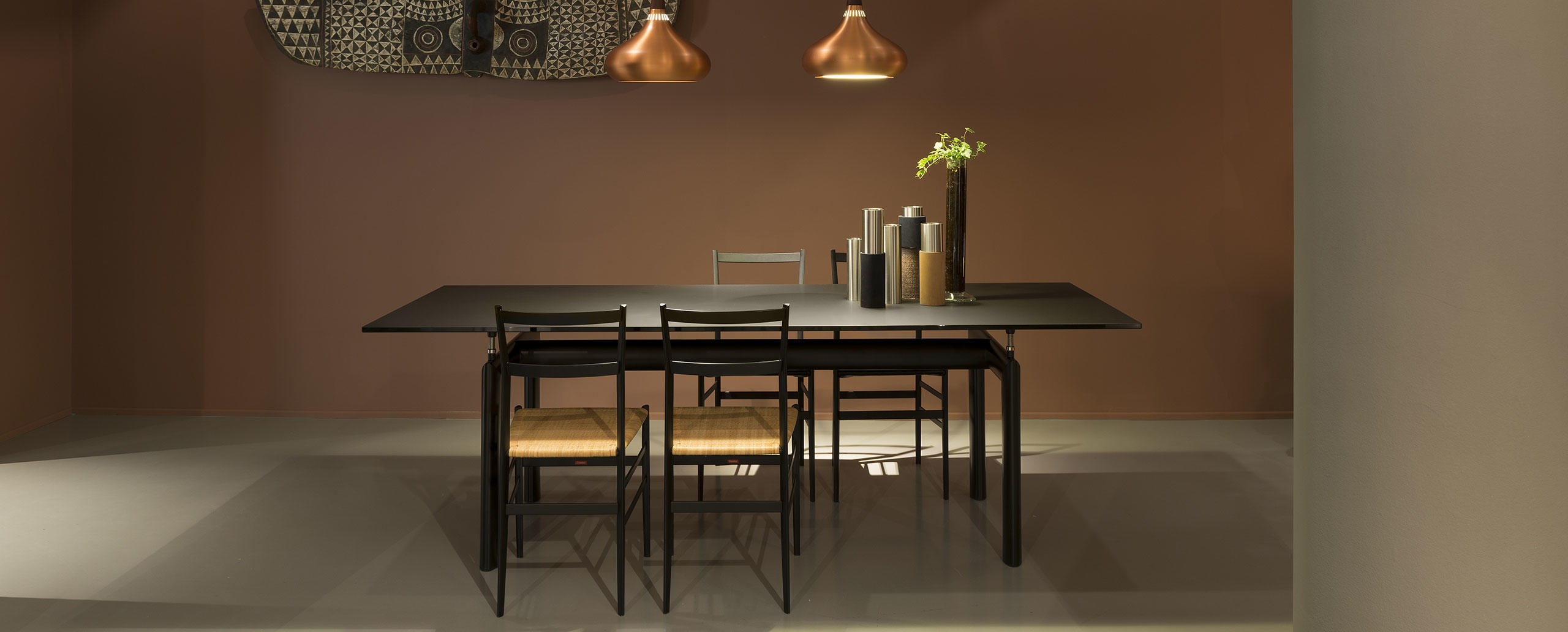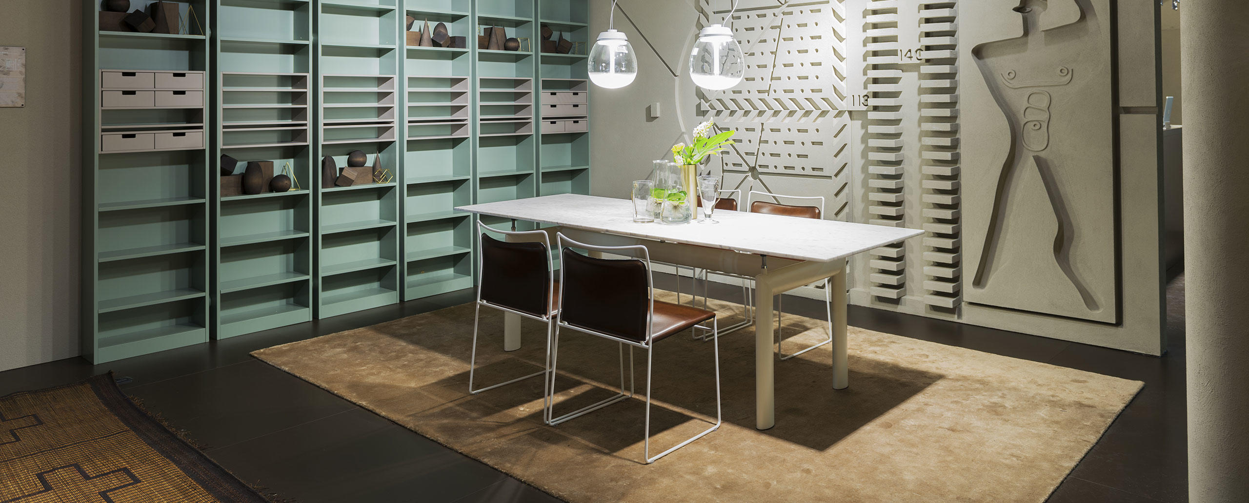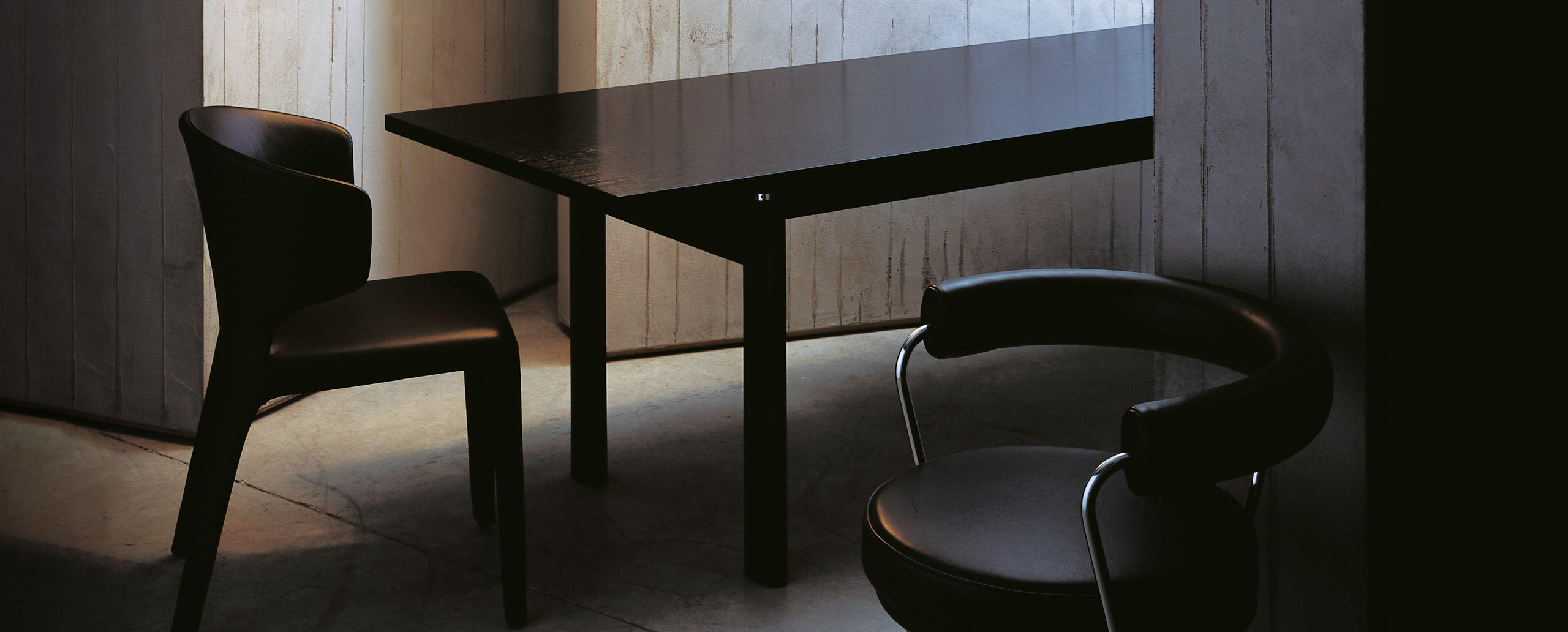 Table tube d’avion, section ovoïdeThe key idea at the heart of this table is to make a distinction between its load bearing base and the top that was to be supported.Each piece is completely autonomous and this is highlighted by the addition of the four middle support pieces used to adjust the height and keep the slim rectangular top in place over its the heavy base.The steel base is enamelled in the Le Corbusier’s colours palette: black, light blue, grey, green, mud and ivory with tops in crystal, textured glass or in the fi nishes natural or black stained oak or American walnut and in white Carrara or black Marquiña marble.