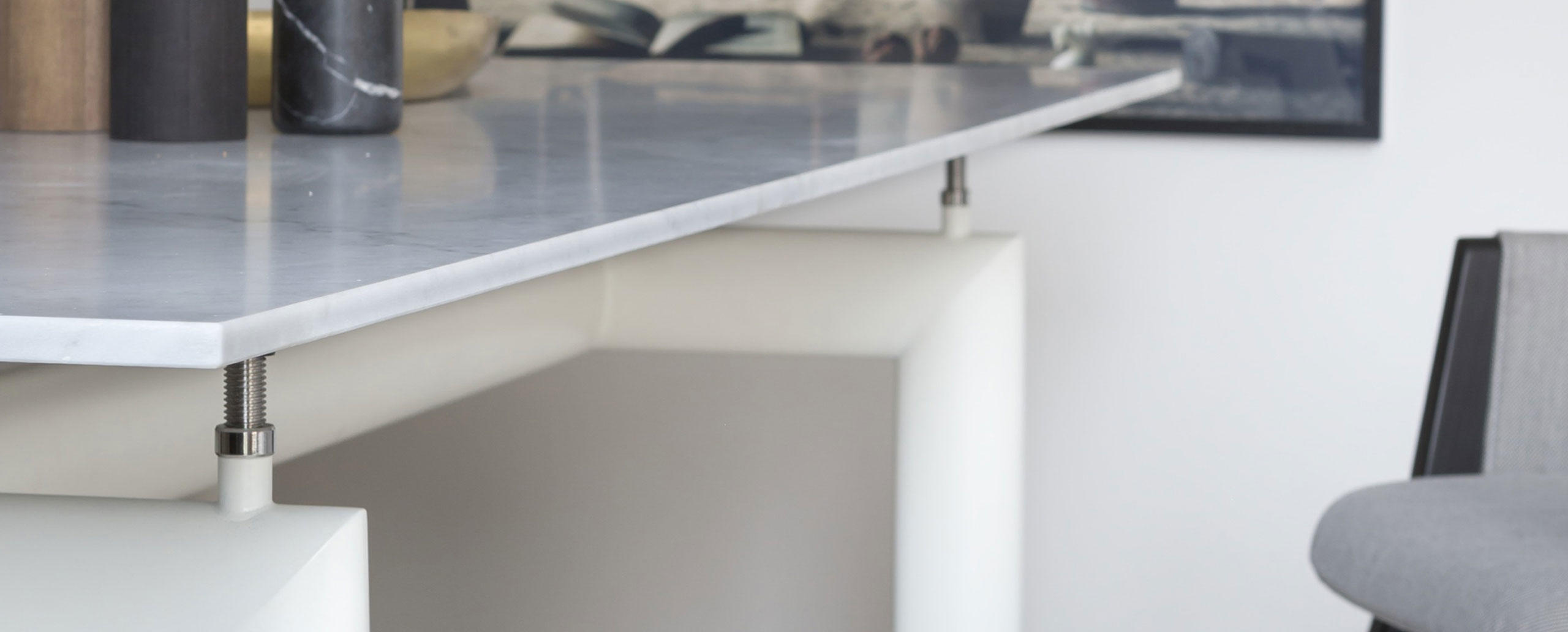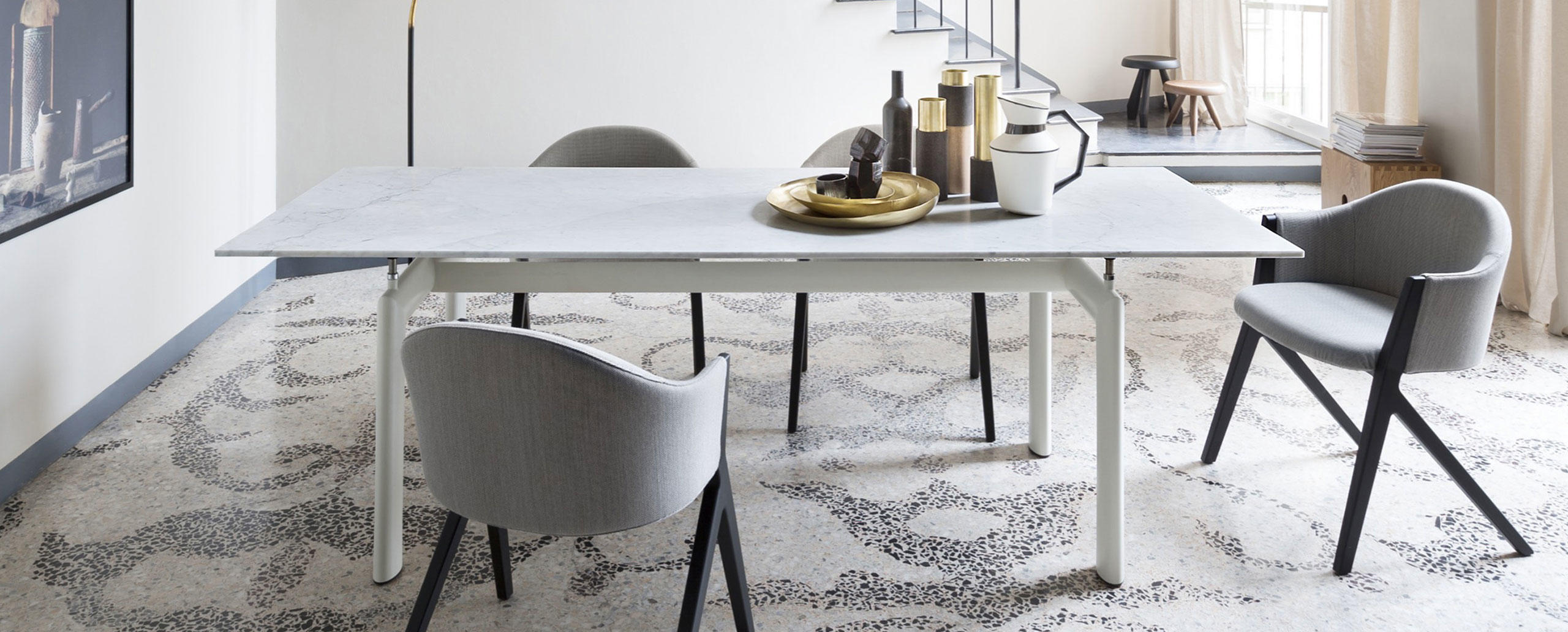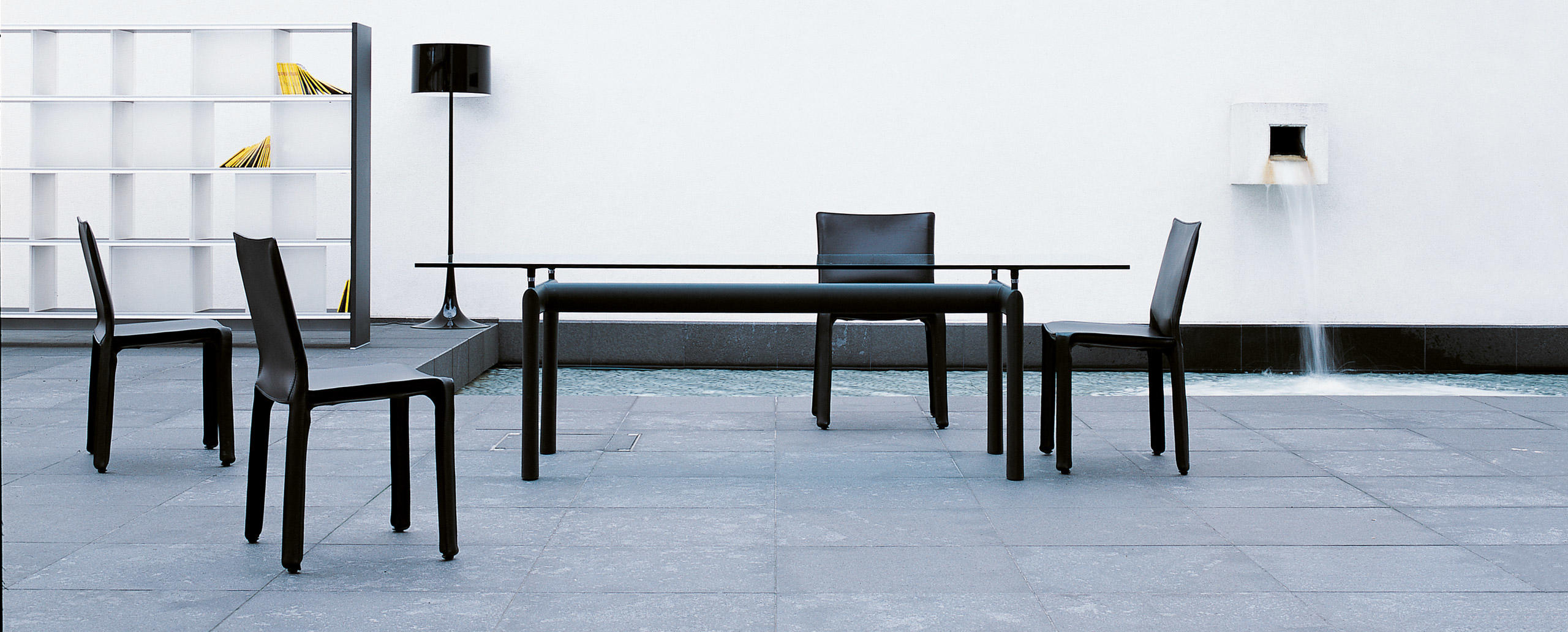 Table tube d’avion, section ovoïdeThe key idea at the heart of this table is to make a distinction between its load bearing base and the top that was to be supported.Each piece is completely autonomous and this is highlighted by the addition of the four middle support pieces used to adjust the height and keep the slim rectangular top in place over its the heavy base.The steel base is enamelled in the Le Corbusier’s colours palette: black, light blue, grey, green, mud and ivory with tops in crystal, textured glass or in the fi nishes natural or black stained oak or American walnut and in white Carrara or black Marquiña marble.