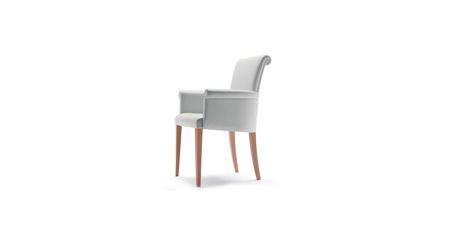 The Vittoria armchairs and chairs, designed by Poltrona Frau R. & D., stand out for their original backrest which terminates with a subtle open spiral and traditional raised edging. Aesthetic elements historically associated with the Poltrona Frau style.