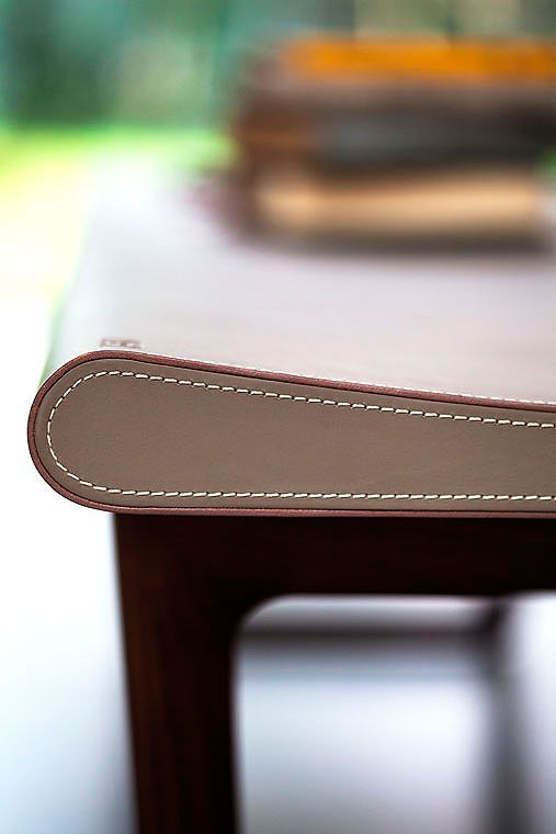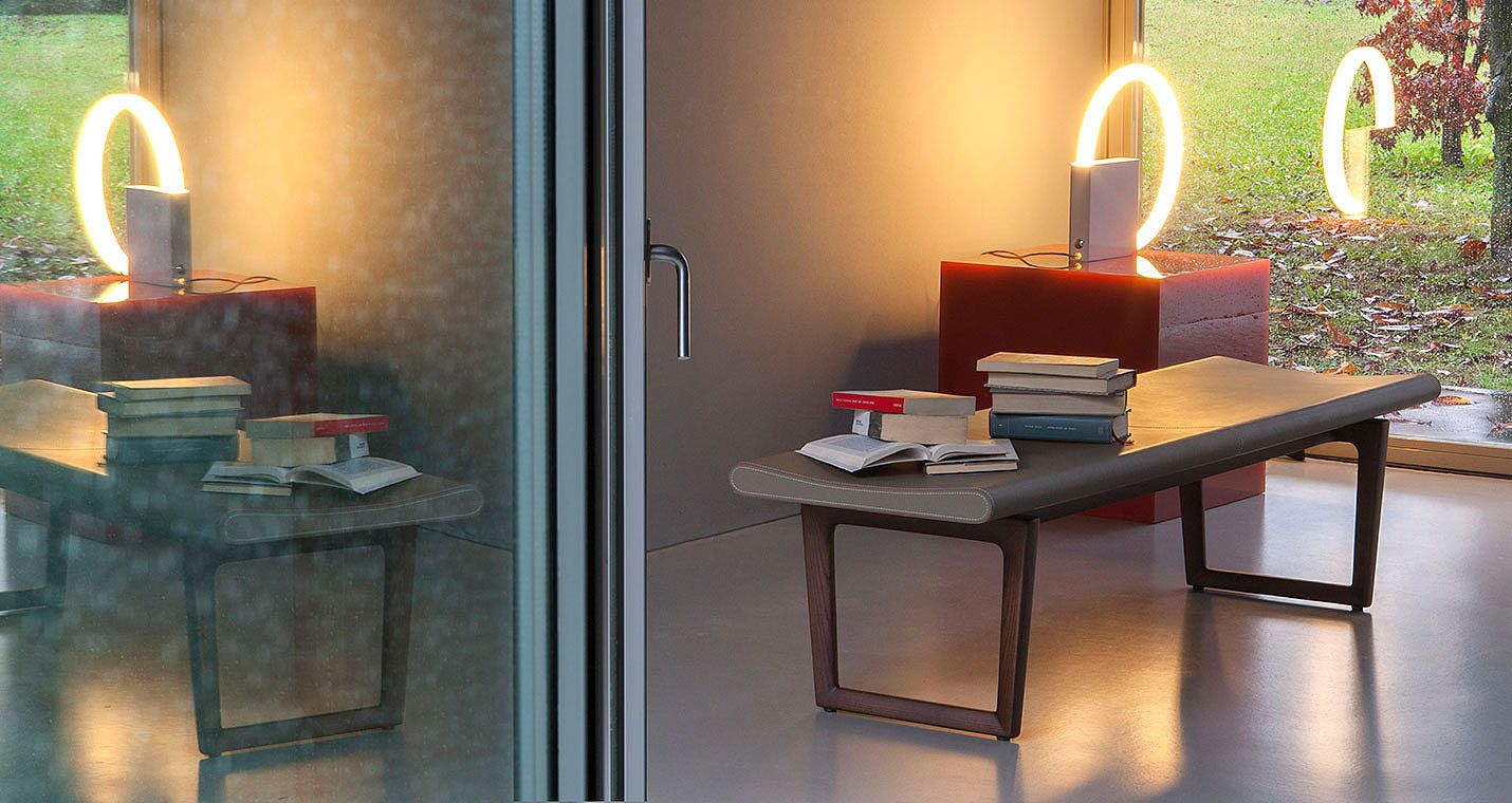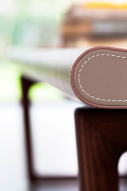 The Fidelio bench, which enriches an already lavish collection, is a seat of great formal purity that allows the intrinsic beauty of the materials to speak for themselves. The warm intensity of the saddle-leather marries with the richness of the solid wood; the elegant folds and visible stitching of the surfaces offset the minimal lines of the base, obtained through the expert and painstaking crafting of the wood.