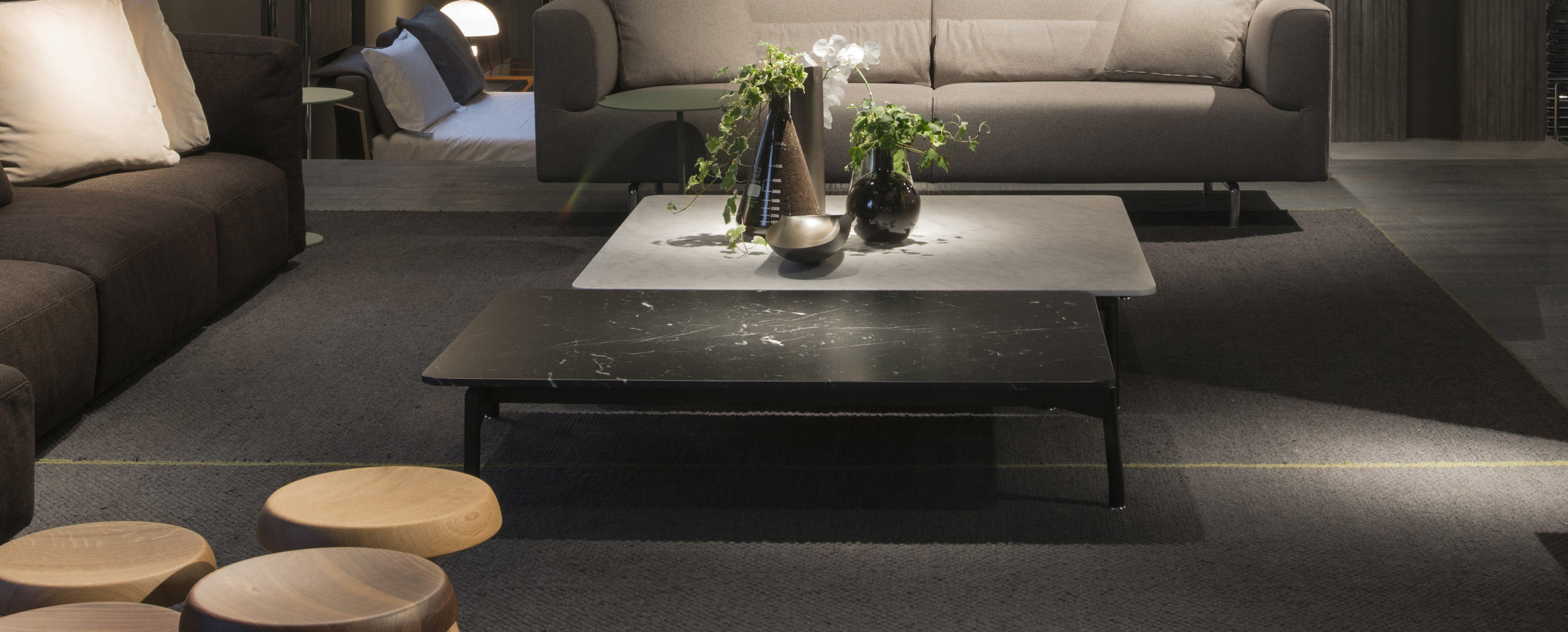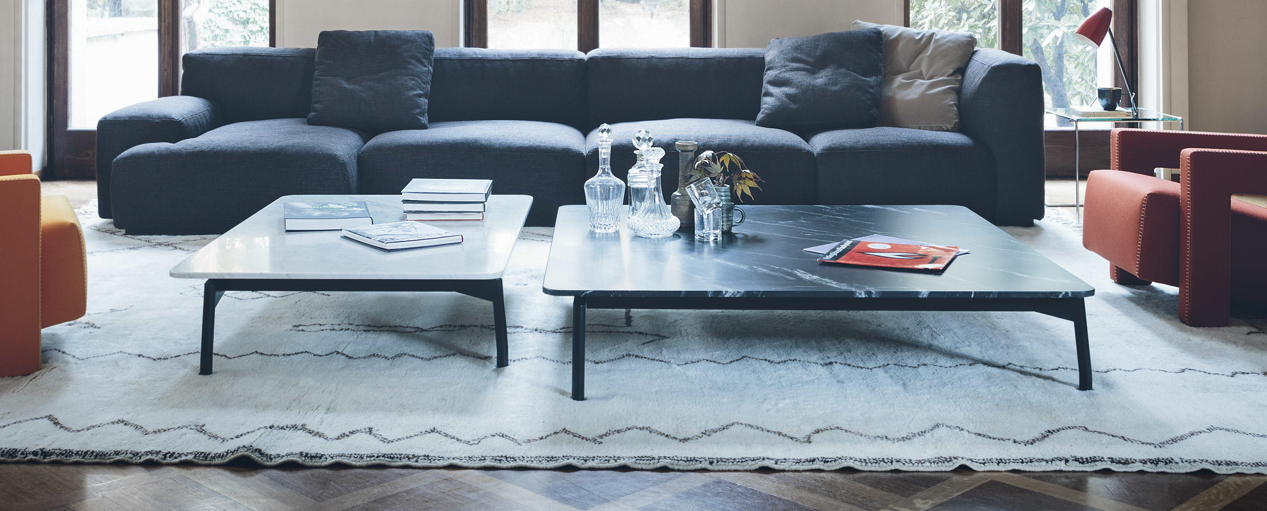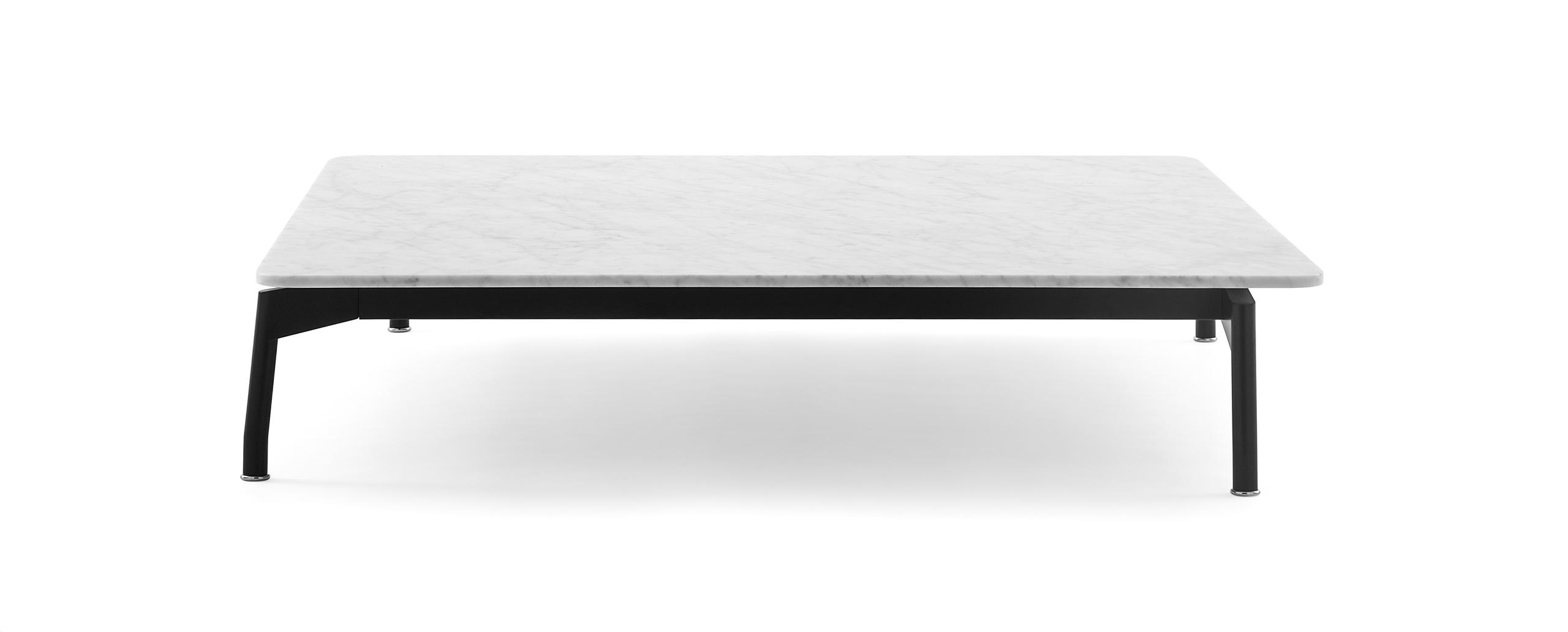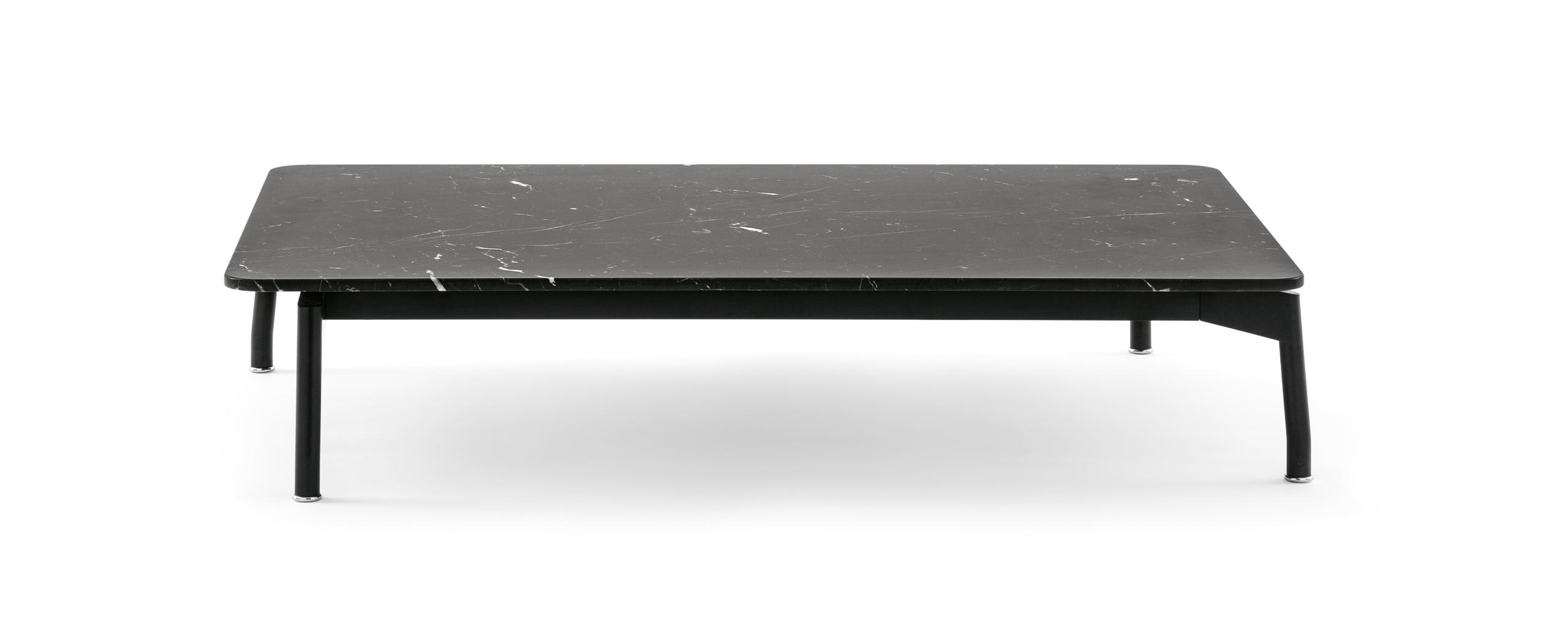 Square or rectangular coee tables with frame in black painted steel and feet in black painted die-cast aluminium, tops available in mat white Carrara marble or mat black Marquiña marble.