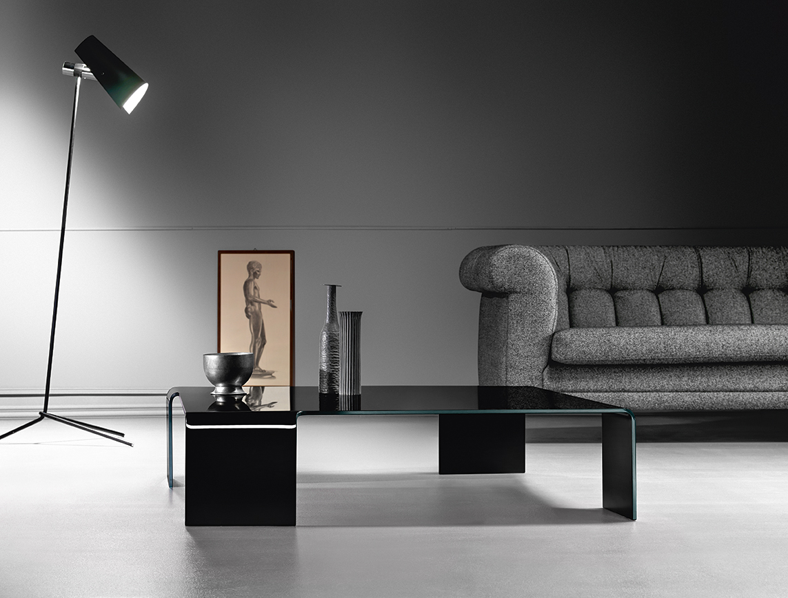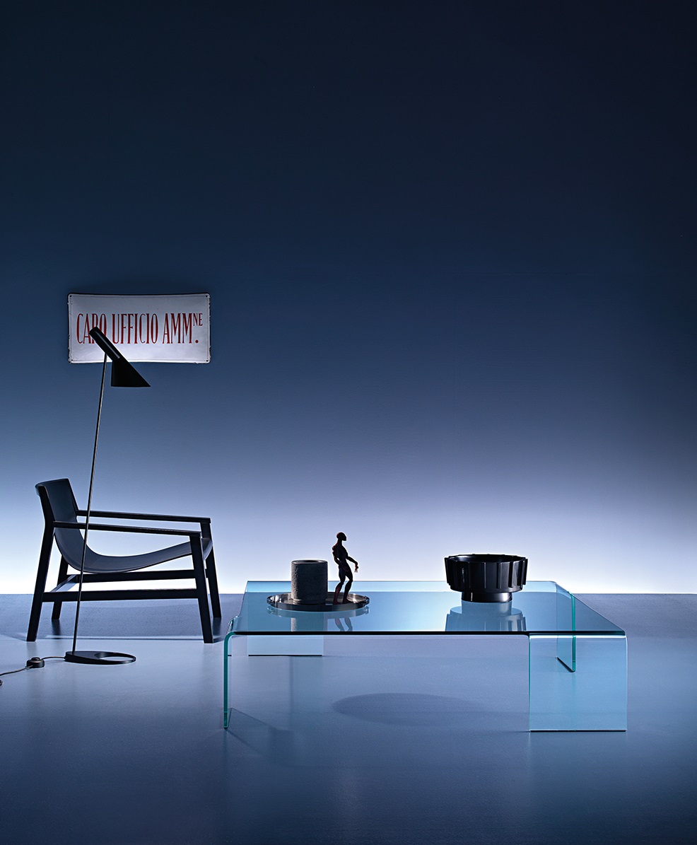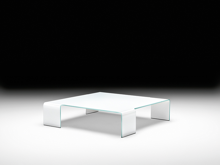 Monolithic coffee table in 12 mm-thick curved glass. On demand also available in extralight glass, extralight white back-stained glass and in black back-stained glass.