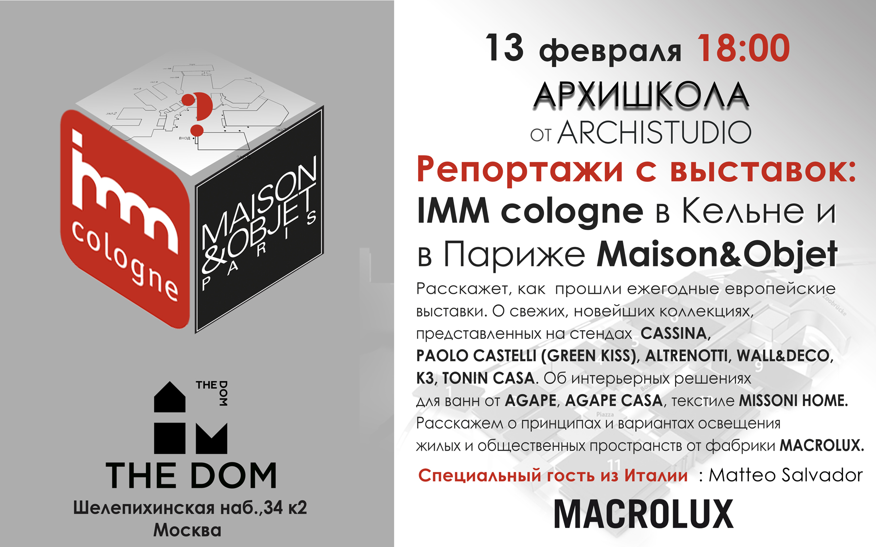 13 февраля в 18:00 АРХИШКОЛА от ARCHISTUDIO в THE DOM по адресу Шелепихинская наб, 34к2, посвященная выставкам IMM Cologne 2020 в Кёльне и Maison & Objet 2020 в Париже.