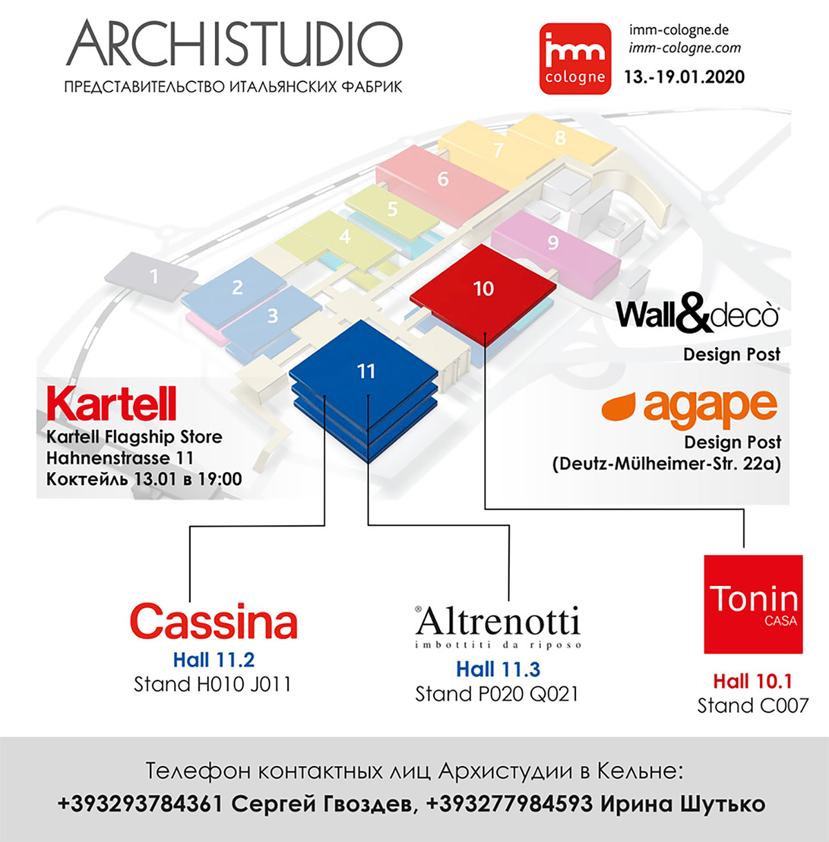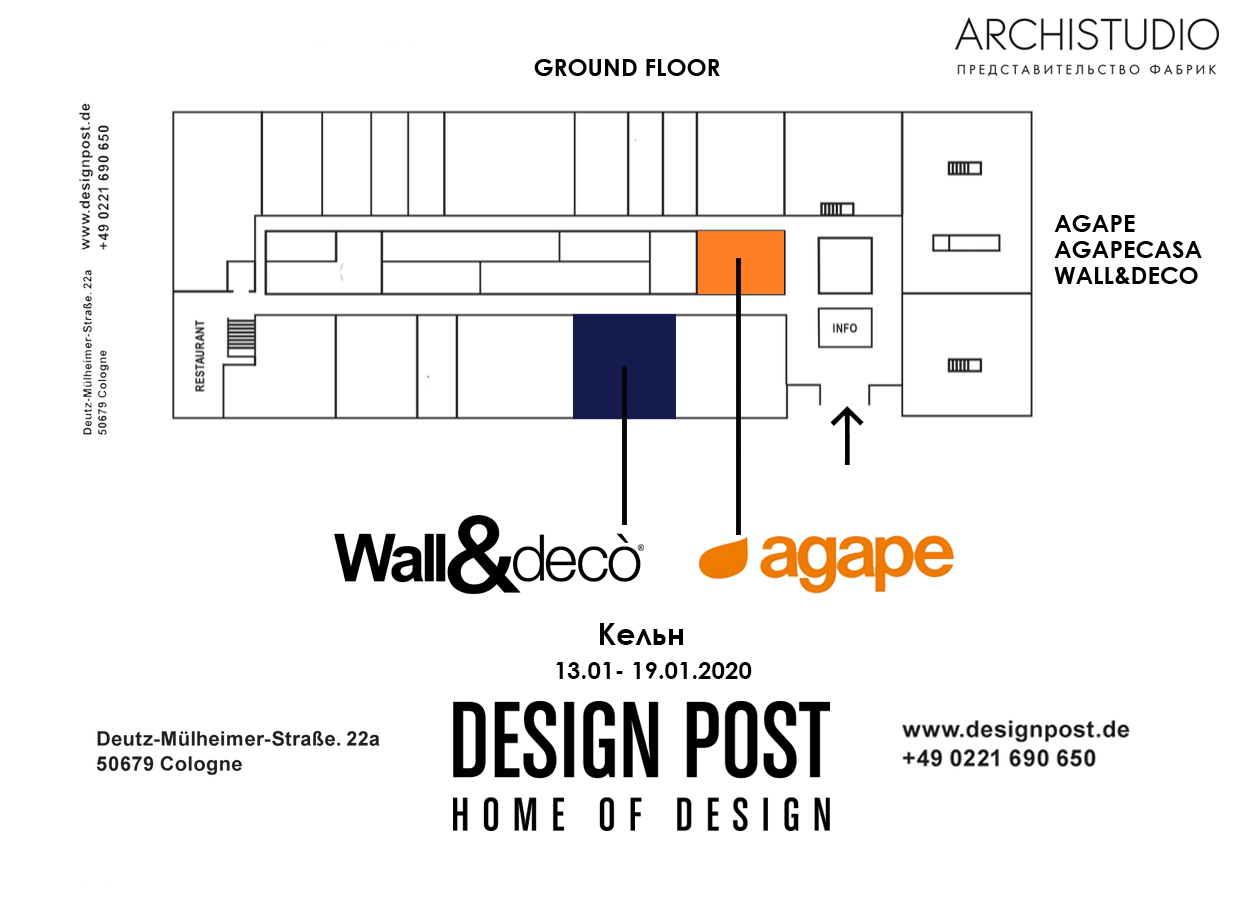 Экспозиции Agape, Agapecasa и Wall&Decò в выставочном пространстве Design Post по адресу Deutz-Mülheimer-Str., 22a. Для тех, кто выходит с выставки IMM Cologne, через дорогу сразу напротив выхода Est.