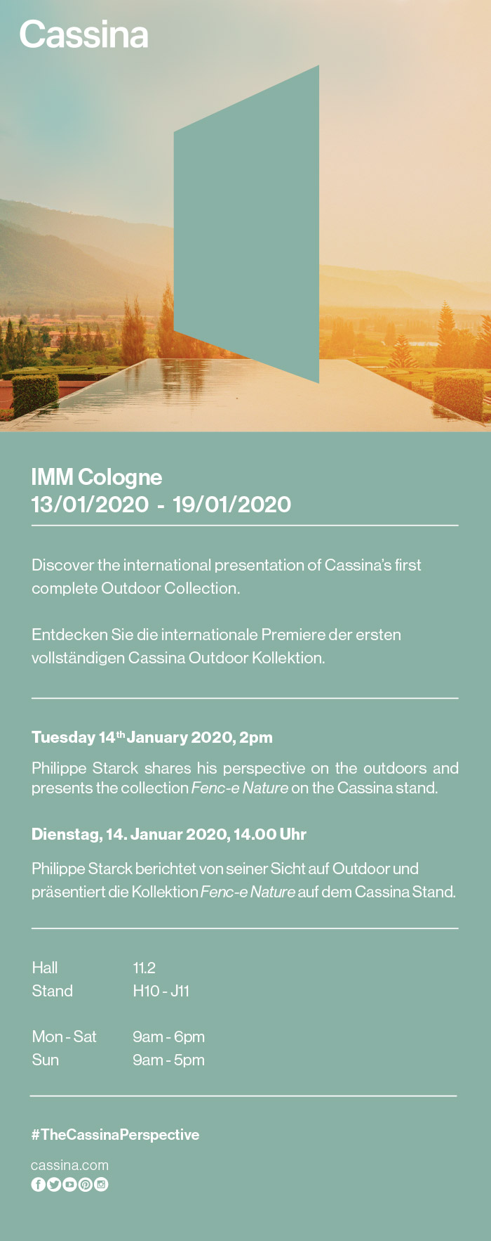 14 января в 14:00 на стенде Cassina не пропустите презентацию коллекции outdoor Филиппа Старка. Это первая полноценная коллекция уличной мебели фабрики Cassina. Филипп Старк поделится своим видением концепции outdoor и лично представит коллекцию Fenc-e Nature.