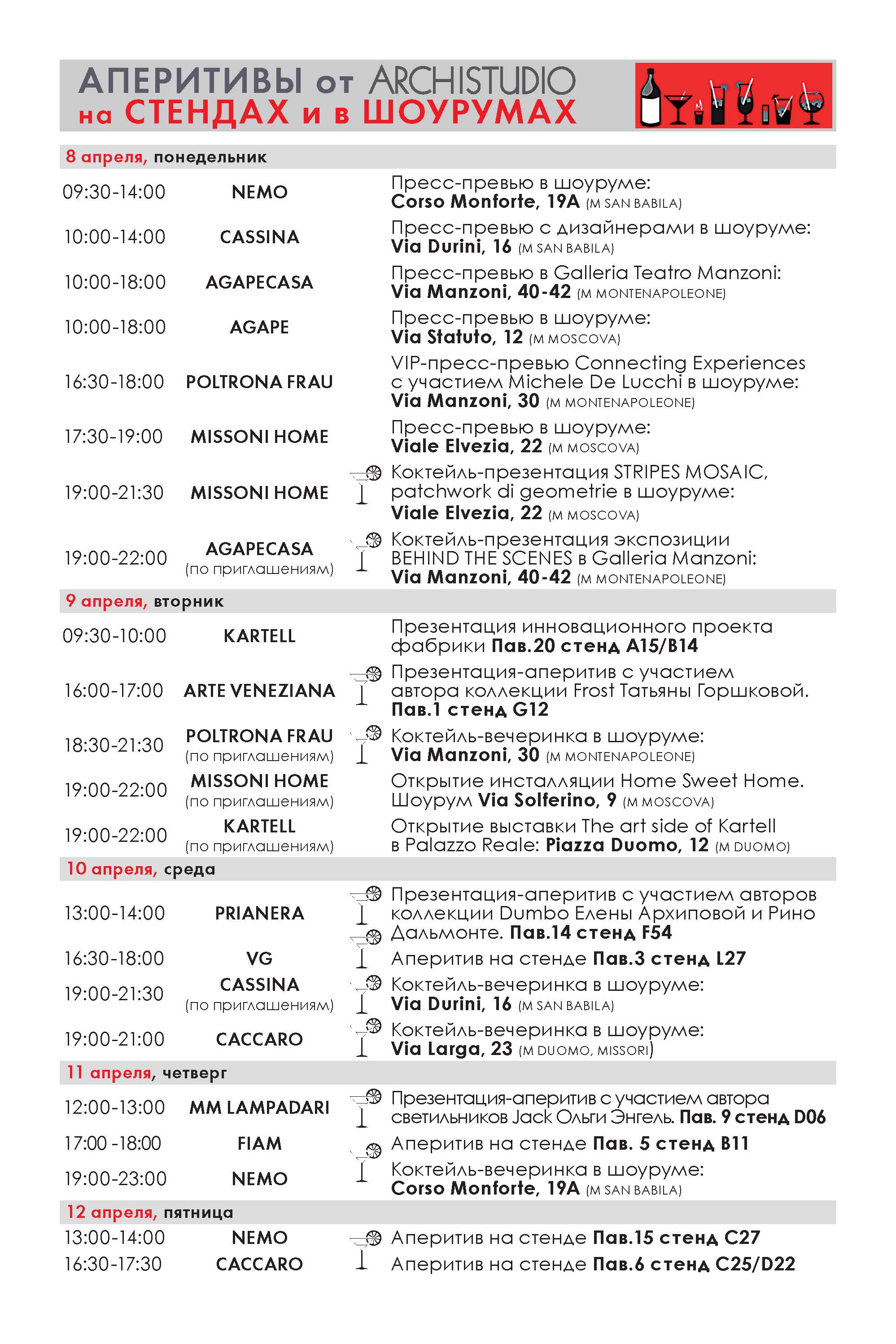 9 апреля в Милане откроют свои двери Salone del Mobile и Euroluce. По традиции помимо основных экспозиций в выставочном центре Rho Fiera ценителей дизайна ждут показы, вечеринки, коктейли в шоурумах и на других площадках в центре города. Программа уже готова. Ждём вас!