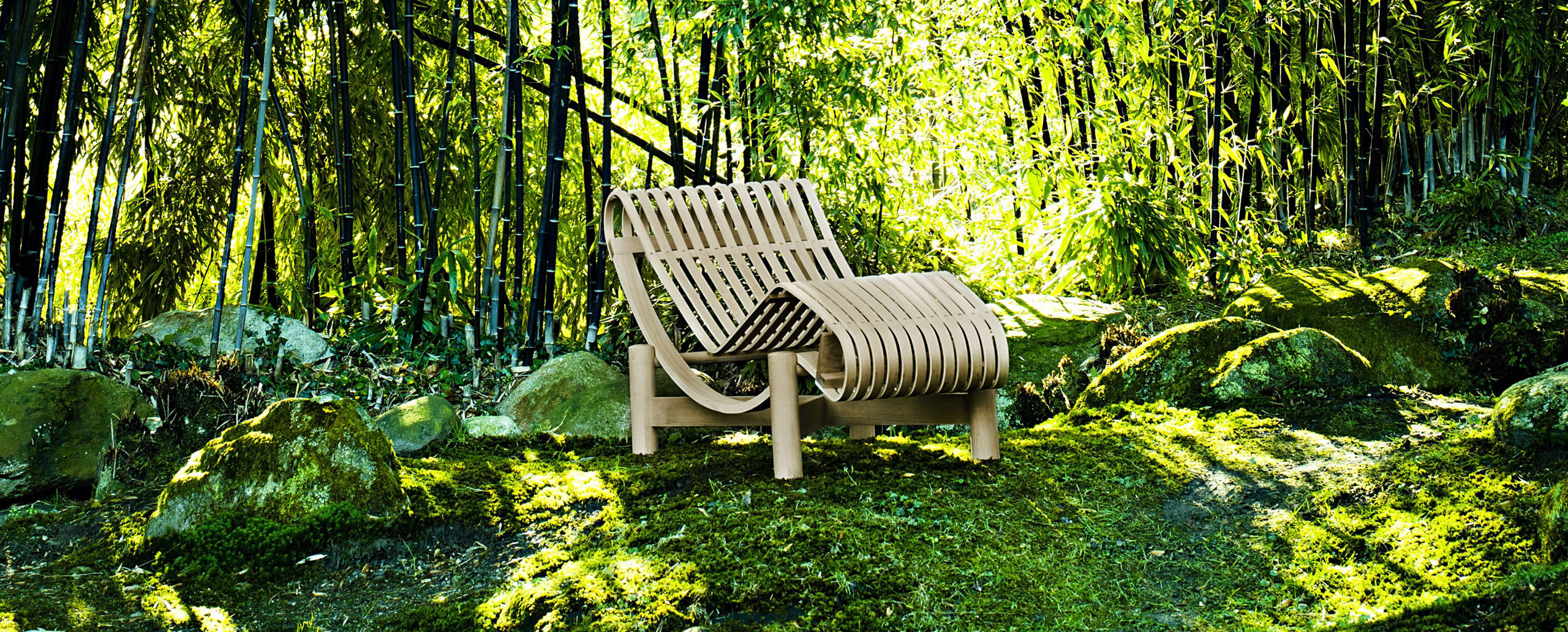 The seat of this chaise longue is composed of 12 curved wooden strips (teak or bamboo). The joining elements connecting the strips to the bars below are satin brass studs. The base is in solid wood (teak or bamboo).The mattress comes with waterdraining polyurethane upholstery and stain resistant polyester yarn coated in PVC treated with an exclusive formulation, called Glen Raven, guaranteed totally mould resistant and ISO 9001 certified. Available in different colours. Each chaise longue comes with a protective waterproof cover for the winter season. This model should not be exposed to rain or prolonged humidity.