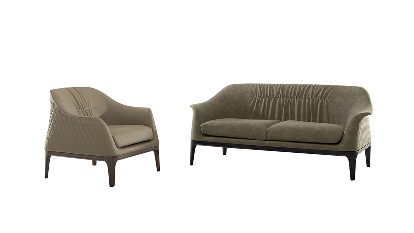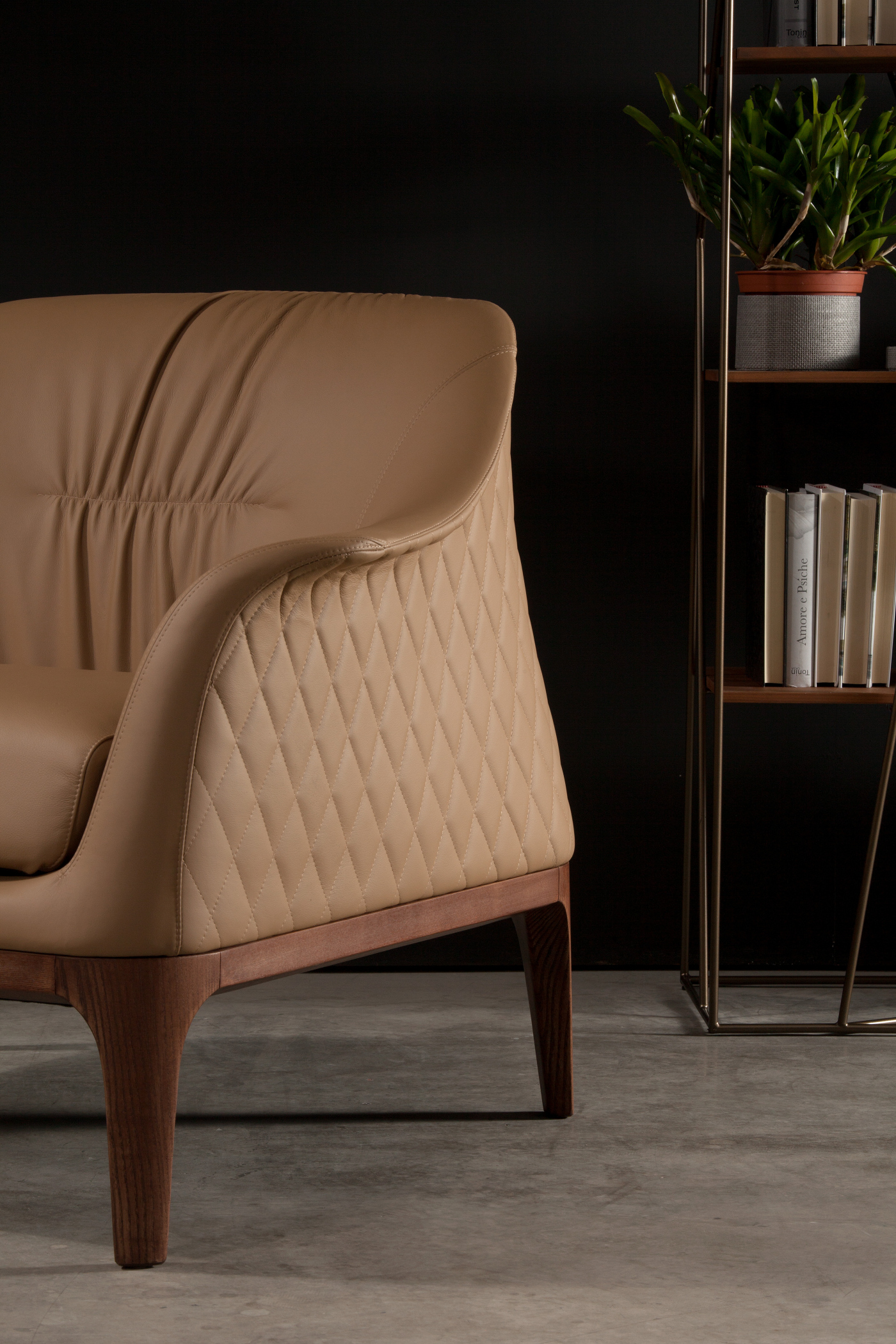 Tiffany is an armchair, or a sofa, inspired by a soft and delicate luxury: the ash tree - with a Canaletto walnut, dark oak, or natural oak finishing - quietly marries the leather, or eco-leather covering. A quilted covering, representation of the best Made in Italy manufacture, covers Tiffany, and combines two technically different worlds, resulting in a uniquely gracious product.