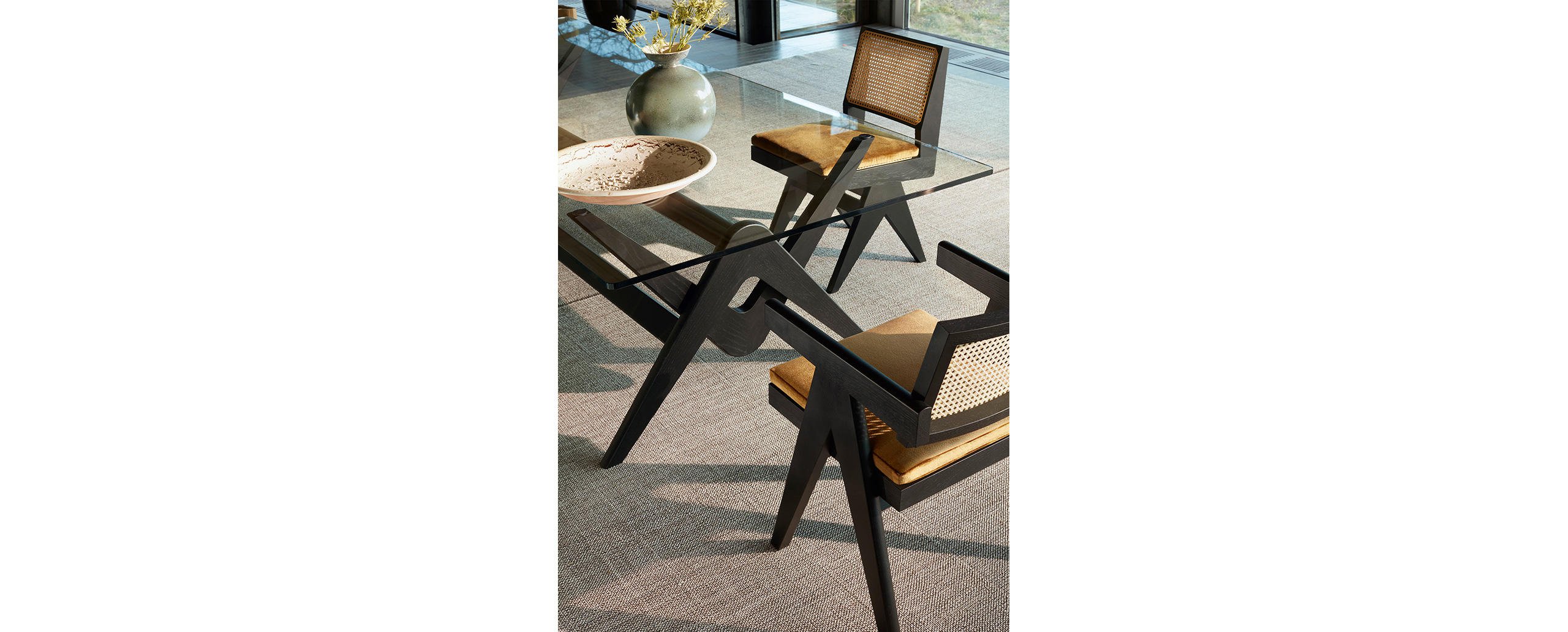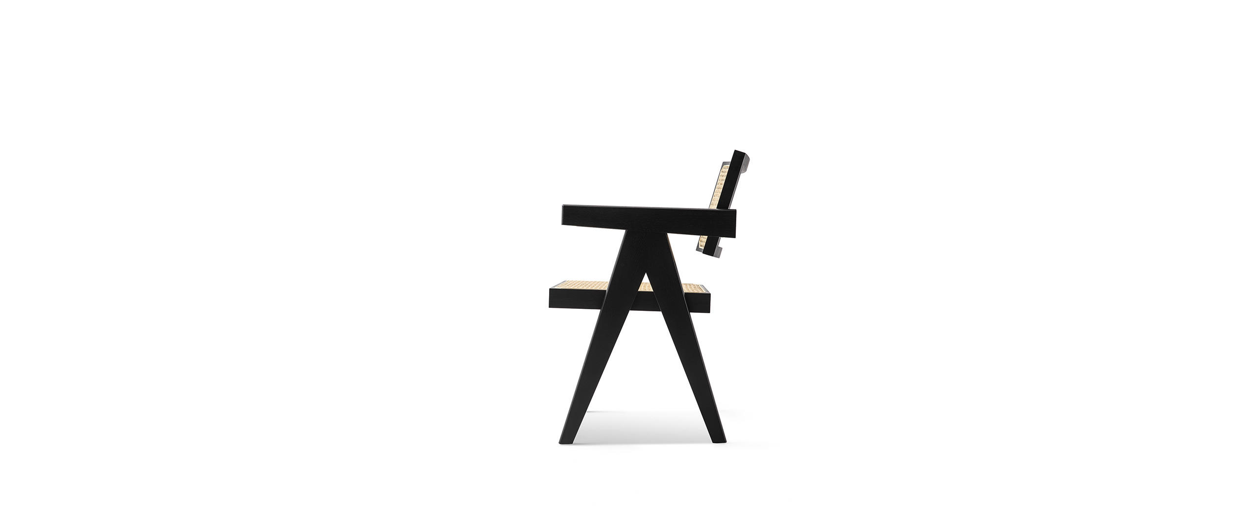 Hommage à Pierre Jeanneret. This chair is one of the most recognisable in Chandigarh’s Capitol Complex, found throughout the offices of the Secretariat. The independent pieces, including the side bars in an inverted “V” supporting the armrests, are all made of solid wood. The woven backrest and seat, stretched across a wooden frame, are elements common in the area, much like the use of local woods like teak. Similar to the better-known office chair, this armless chair also uses the “V” approach to sidebars, in this case shorter as they do not extend to the arms. Importance, instead, is given to the seating/ backrest sequence in Viennese woven cane, connected with an immense geometric section supported by two wooden profiles, and coplanar legs, that together, are simple and yet, powerful at the same time. Cassina’s reissue offers the classic version in teak, and two versions in natural and stained black oak.