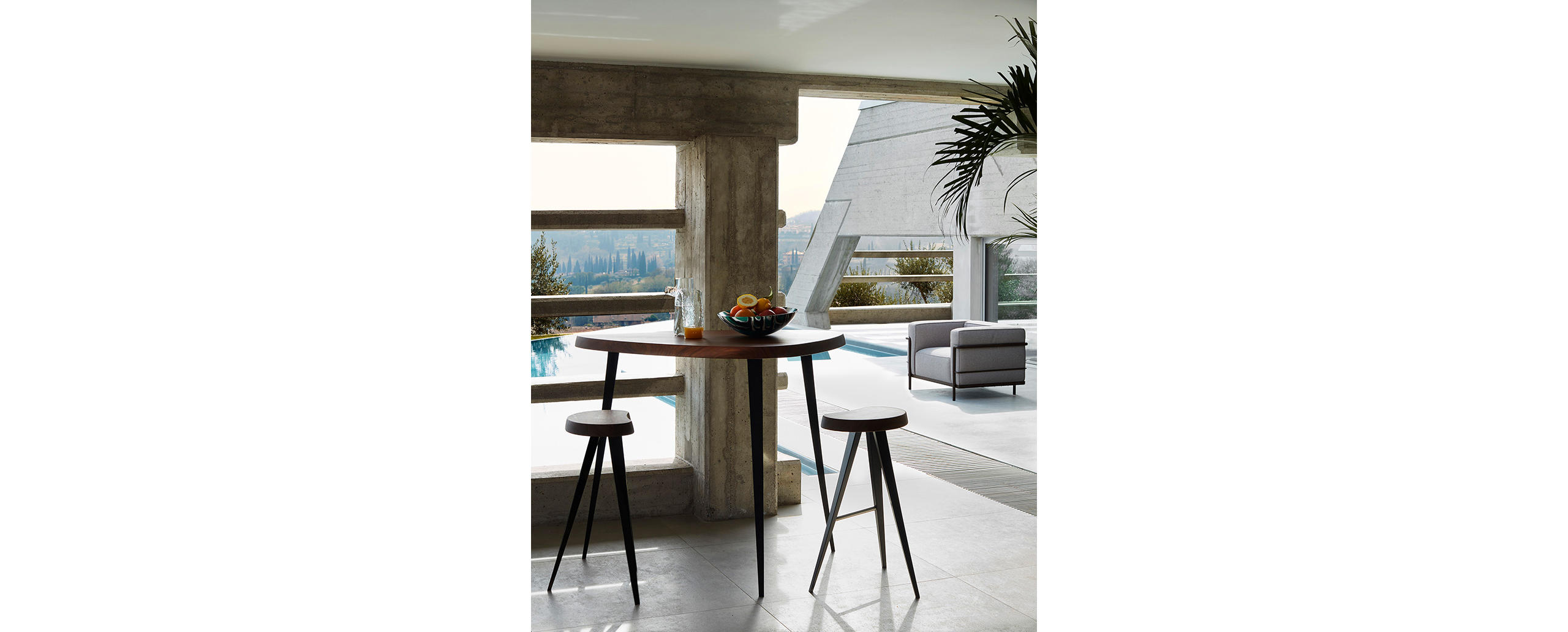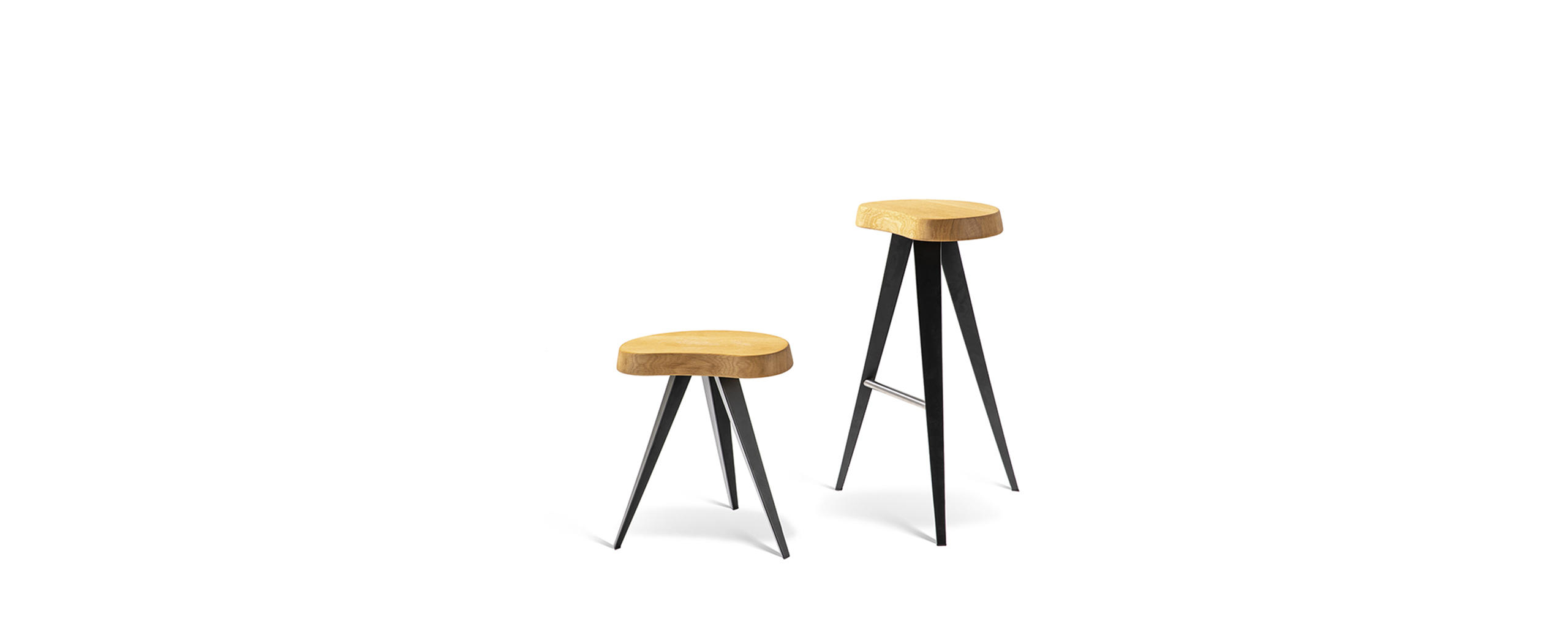 In addition to the new table versions (dining, two new low table heights and a bar version), the Mexique family is now enlarging with the introduction of two new stools available in two different heights, 45 cm. and 72 cm. The “en forme libre” seating, in solid wood, is highlighted by the lightness of the geometric frame of the legs. The product is suitable for residential and contract use.