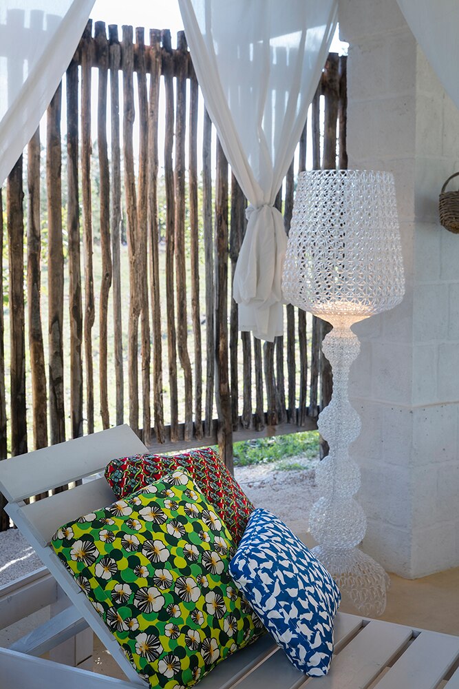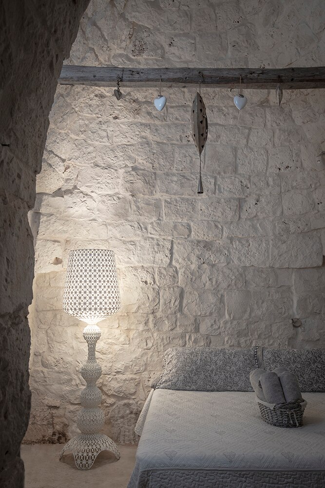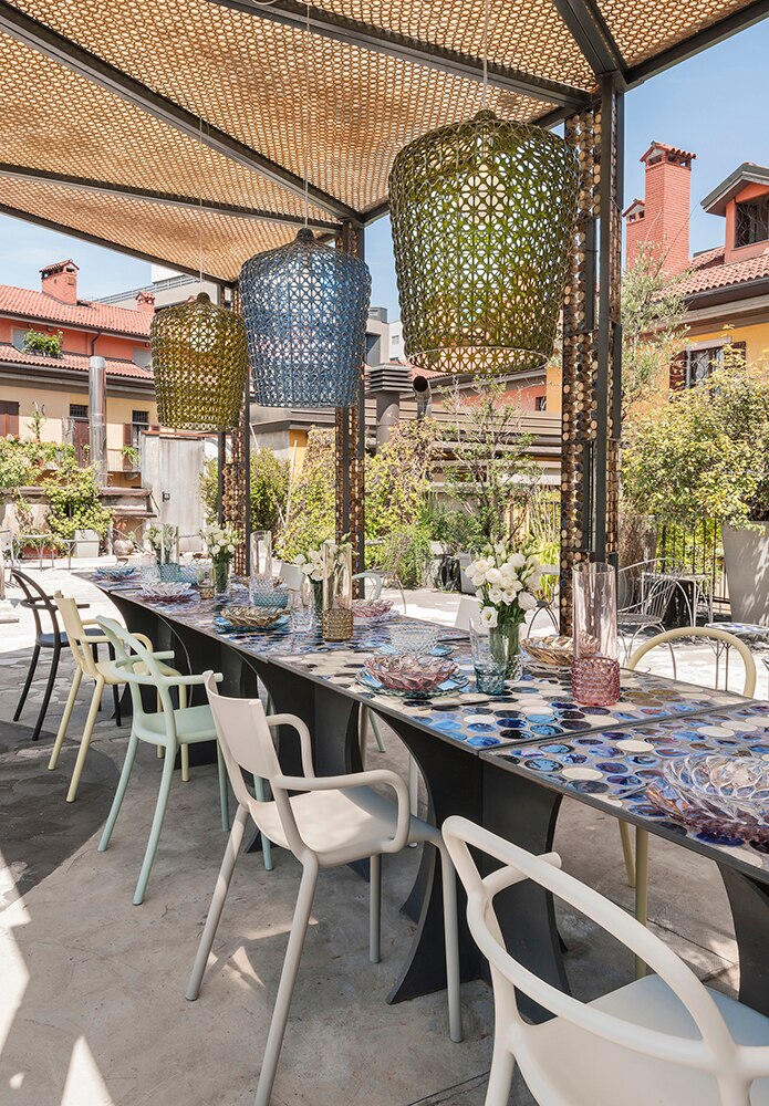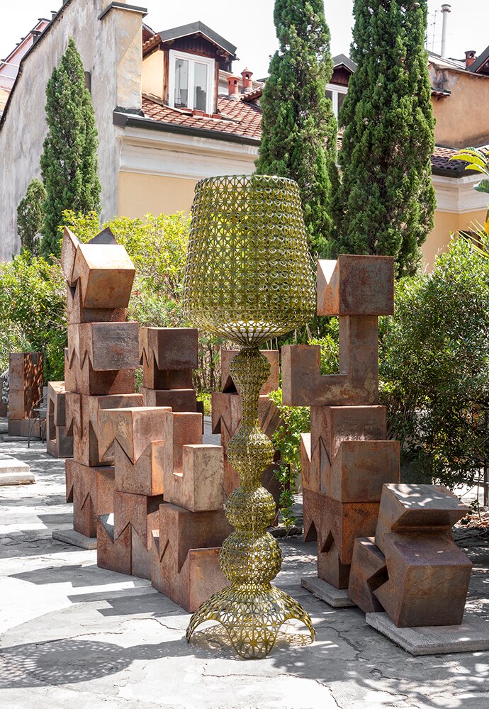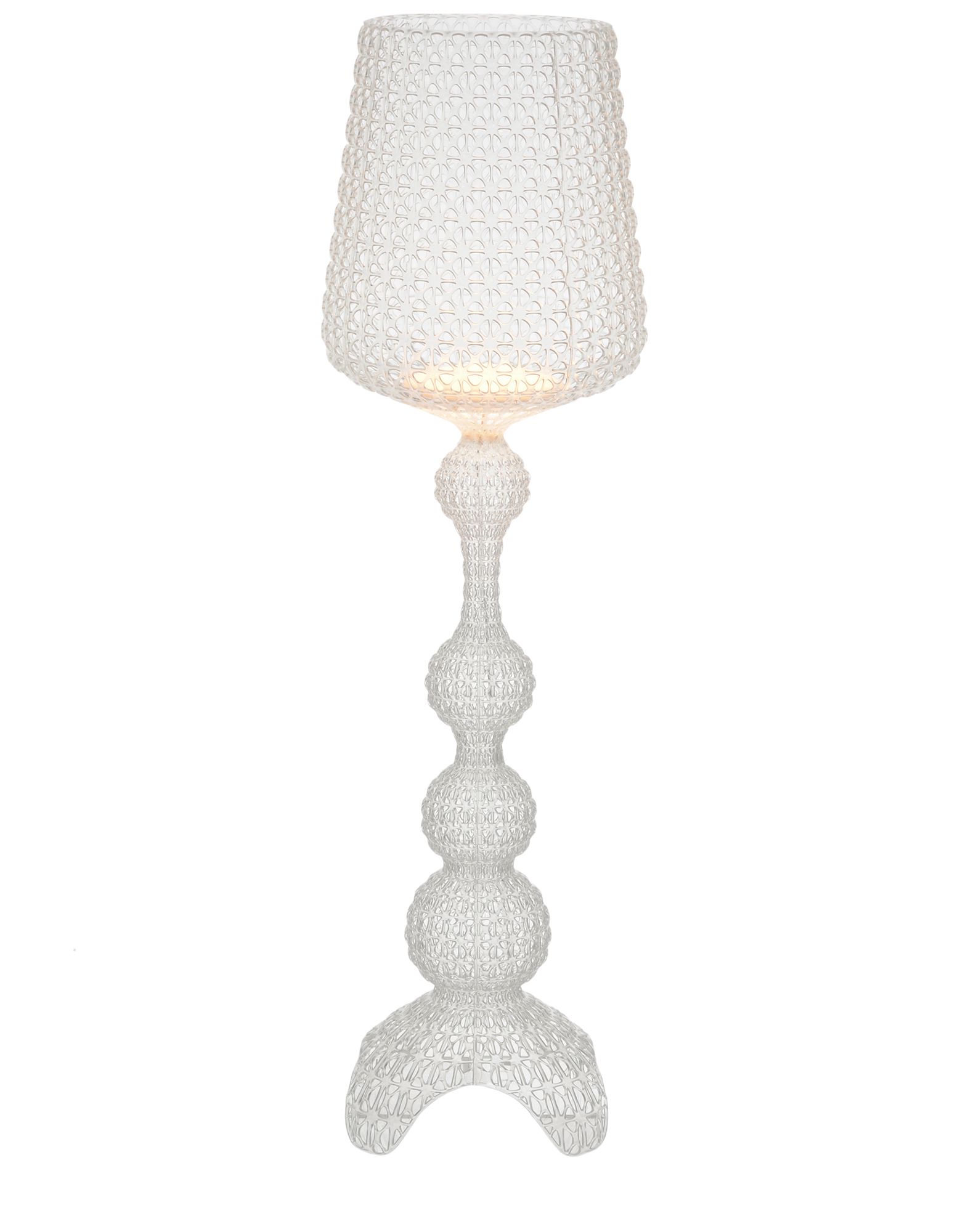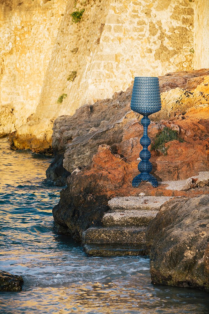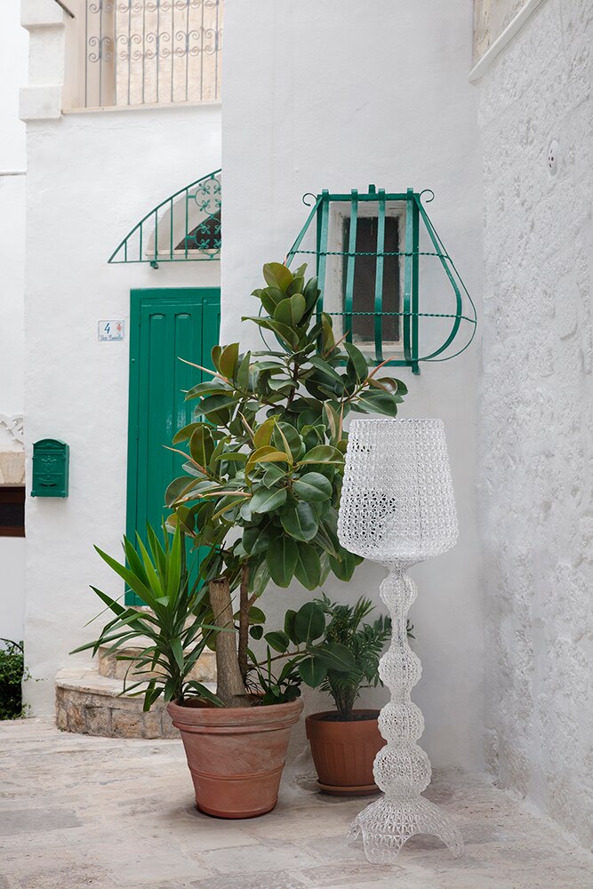 Торшер Kabuki отлитый под давлением. Используемая технология позволяет создать тканую структуру, похожую на кружево, с уникальной перфорированной поверхностью, через которую рассеивается свет. Доступный в наружной и внутренней версиях.