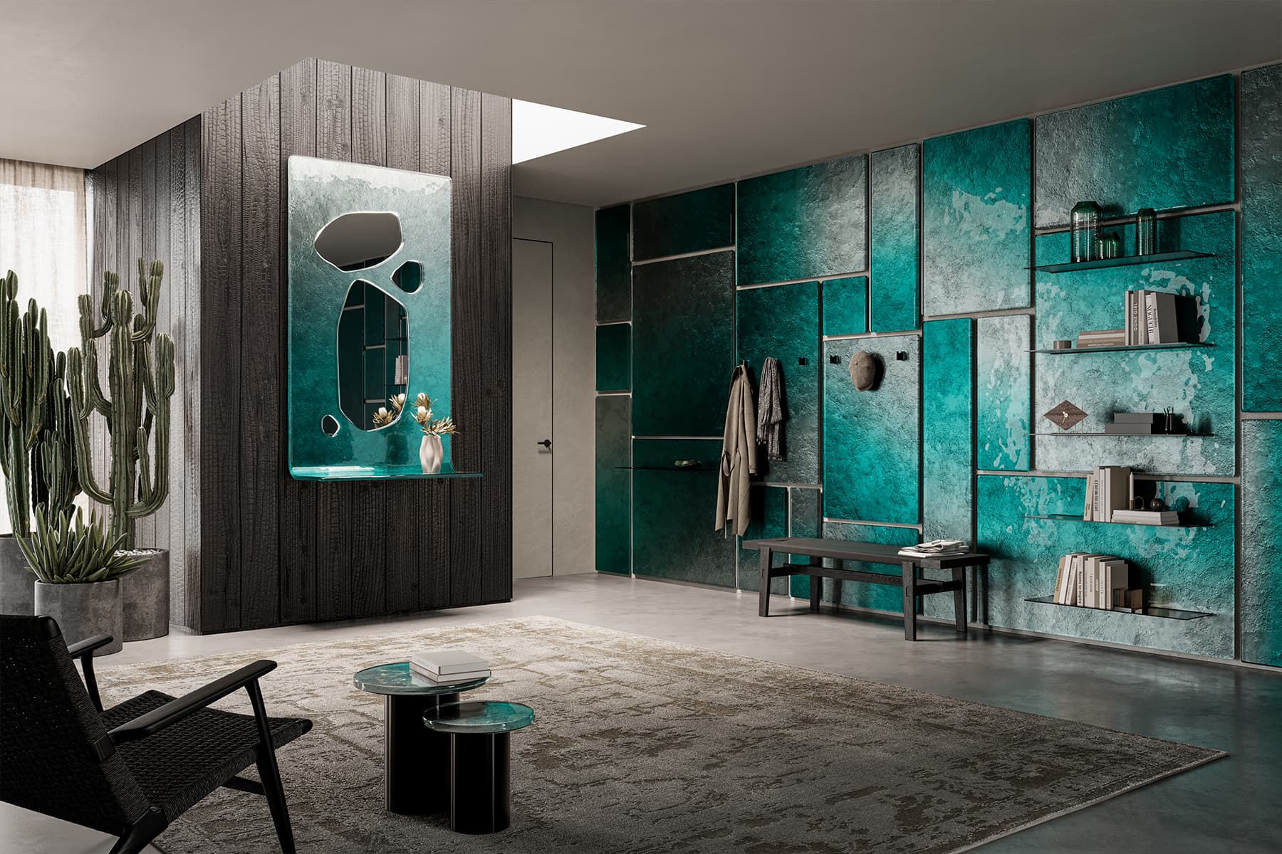 The Melt collection is revamped in terms of finishes and application features. The lagoon spirit is enriched with autumnal colours. Through the use of oxidised silver, the coloured glass acquires shades of twilight, shapeless and iridescent objects come to life.