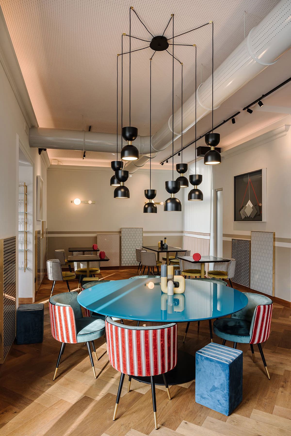 The warm tone of MM LAMPADARI lamps on the refined and sophisticated design of the Il Circolino restaurant of Monza