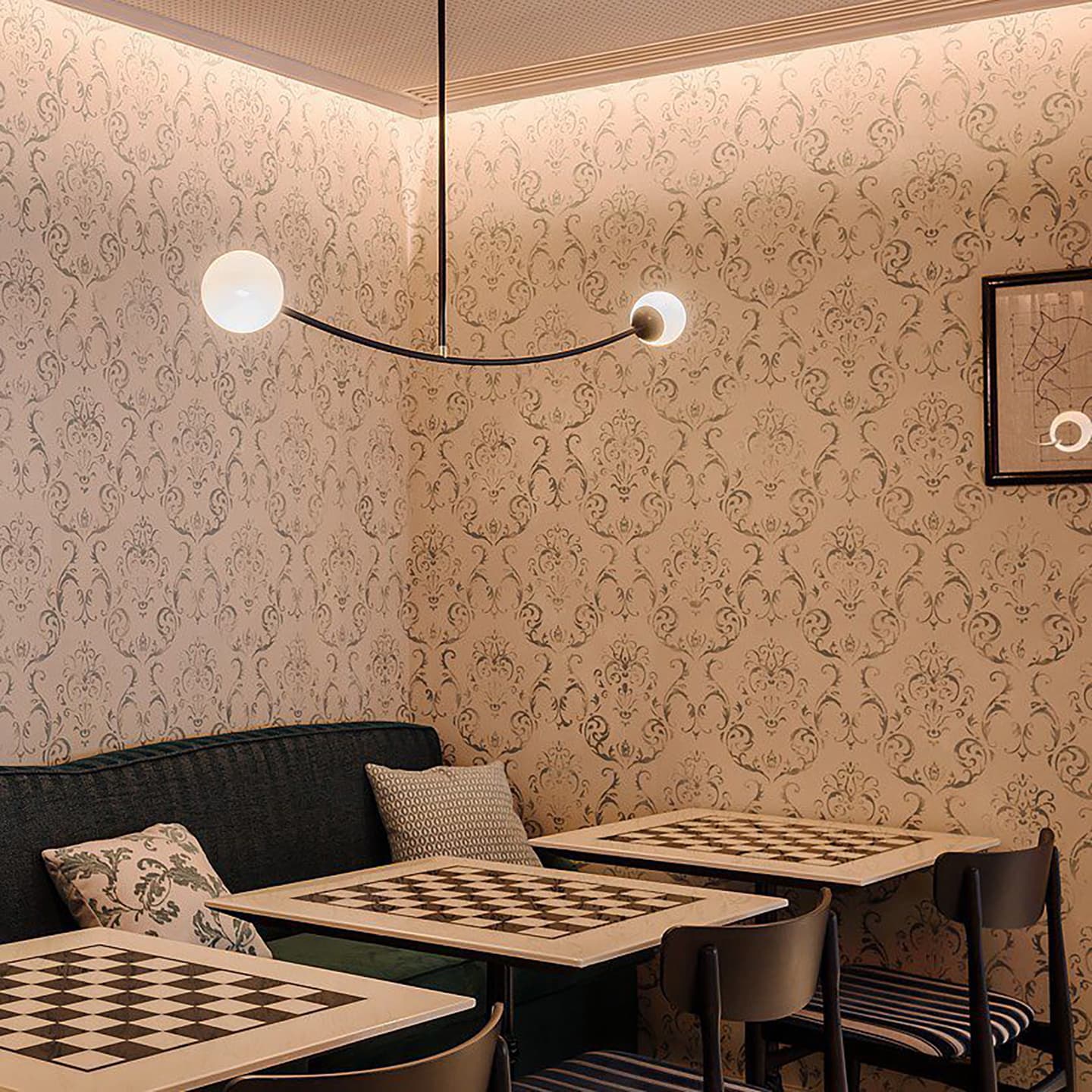 More essential, clean and slender lines typical of Arch lamps instead light up the restaurant bistro, expressing the search for beauty in small details.