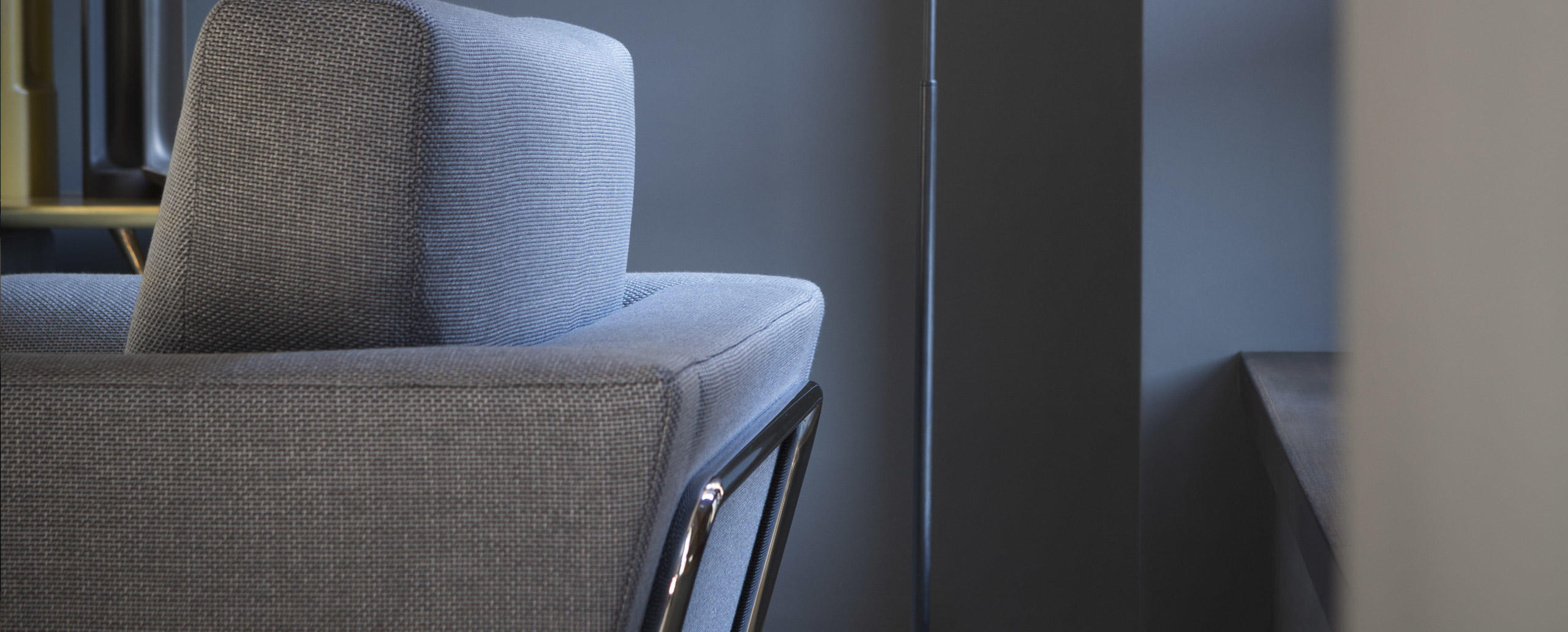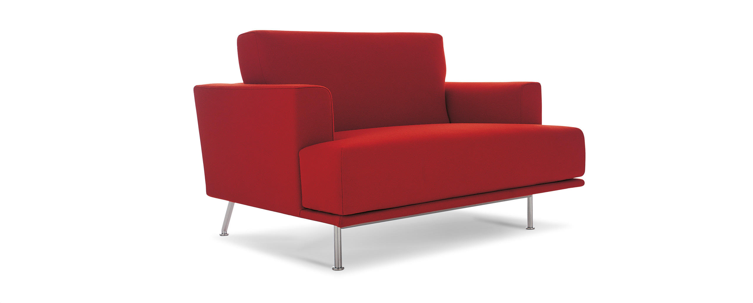 Sofas in three different sizes, love seat, bench and ottoman. Visible frame made of chrome plated or aluminiumgrey lacquered steel and multiplywood internal frame; upholstery in CFCfree polyurethane foam and polyester padding. Large, loose seat and back cushions. Upholstered in either leather or fabric with completely removable covers.