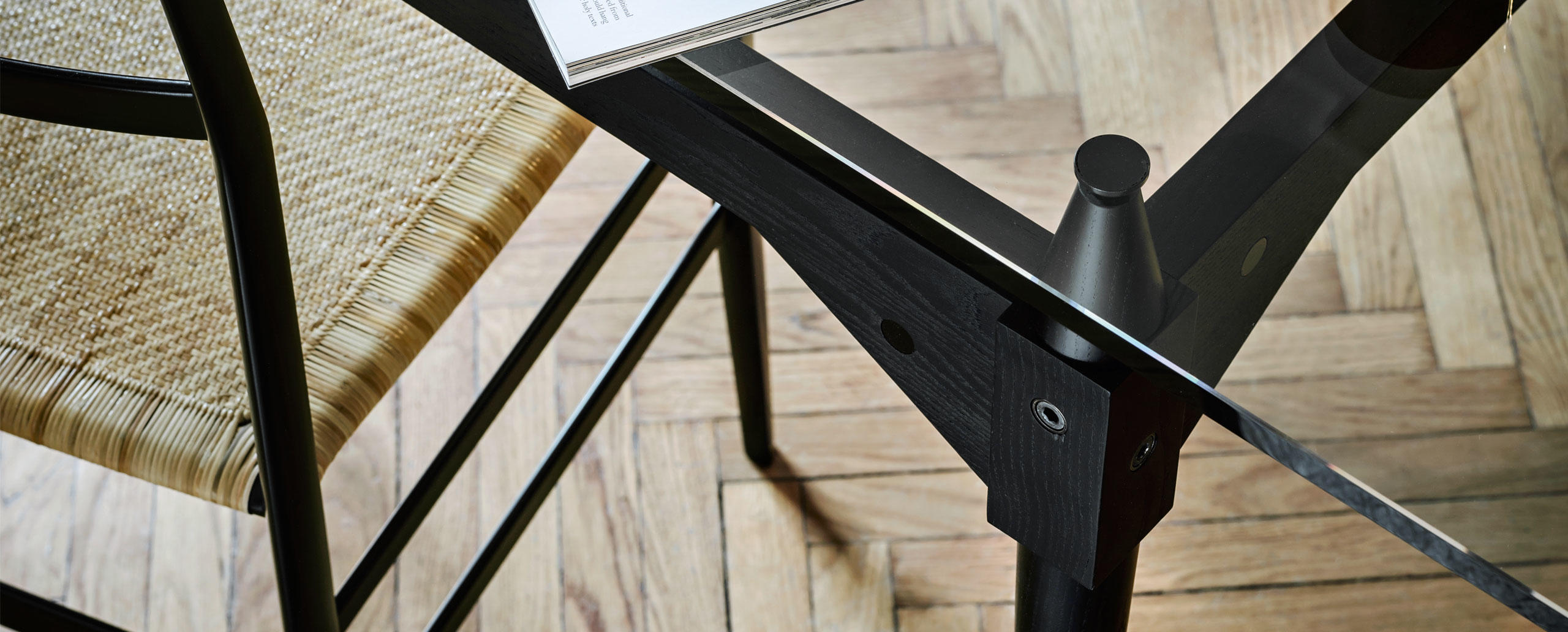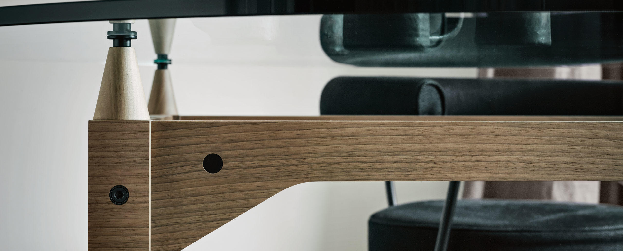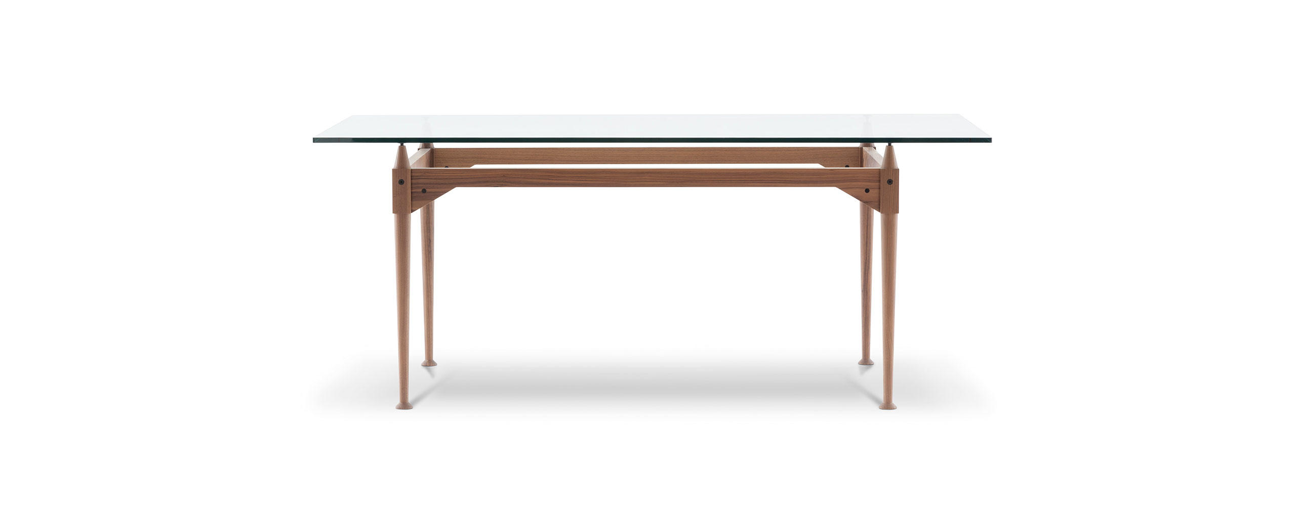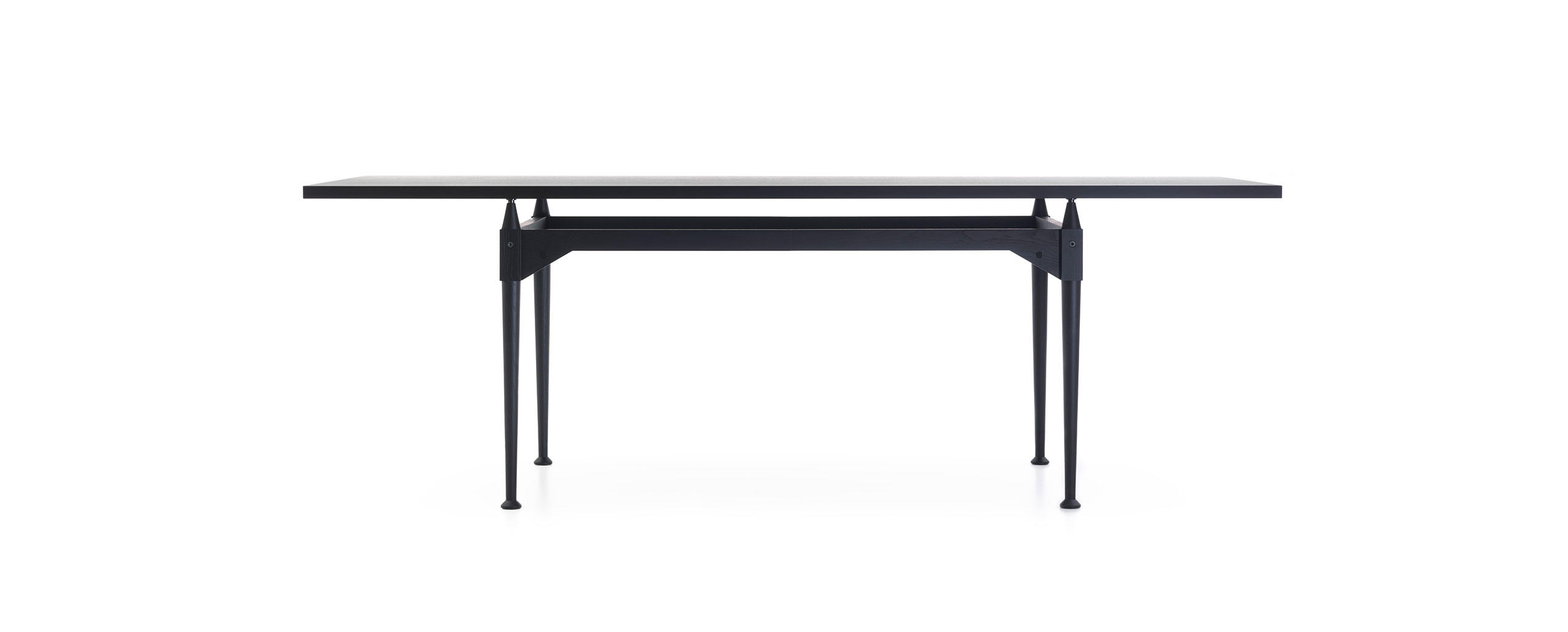 Tables with square or rectangular structures made of four legs and cross-bars assembled with black metal joints available in the finishes: American walnut, natural or black stained ashwood. The table tops are available in the same finishes and in clear glass. A round version Ø 130 cm of the table is also available in clear glass. The feet have felts underneath.