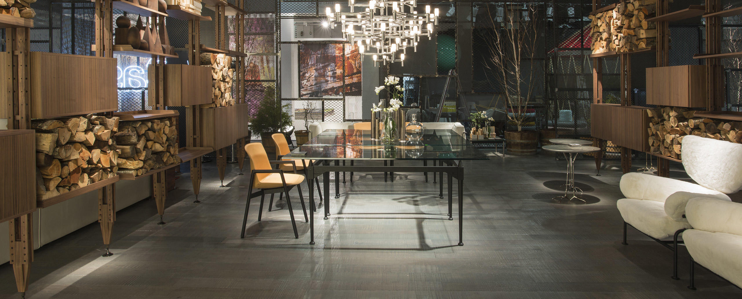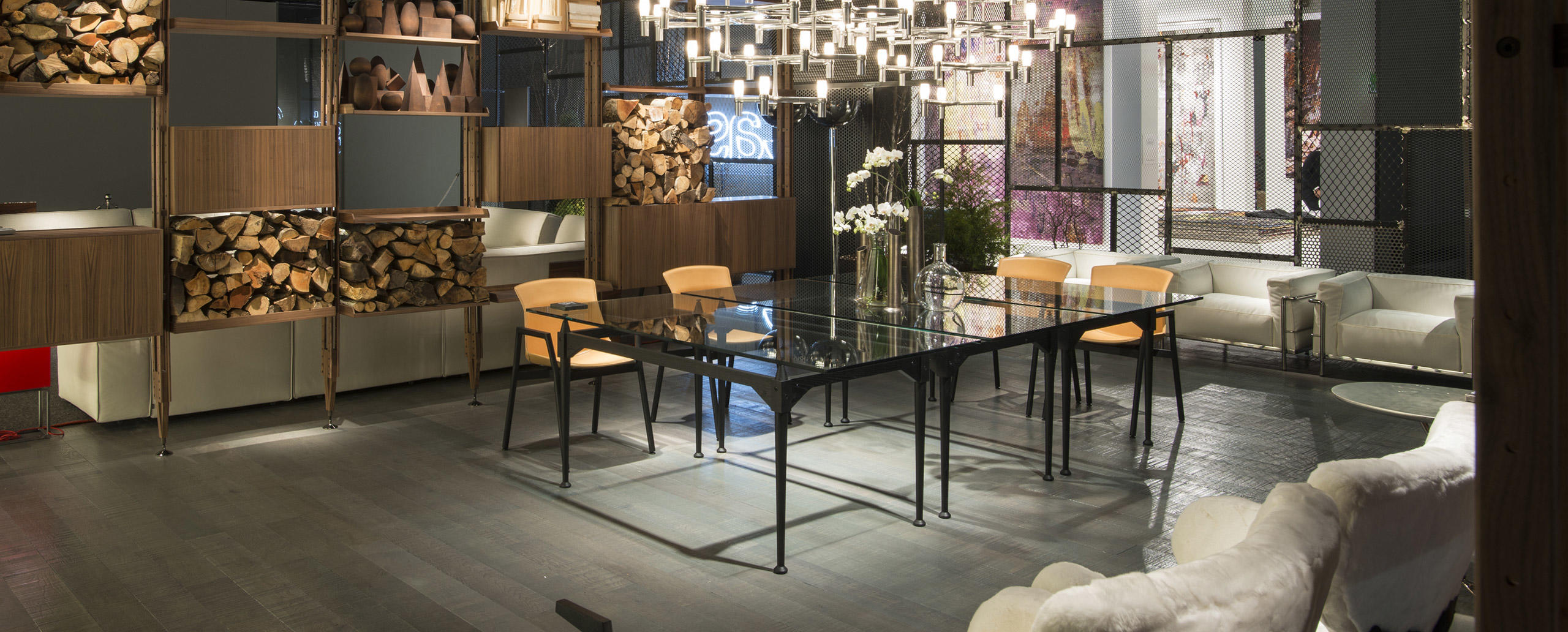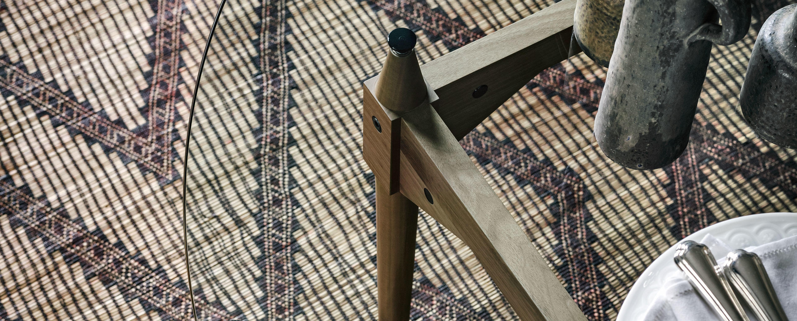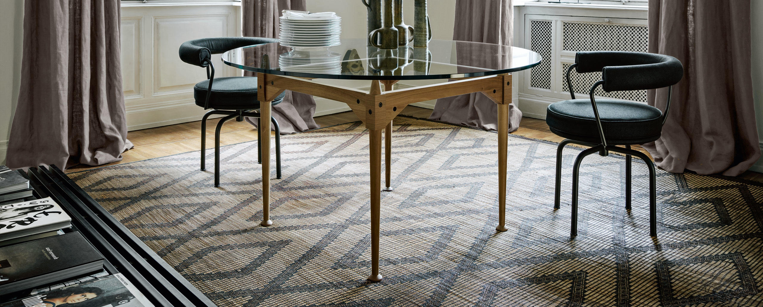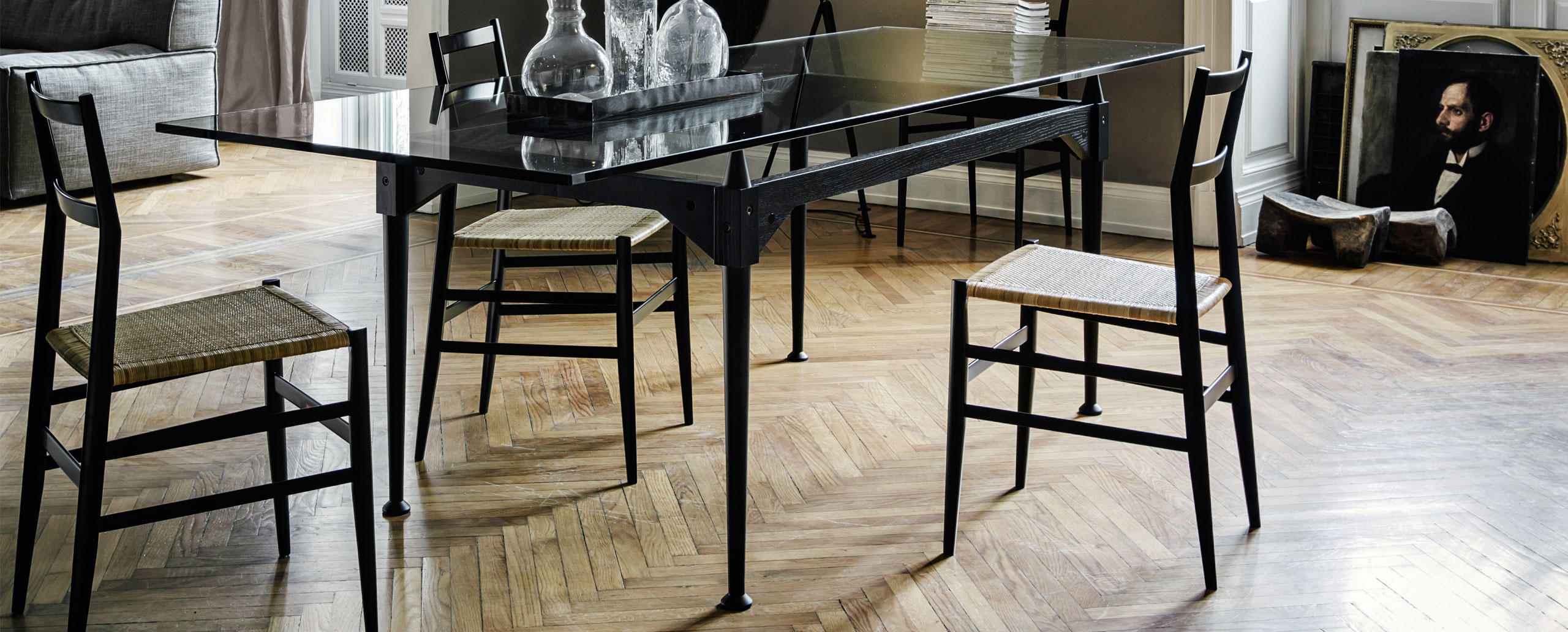 Tables with square or rectangular structures made of four legs and cross-bars assembled with black metal joints available in the finishes: American walnut, natural or black stained ashwood. The table tops are available in the same finishes and in clear glass. A round version Ø 130 cm of the table is also available in clear glass. The feet have felts underneath.