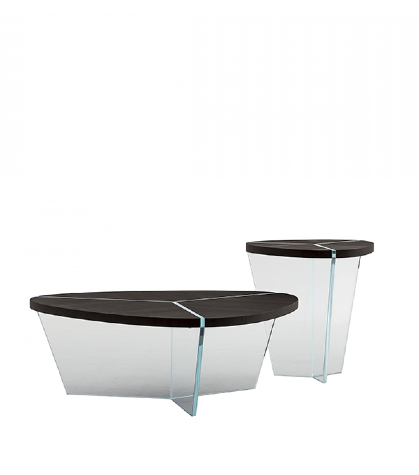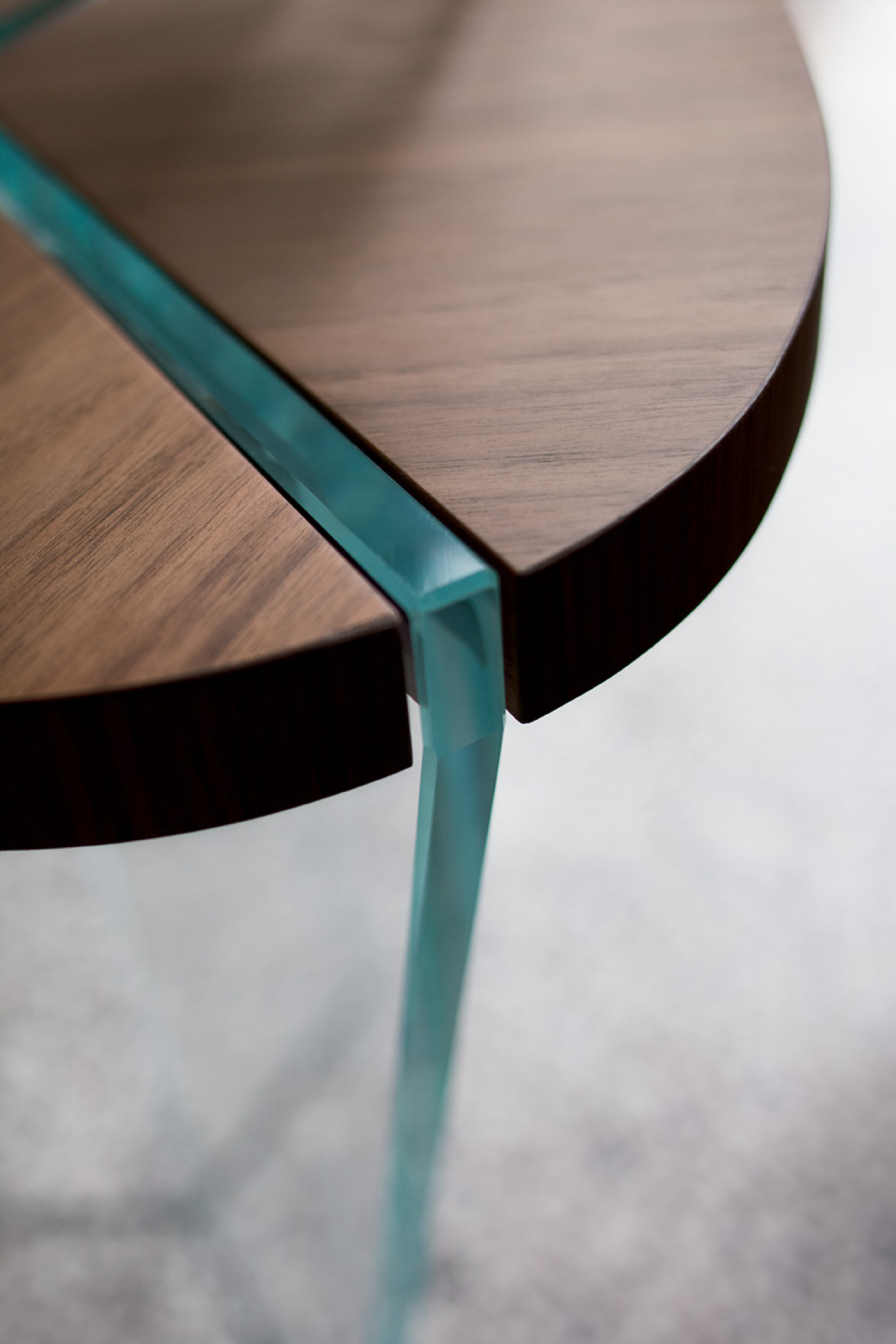 Just like the loves of the famous princess, this Aida is split between two very different elements: a see-through glass base, designed with three firm lines; a round Canaletto walnut, or dark heat-treated oak covered top. A complex manufacture, to harmonize materials and design.